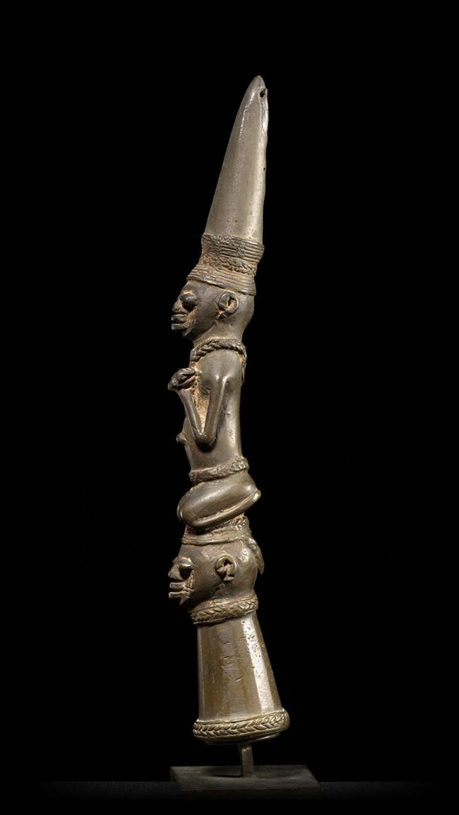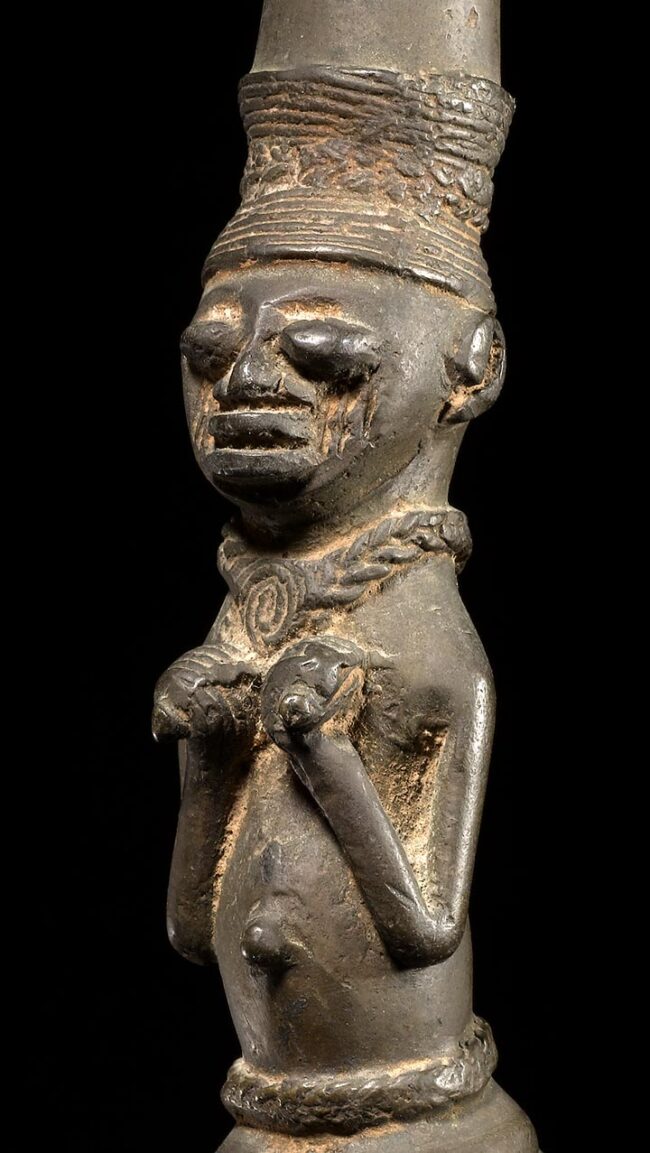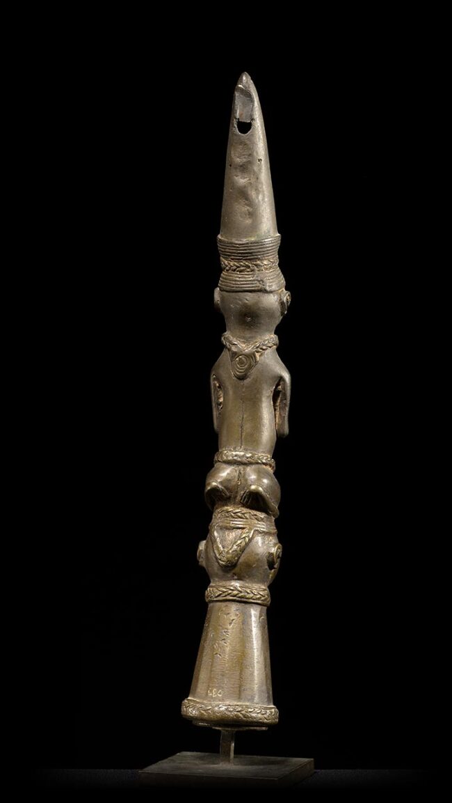 This particular tapper is cast in bronze, a rarity as most divination tappers are typically made of wood or ivory. It features a kneeling woman seated atop a head, her gesture of holding her breasts symbolizing respect and supplication. Incised cross-hatching and straight lines adorn either end of the implement. The surface displays a pleasing patina, with the high points of the sculpture developing a well-worn appearance. On the back of the tapper, there is a faded painted inscription reading “SEC.”
