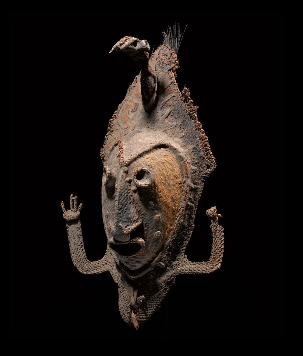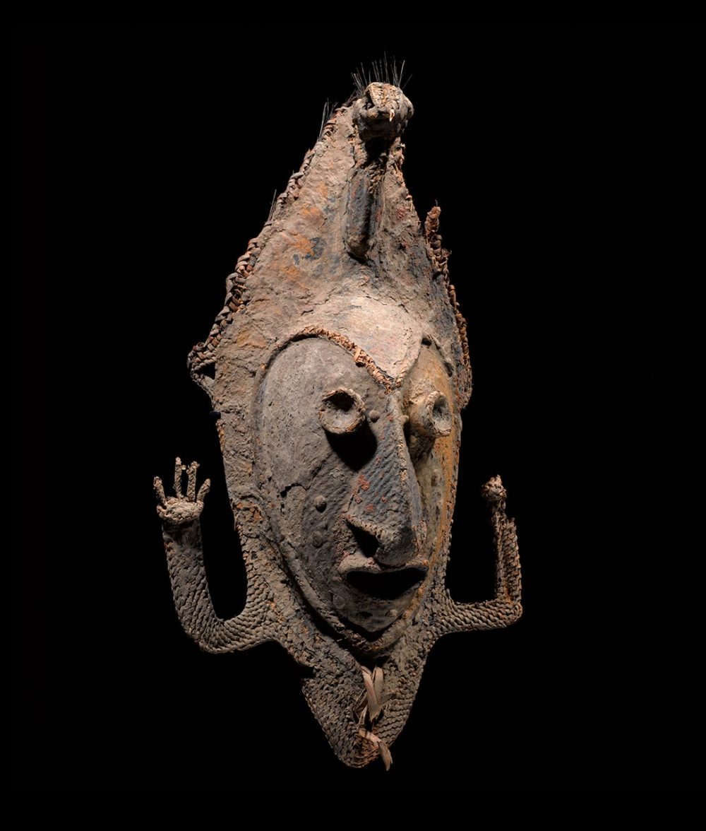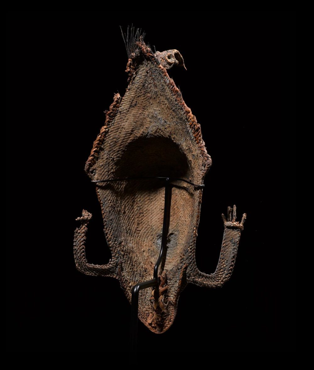 This is a fantastic and very rare example of the type of currency used in the East Sepik Provence mainly for inter village transactions and bride price payments. The mask is made of very finely woven rattan; and its heart shaped face with extended mouth and eyes, are just a few of its distinctive traits. What makes this mask so unique are its raised arms on both sides and the outward projecting bird head on the top of the mask. There are very few known masks with both of these features. The mask also has remains of old pigments.