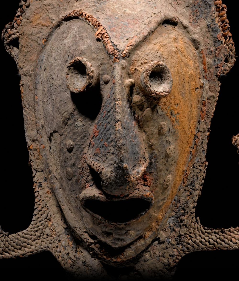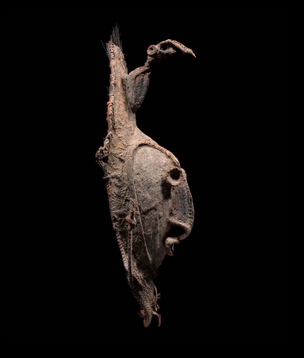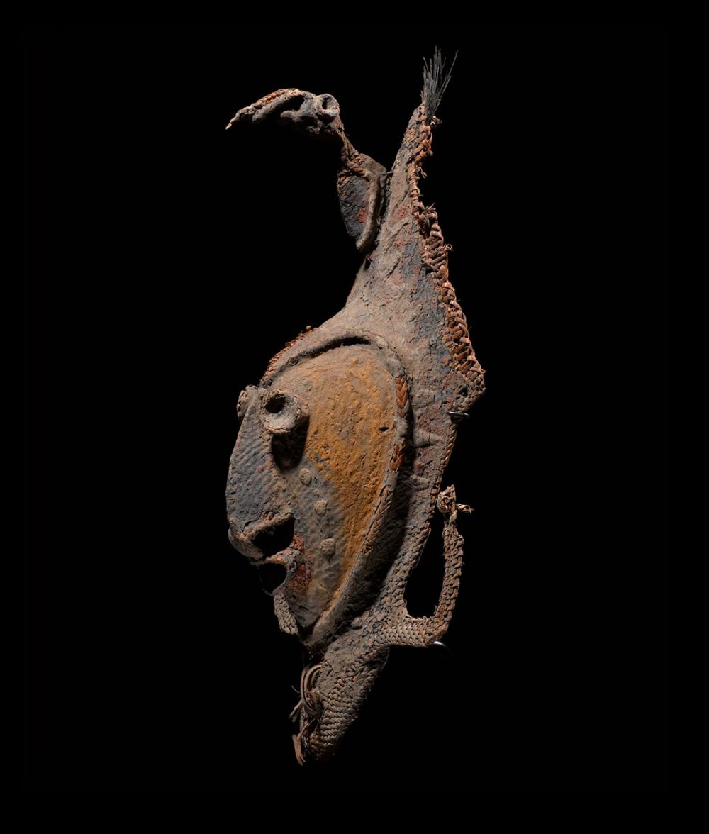 This is a fantastic and very rare example of the type of currency used in the East Sepik Provence mainly for inter village transactions and bride price payments. The mask is made of very finely woven rattan; and its heart shaped face with extended mouth and eyes, are just a few of its distinctive traits. What makes this mask so unique are its raised arms on both sides and the outward projecting bird head on the top of the mask. There are very few known masks with both of these features. The mask also has remains of old pigments.