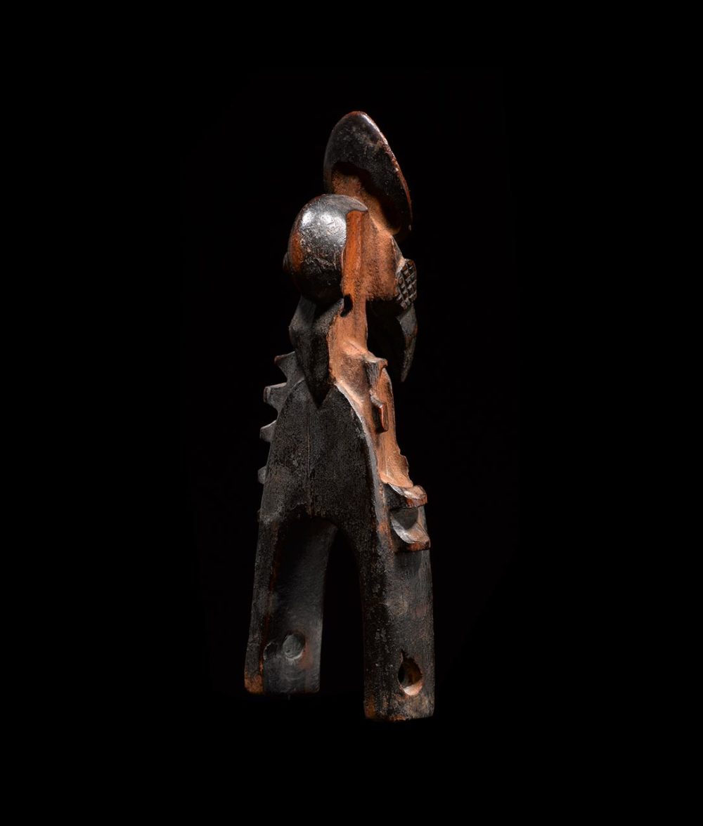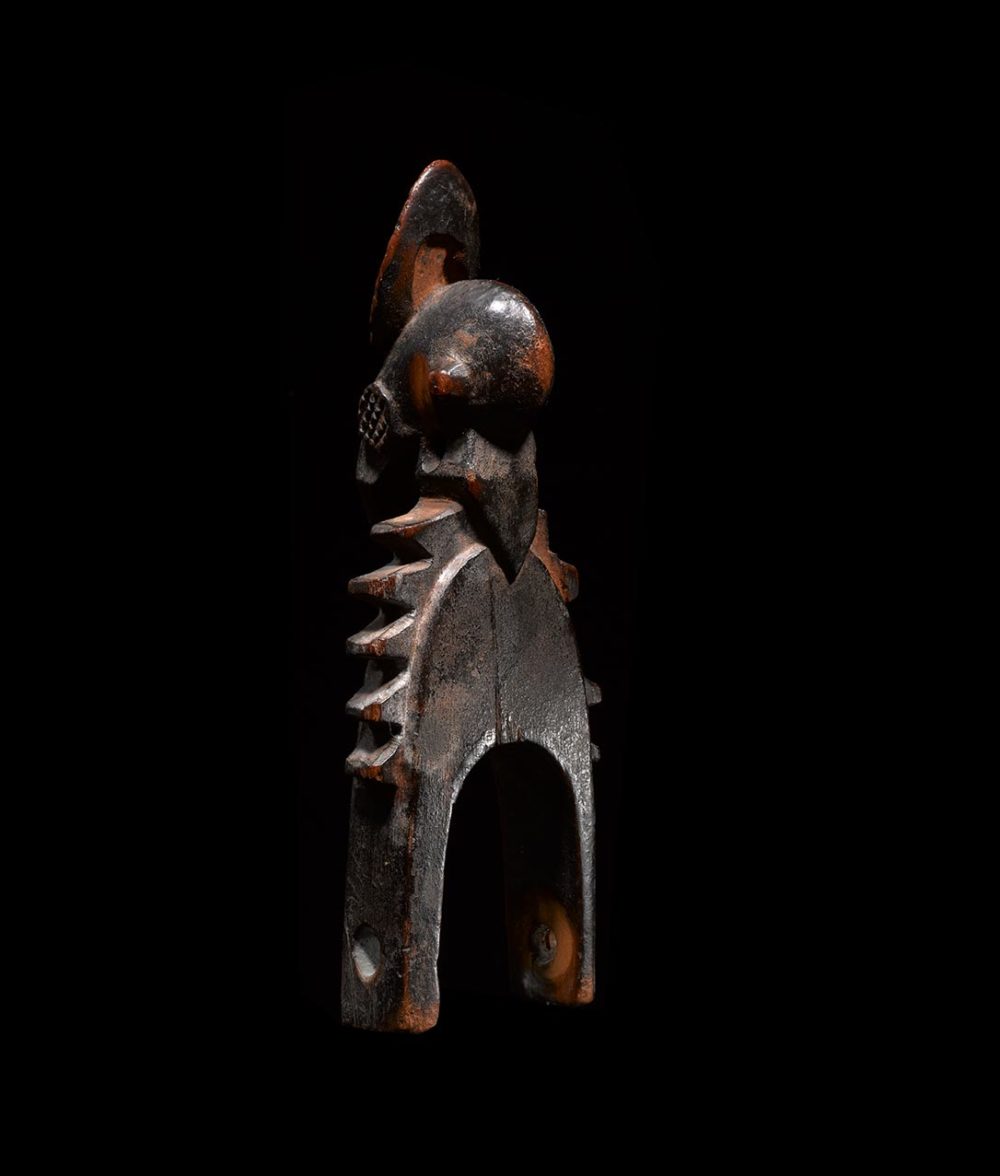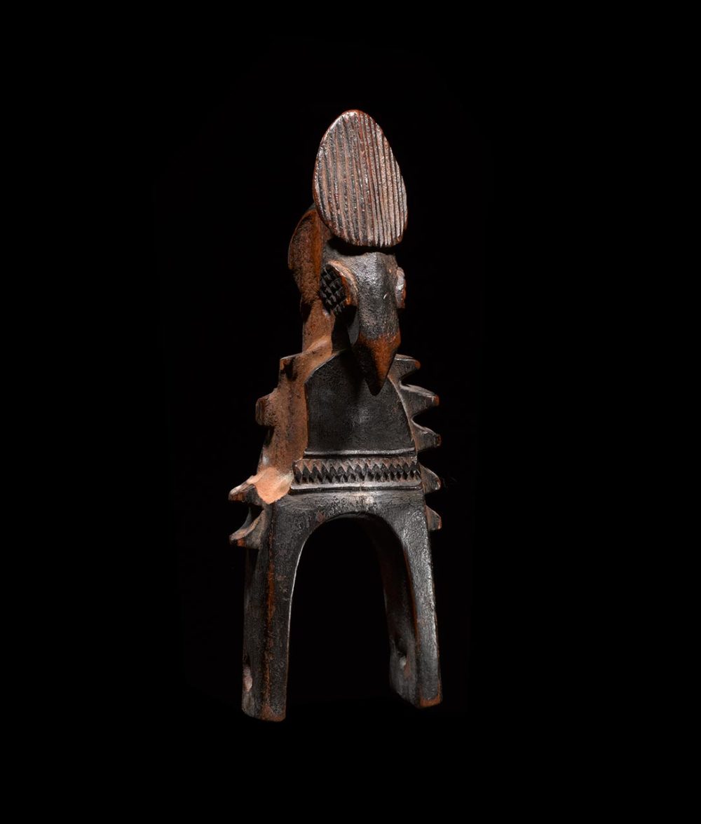 In use on a narrow strip loom, this pulley was both functional and aesthetic. It eased the movements of the heddles in separating the warp threads to allow the shuttle carrying the weft thread to pass through. Senufo pulleys often feature a stylized hornbill bird. The hornbill is one of the animals the Senufo associate with the creation of the world. This example is both beautifully carved and very well worn. Clear evidence of its age can be seen by the erosion on one side and the extreme wear on the pierced holes found on the bottom of its legs and its neck. The patina is dark and varied.