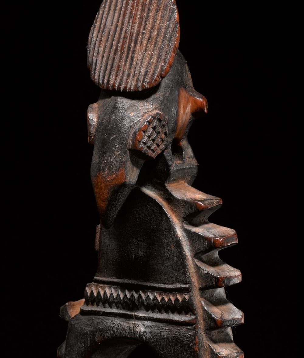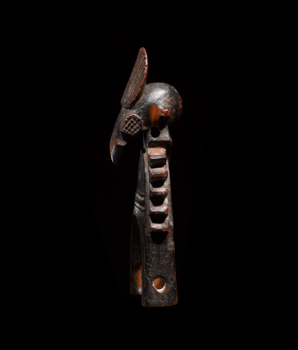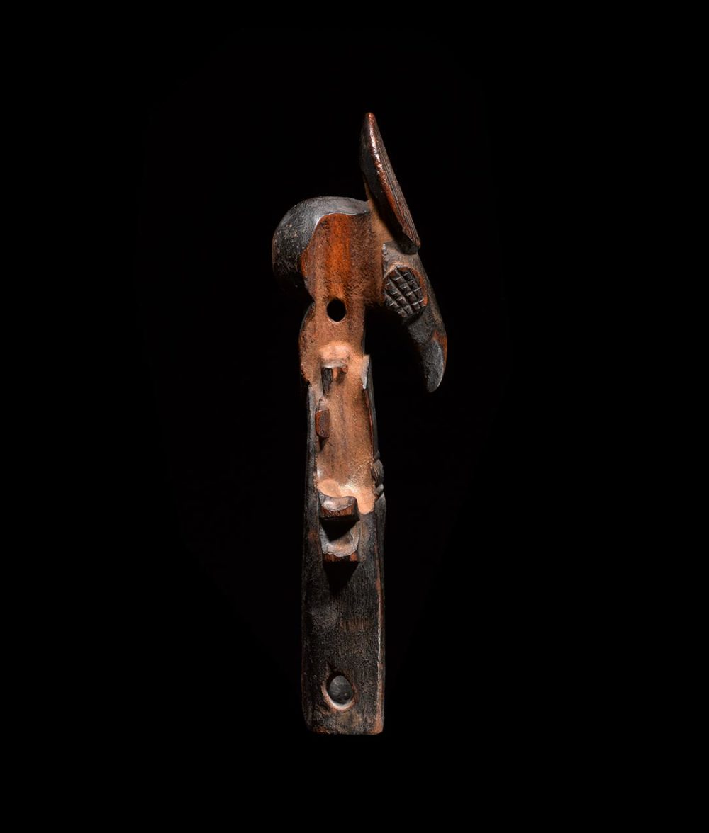 In use on a narrow strip loom, this pulley was both functional and aesthetic. It eased the movements of the heddles in separating the warp threads to allow the shuttle carrying the weft thread to pass through. Senufo pulleys often feature a stylized hornbill bird. The hornbill is one of the animals the Senufo associate with the creation of the world. This example is both beautifully carved and very well worn. Clear evidence of its age can be seen by the erosion on one side and the extreme wear on the pierced holes found on the bottom of its legs and its neck. The patina is dark and varied.
