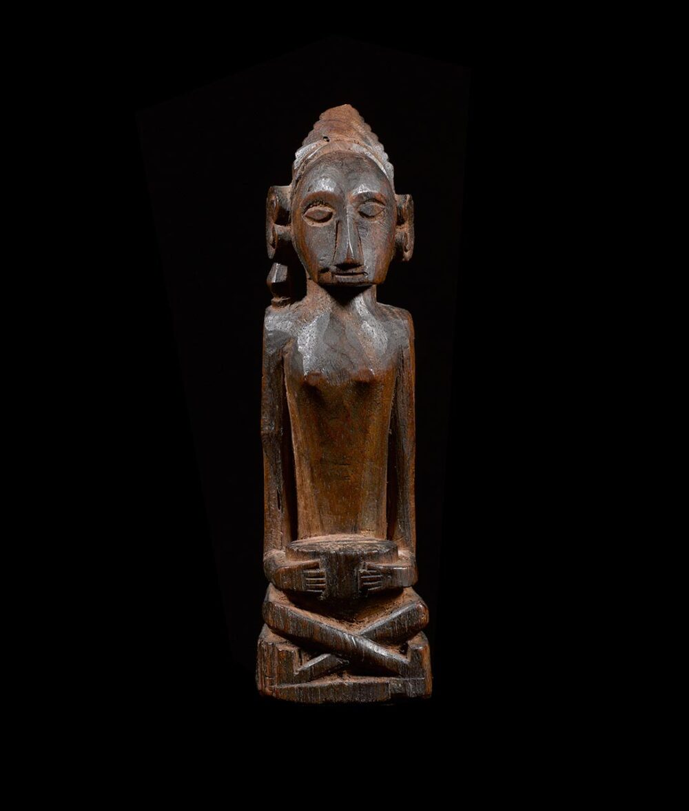 This small, but beautifully carved seated female figure is from the island of Leti in Indonesia. Originally kept within the home, these figures represent recently deceased family members and served as a vessel through which a spirit could temporarily reside, receive offerings, or be consulted about important matters. This example is beautifully carved with elegant lines and great attention to detail. The figure is holding on its lap and between its hands a ritual bowl. The surface is nicely patinated from handling and on its back one can see the beautiful natural grain of the special wood chosen to carve this sacred figure.