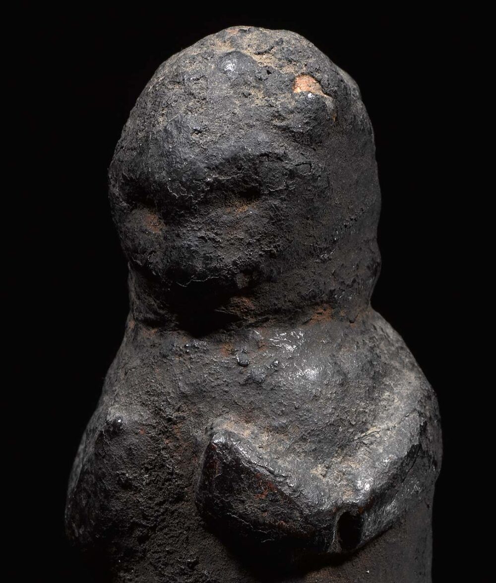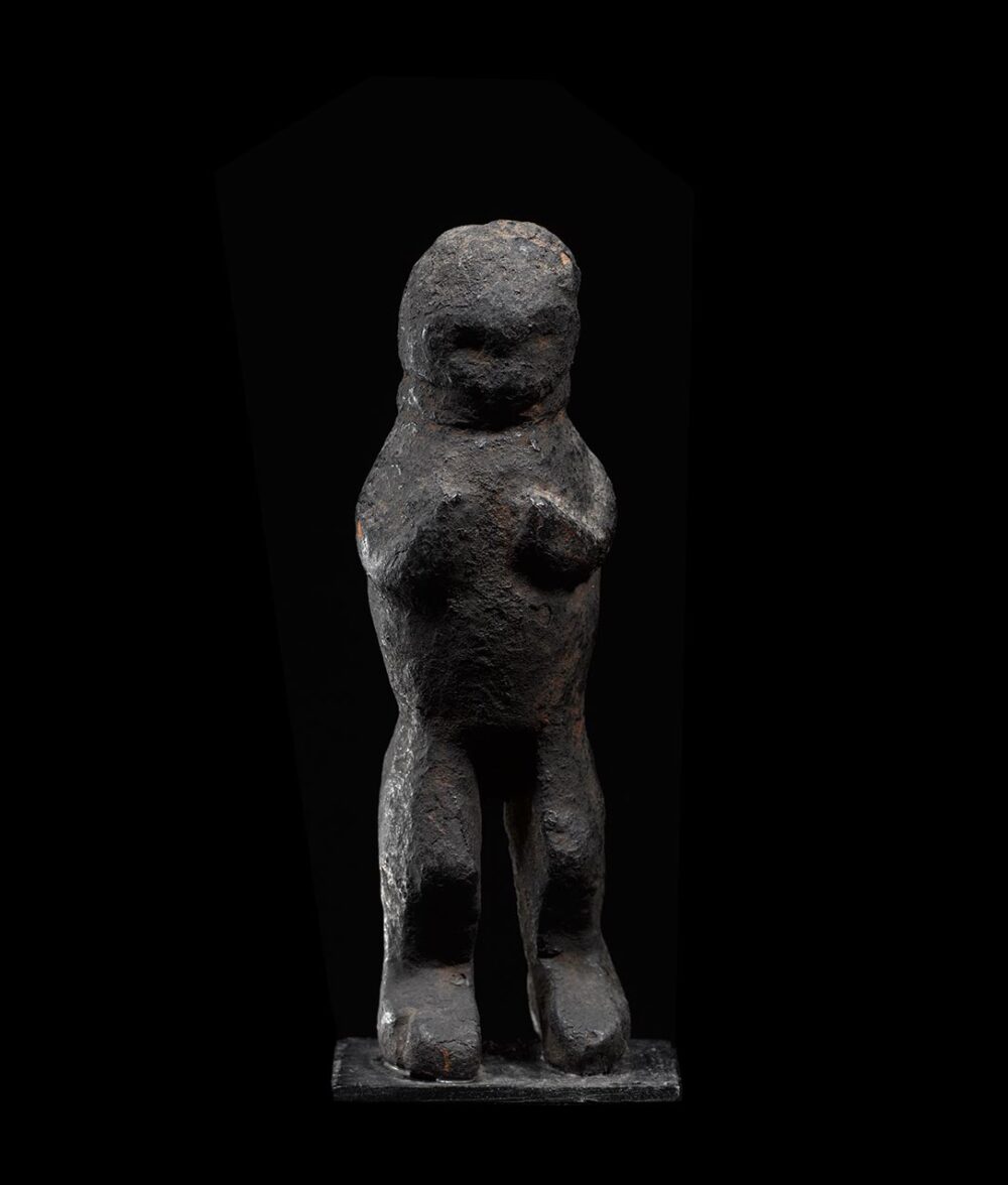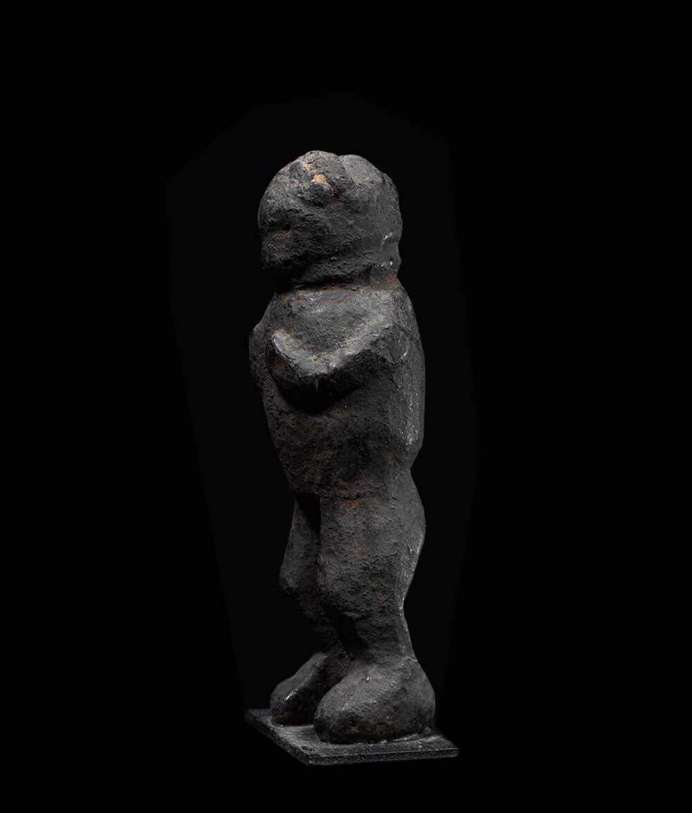 This strong yet whimsical figure from the Grasslands area of Cameroon is an ancient example. The smoothly encrusted patina of this figure is due to repeated rubbings and libations. This was most likely a personal protective charm due to its small size. Note the area around the neck, there are indentations in the surface that suggests something was tied around it. It most likely held a rope that attached it to a belt or bag to which it was carried. Examples of this age are very hard to come by.