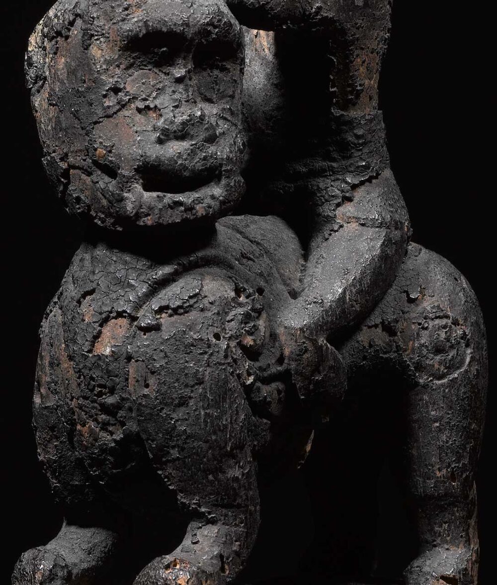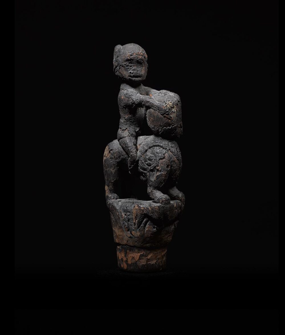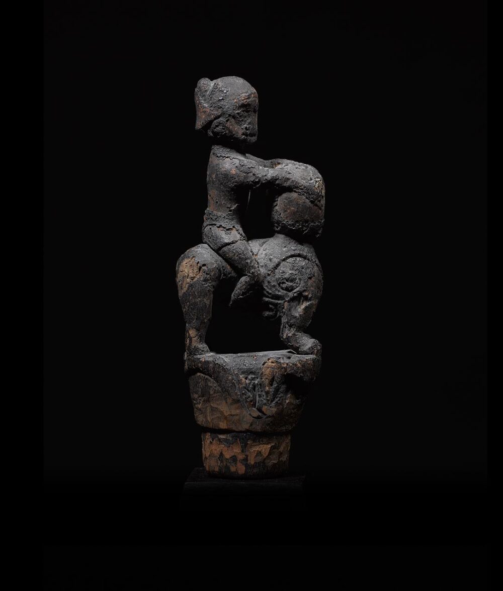 This intriguing medicine stopper is larger than most found on the market today. It consists of a figure riding on top of a stylized feline creature. There is great tension and movement on both, the human rider’s head is turned in one direction while the feline turns the other way. Another stylized animal image can be found carved in high relief at the bottom of feline’s legs. The patina is varied and encrusted from years of ritual use and libations. In excellent condition.