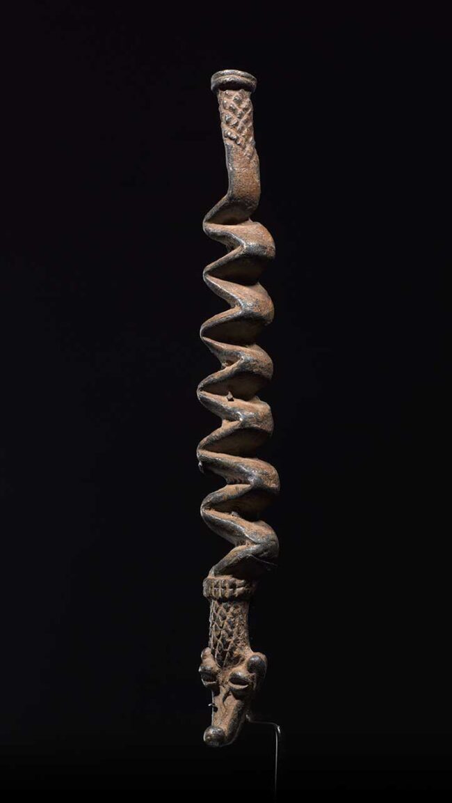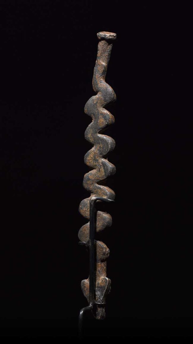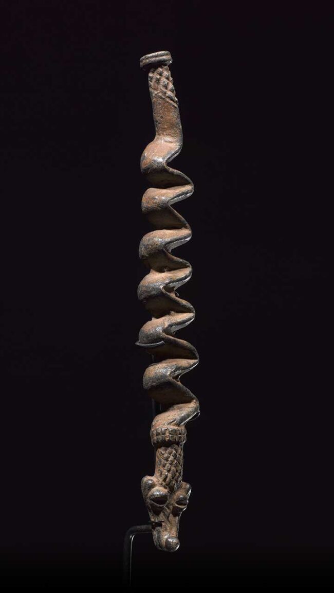 Iron snakes were created by Gan blacksmiths as talismans and shrine pieces for personal protection. So many of these snakes on the market today are reproductions; they are falsely aged with rust. This example has a deep varied patina from decades of use. The organic form of this stylized snake is truly wonderful; it flows with life-like body movement. A very high-quality example.