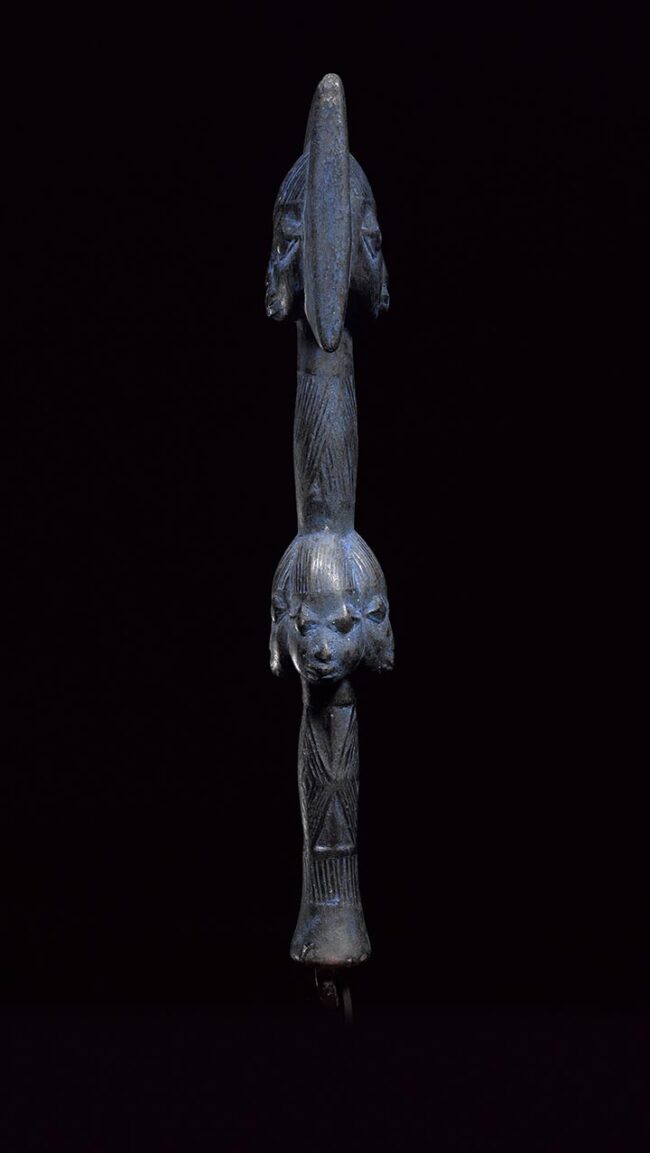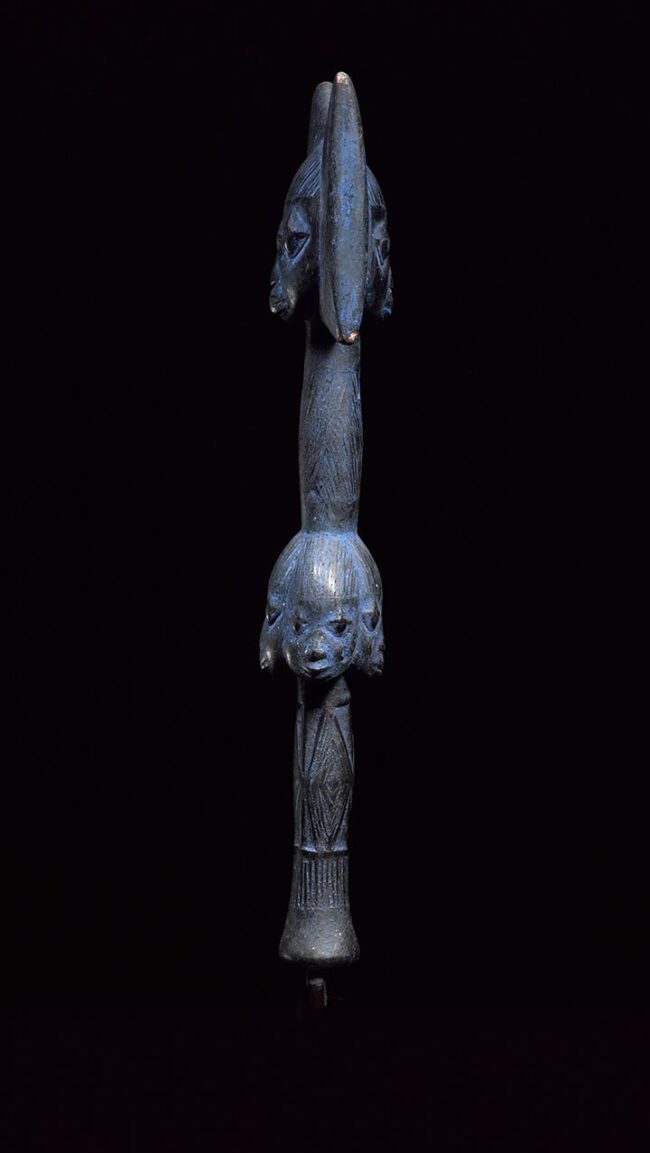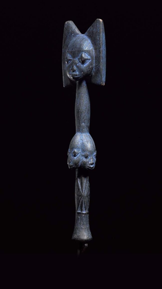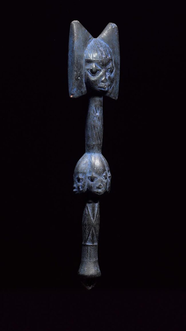 This staff or wand is called ‘Shango’ by the Yoruba people referencing the god it symbolizes. The surface has a bluish tint from having been rubbed with Reckitt’s Blue laundry powder. The sculptor was commissioned to create a version with several heads most likely giving it an ‘all seeing’ purpose or power. From all angles this object impresses but the side profile is especially strong; the heads have a slight downward casting look that gives this object a sense of elegance, balancing its bold aesthetic.