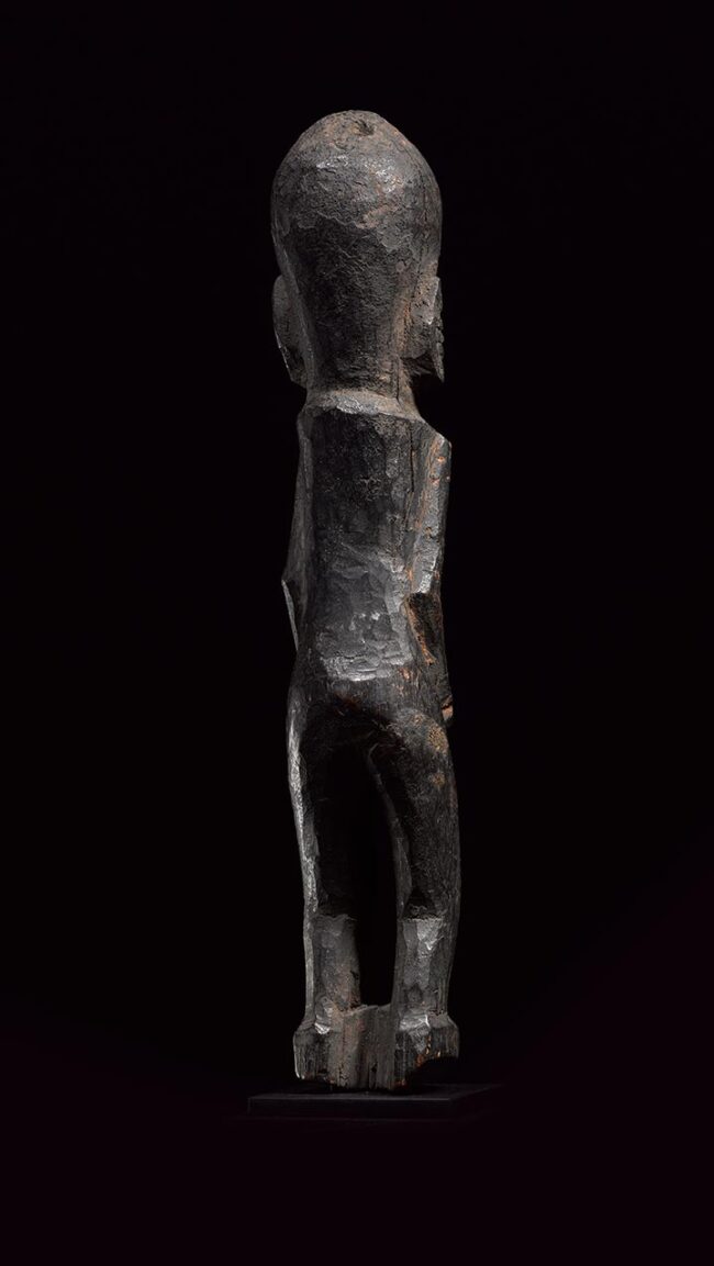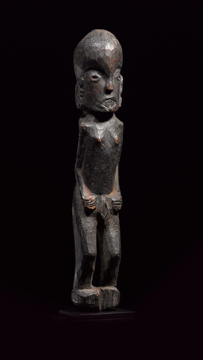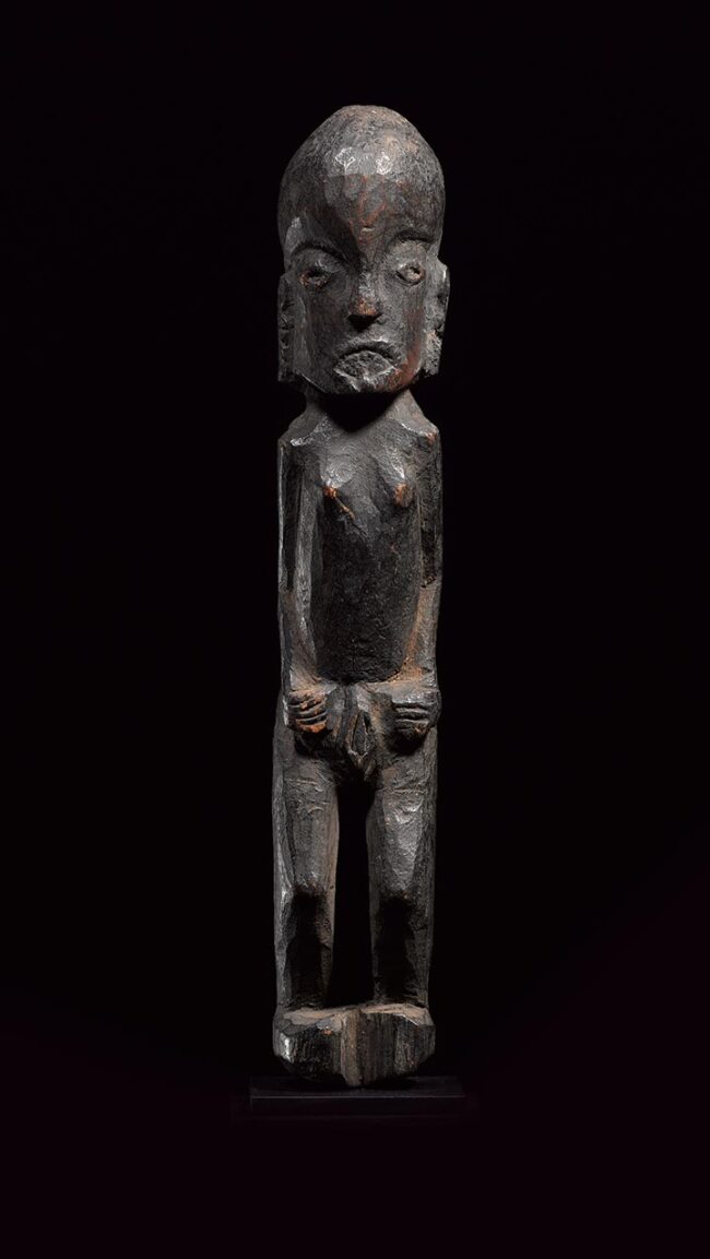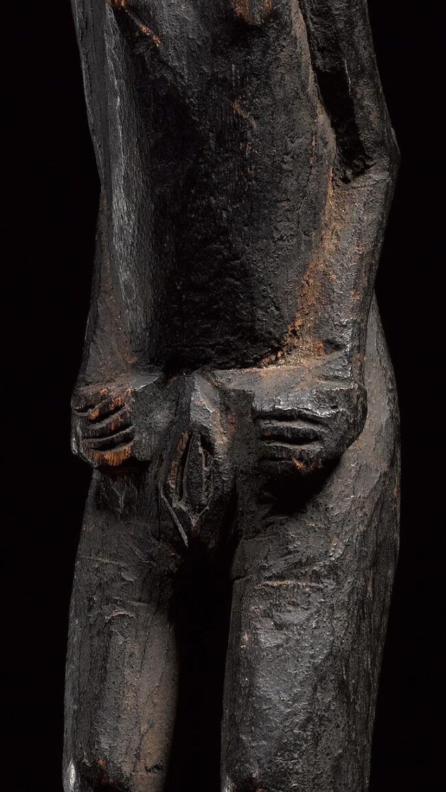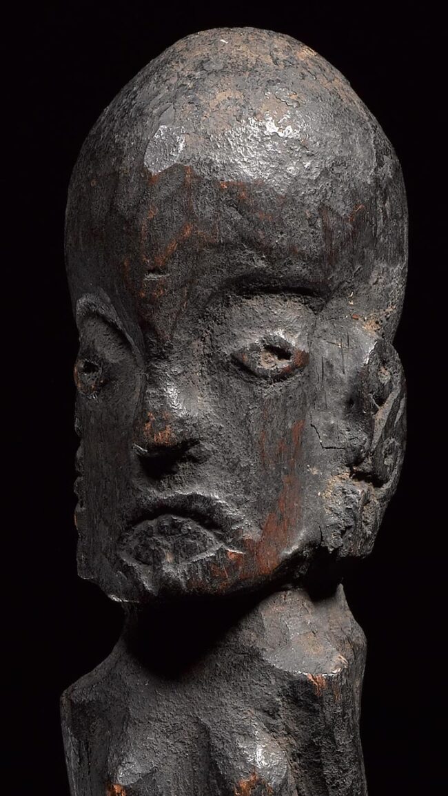 Pagar figures defended against evil spirits. Instilled with apotropaic powers, these figures contained the souls of people who died. Honored with offerings and incarnations, these figures could be used as communication with the ancestors. This example’s elongated face, open mouth with fierce expression, elongated stylized earlobes and sculpted chest are typical of Batak sculptural traditions. The torso is compact, with arms and legs carved into the block of wood. The hands are clasped at the waist by the female’s sex. The figure’s dark encrusted surface enhances its powerful presence.