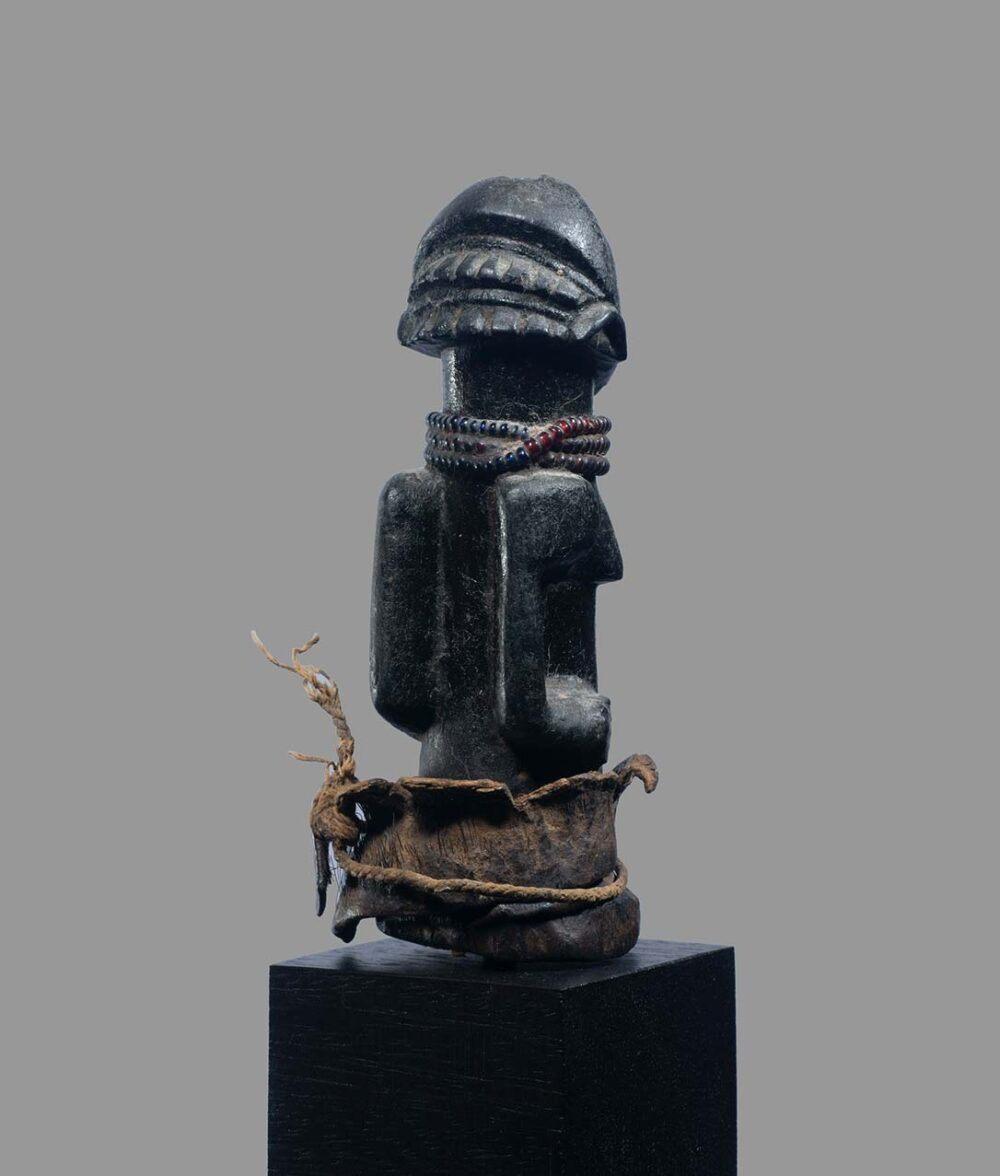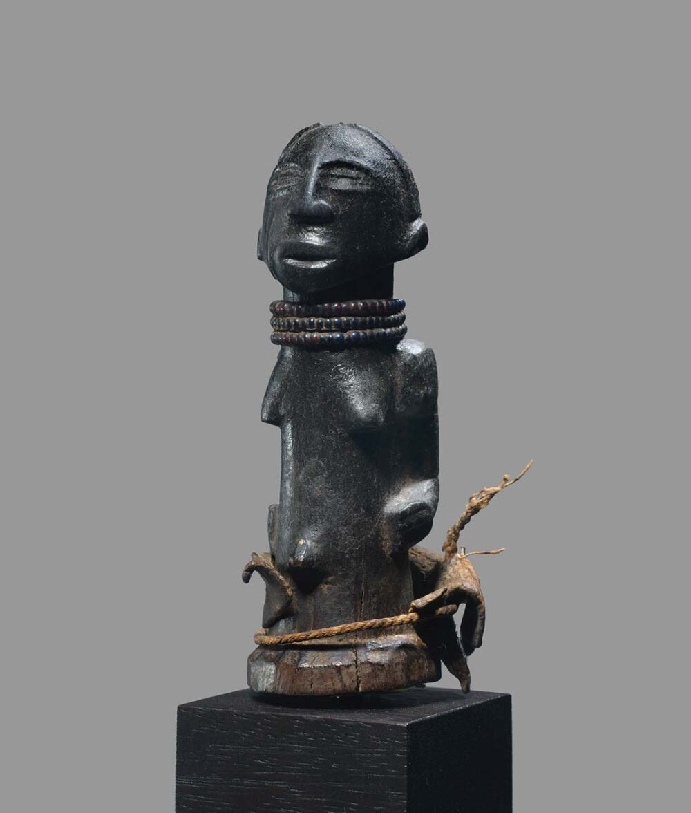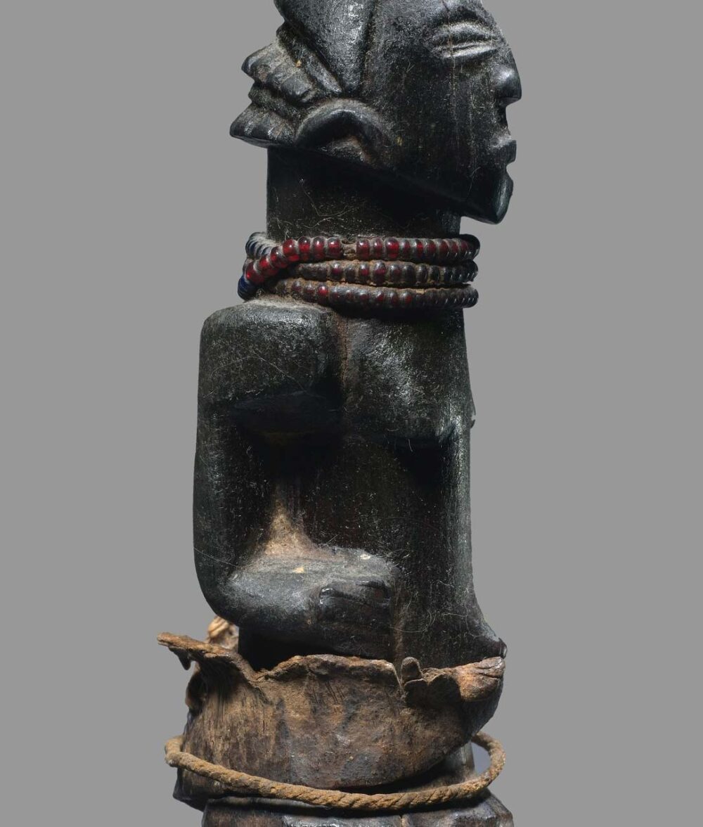The long slender body shows a female torso surrounded at the neck with blue beads that have become encrusted. Wrapped around the base there is a very old animal skin. The face has a powerful appearance with a stylized coiffure evident at the back of the head. The wood is dark in color and shows evidence of ritual application of palm oil. There is a cavity at the crown, where ‘medicine’ was probably placed to increase the potency of the figure.
