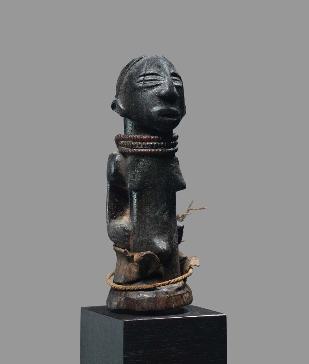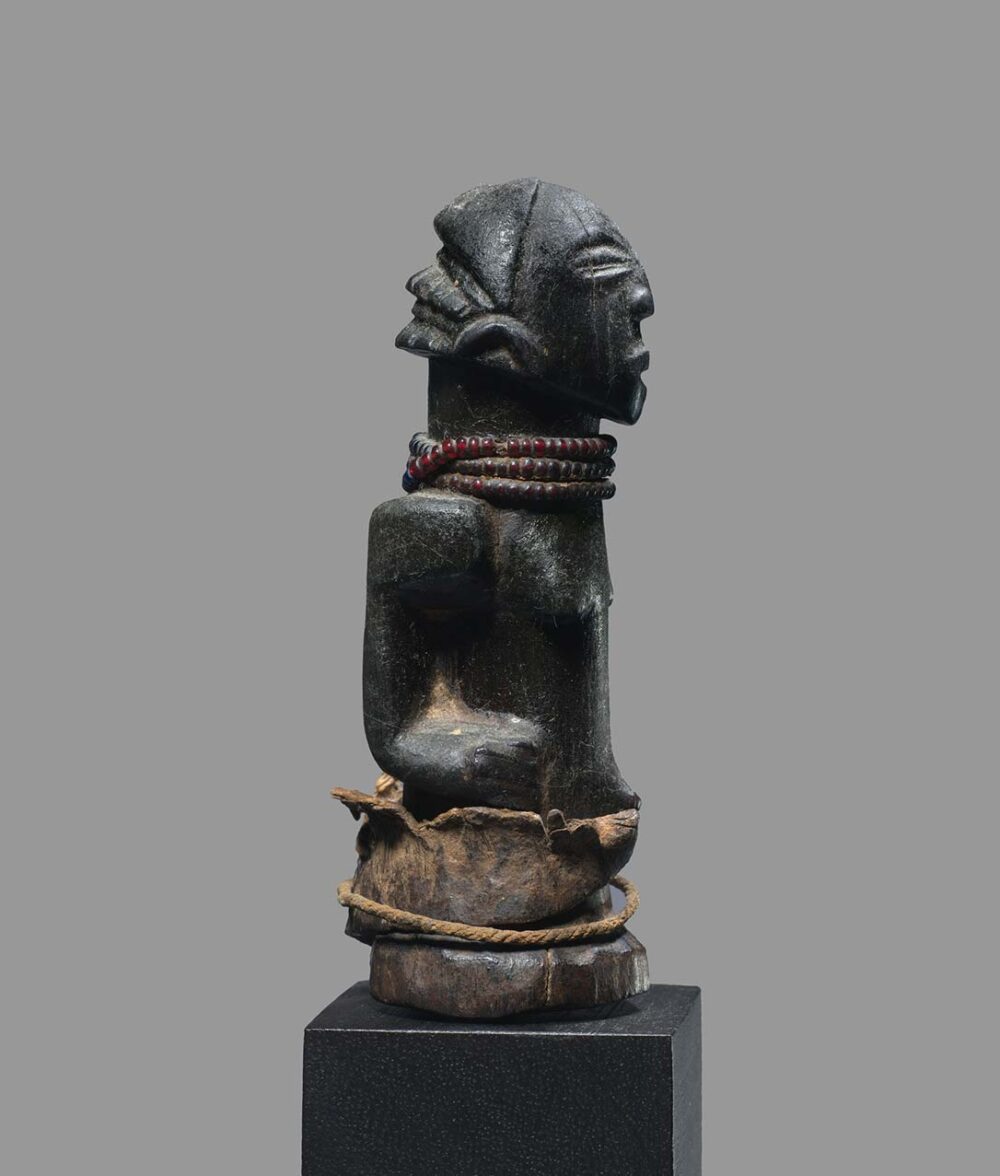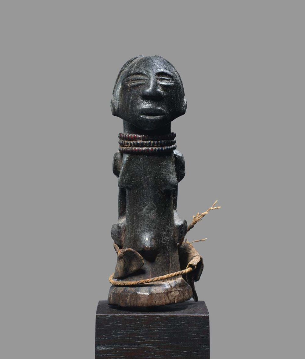 The long slender body shows a female torso surrounded at the neck with blue beads that have become encrusted. Wrapped around the base there is a very old animal skin. The face has a powerful appearance with a stylized coiffure evident at the back of the head. The wood is dark in color and shows evidence of ritual application of palm oil. There is a cavity at the crown, where ‘medicine’ was probably placed to increase the potency of the figure.