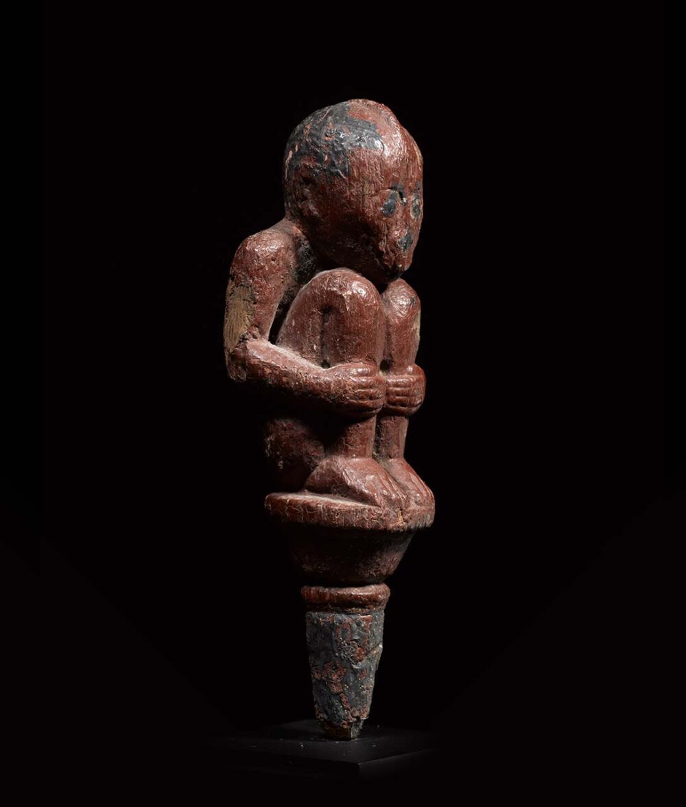 This beautiful Balinese handle is carved from wood and possesses an incredibly worn patina from generations of handling. The figure is curled into an almost fetal-like position holding his hands to his legs; this is done with fascinating precision. Objects of this quality would only be owned by important society members. In excellent condition