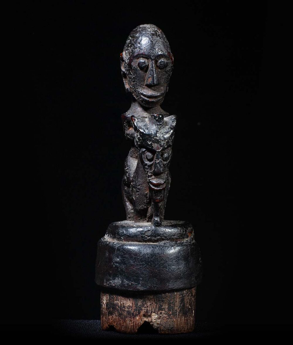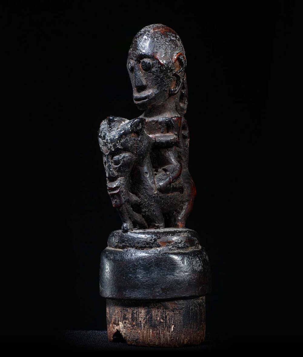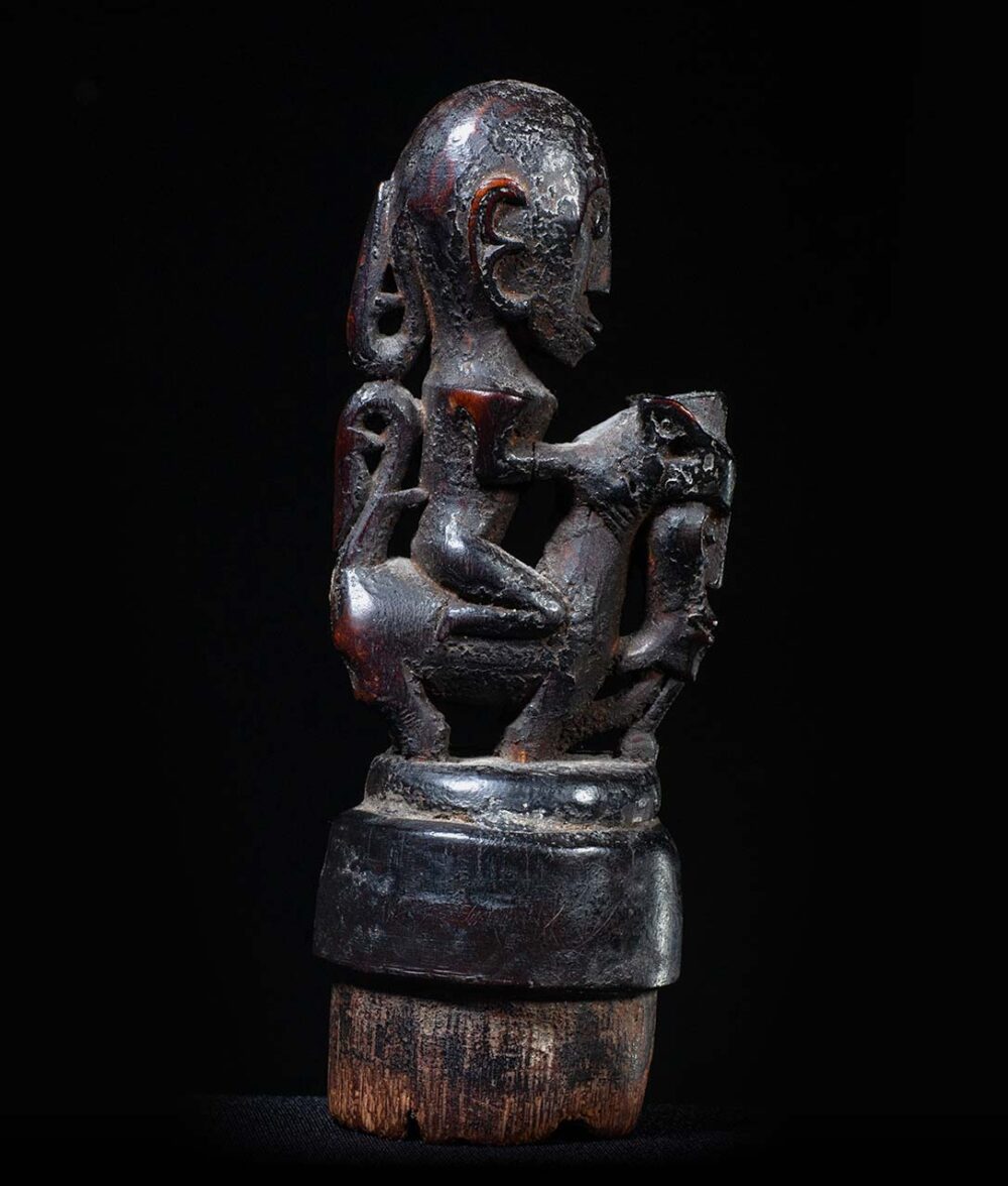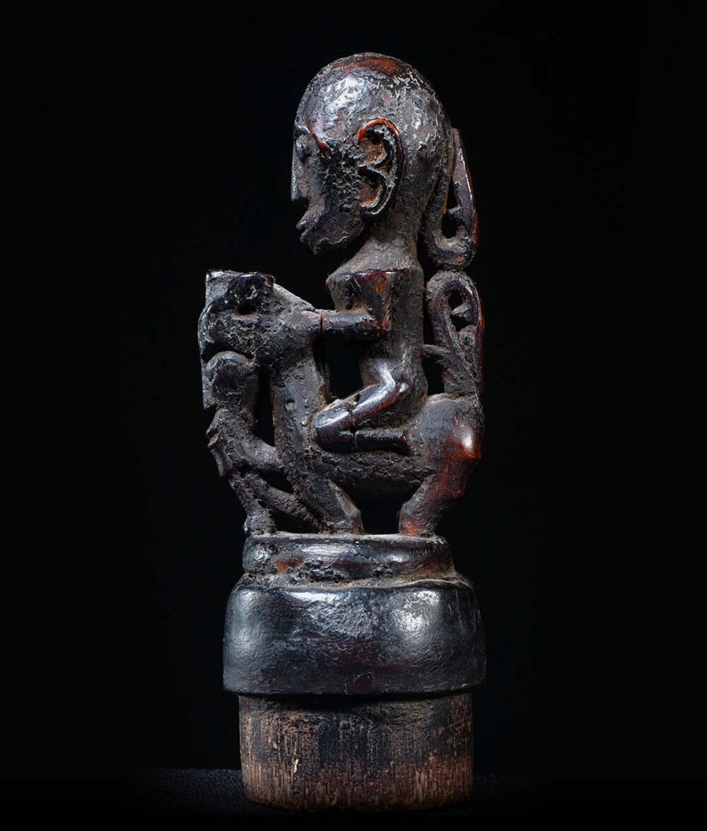 This stopper has been delicately carved, and demonstrates the Batak genius in carving small object d’art. A stylized humanistic rider sits upon a Singa figure. Singa figures are composite creatures, combining elements of a horse, with elements of a naga figure, or mythical snake, and a humanistic face. These containers would have contained magical medicines and were carried by diviners or priests. Its condition is excellent, and its surface exhibits a dark sooty and greasy patina.