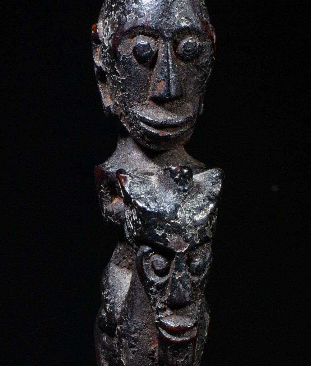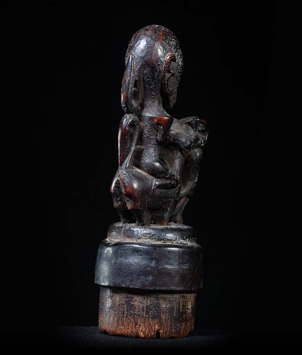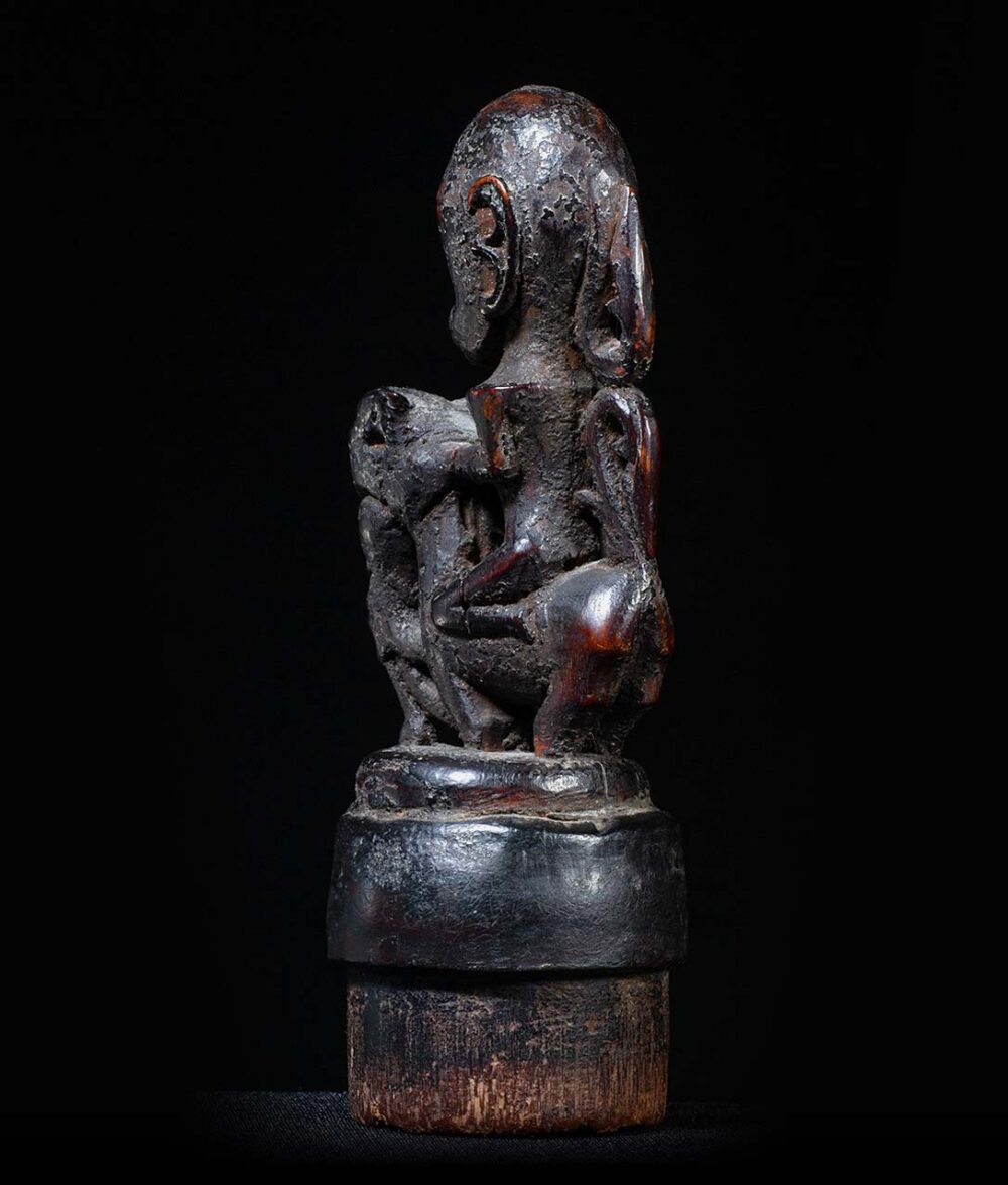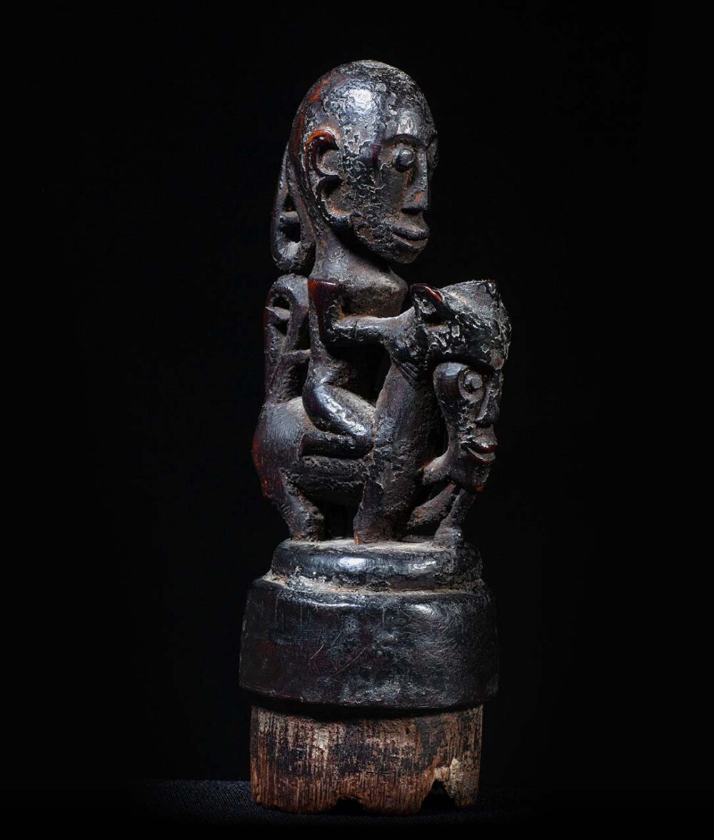 This stopper has been delicately carved, and demonstrates the Batak genius in carving small object d’art. A stylized humanistic rider sits upon a Singa figure. Singa figures are composite creatures, combining elements of a horse, with elements of a naga figure, or mythical snake, and a humanistic face. These containers would have contained magical medicines and were carried by diviners or priests. Its condition is excellent, and its surface exhibits a dark sooty and greasy patina.