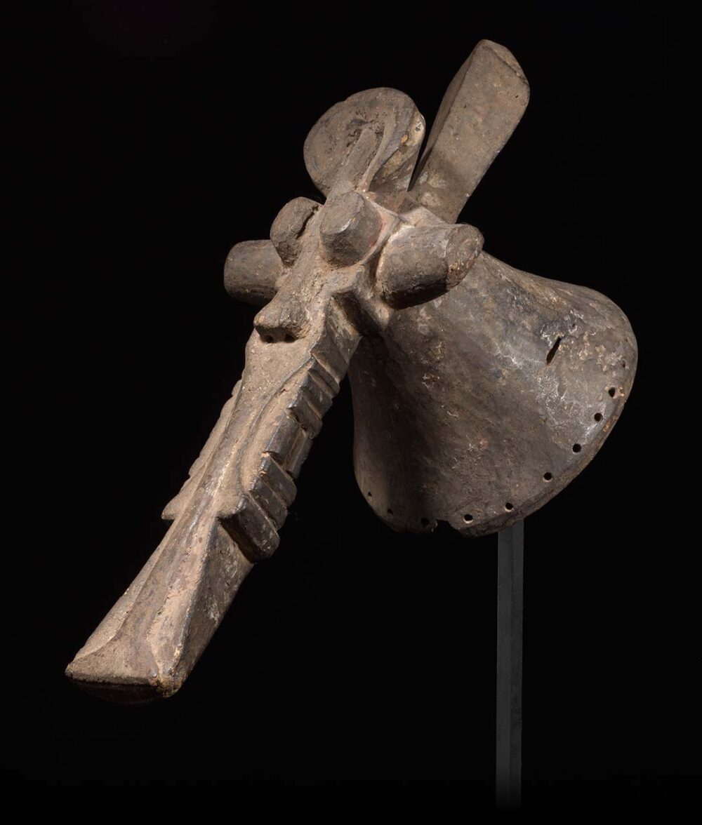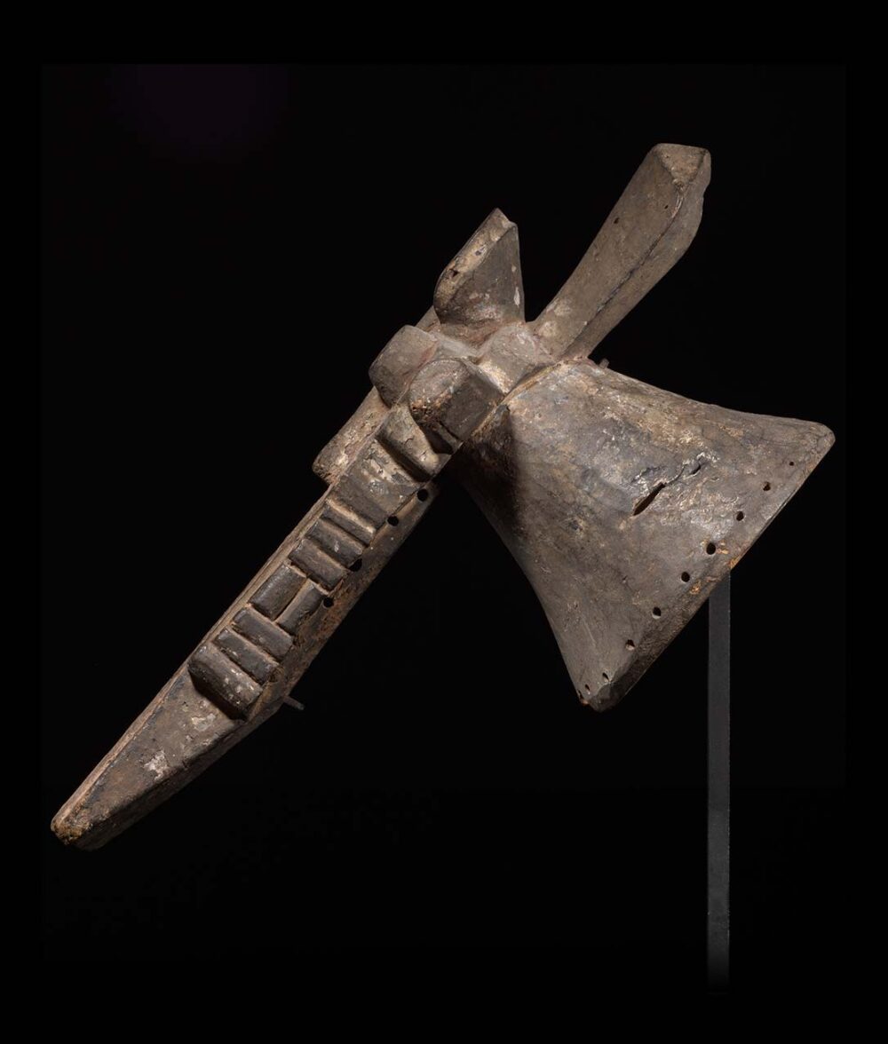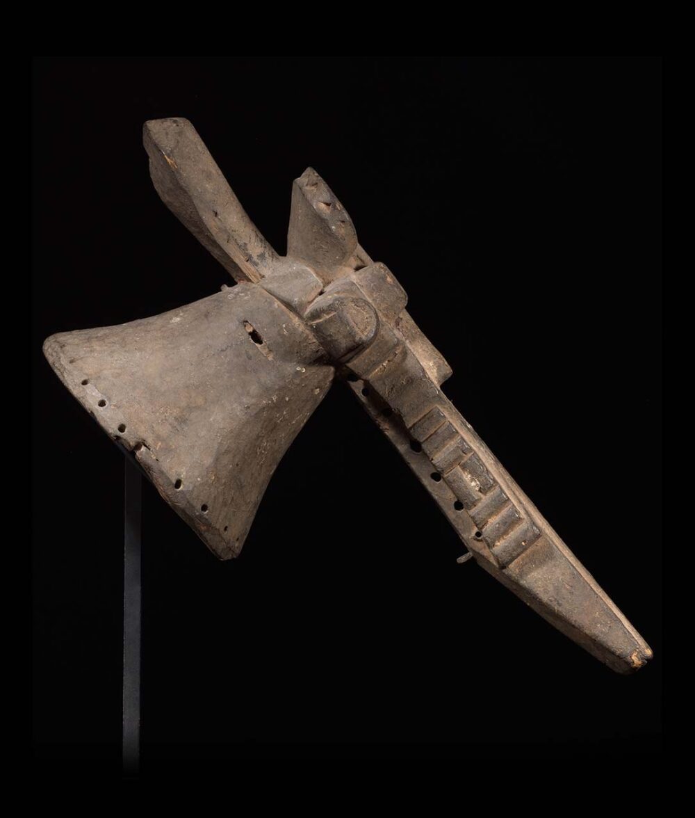 Water is an essential element to Ijo spiritual life. Water spirits control these environments and masquerades held in their honor imitate the dances of the water spirits themselves. Spirit masks are created and worn by men during these ceremonies. These masks blend features of aquatic animals and humans. The mask is worn on top of the head in order to face the sky; meaning the principle features of the mask are only visible to other spectators when the wearer bends forward. One of the striking features of this mask is its stylized abstract design. The Ijo people are known for their skill in woodcarving, and they often carve their masks and other objects in a highly stylized manner that emphasizes geometric shapes and abstract forms. This style is thought to have developed as a way to convey the power and mystique of the water spirit. This particular example represents a crocodile. The crocodile’s face is heavily stylized in a geometric pattern. The snout is long and rectangular while the humanistic eyes and nose are placed on top of the mask. This mask would have been used to invoke water spirits for assistance and guidance.