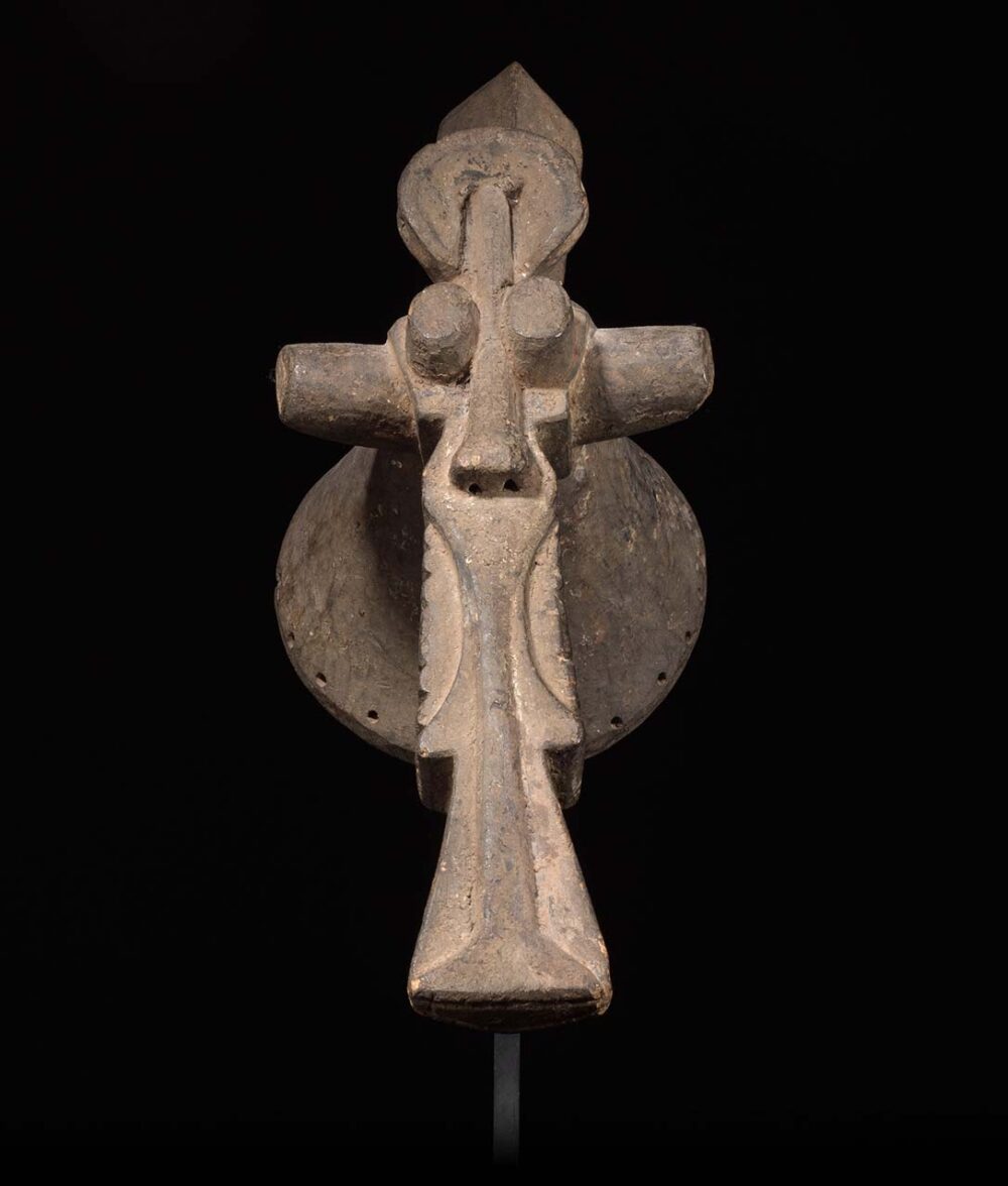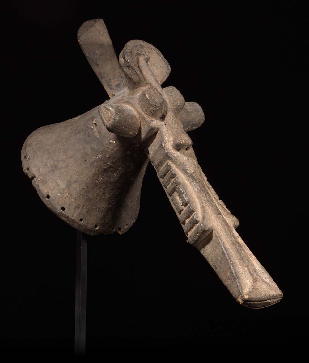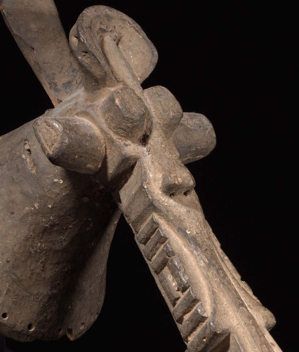 Water is an essential element to Ijo spiritual life. Water spirits control these environments and masquerades held in their honor imitate the dances of the water spirits themselves. Spirit masks are created and worn by men during these ceremonies. These masks blend features of aquatic animals and humans. The mask is worn on top of the head in order to face the sky; meaning the principle features of the mask are only visible to other spectators when the wearer bends forward. One of the striking features of this mask is its stylized abstract design. The Ijo people are known for their skill in woodcarving, and they often carve their masks and other objects in a highly stylized manner that emphasizes geometric shapes and abstract forms. This style is thought to have developed as a way to convey the power and mystique of the water spirit. This particular example represents a crocodile. The crocodile’s face is heavily stylized in a geometric pattern. The snout is long and rectangular while the humanistic eyes and nose are placed on top of the mask. This mask would have been used to invoke water spirits for assistance and guidance.