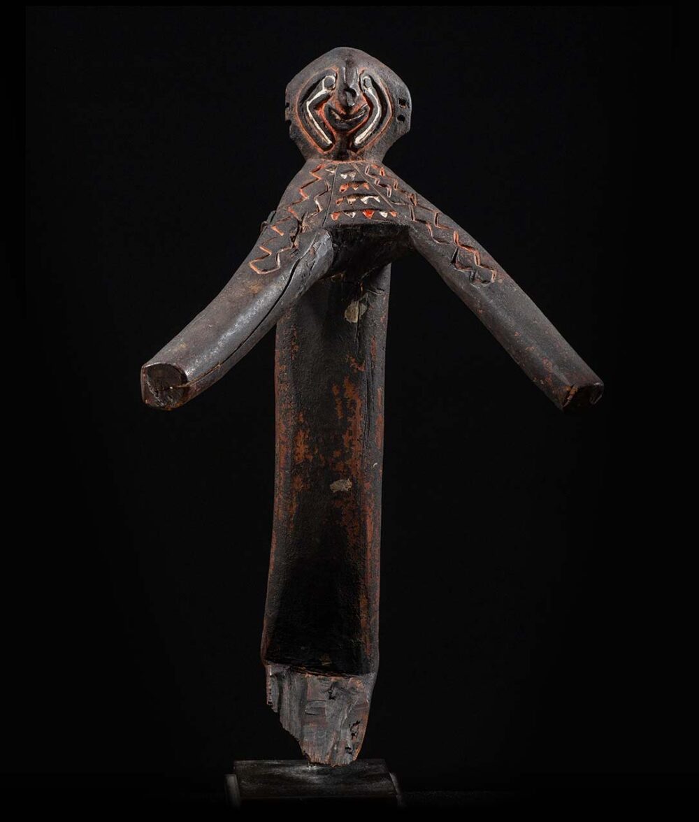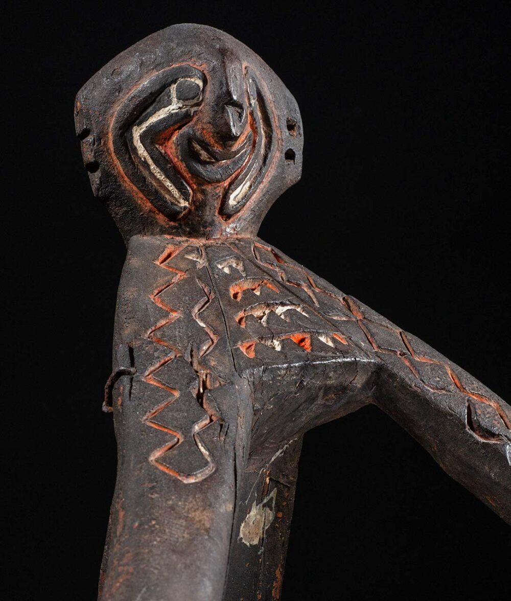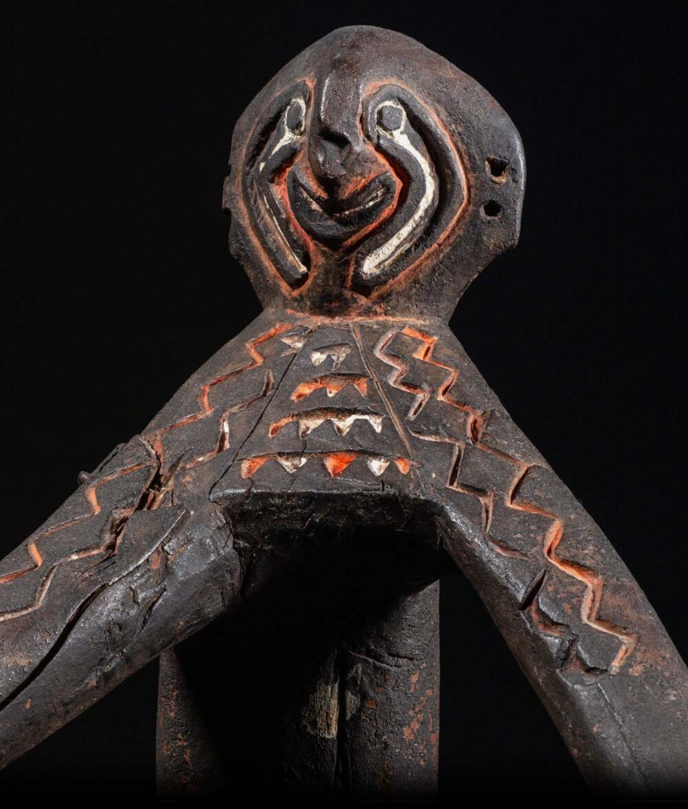 The Urama people were renowned for their exceptional wood carving skills, and this neck rest is no exception. It was carved from a single piece of hardwood, expertly crafted into a curved three-legged shape. At one end, it features a human head, and the surface is adorned with intricate patterns and symbols. These patterns were created using a variety of techniques, including chiseling, engraving, and burning, and were filled with colored natural pigments, adding to its aesthetic appeal.