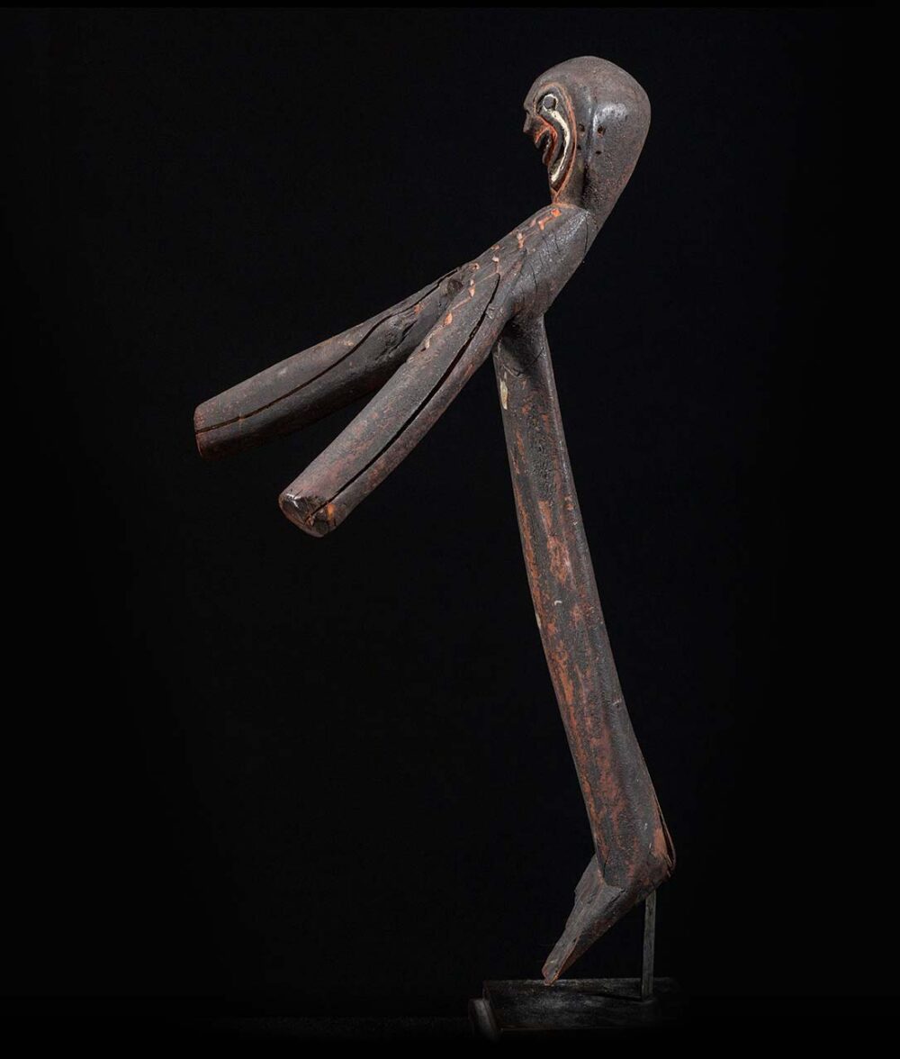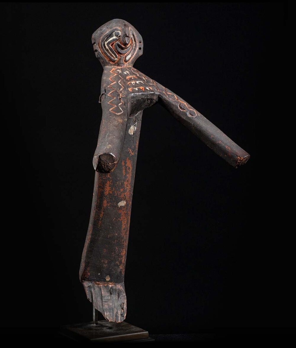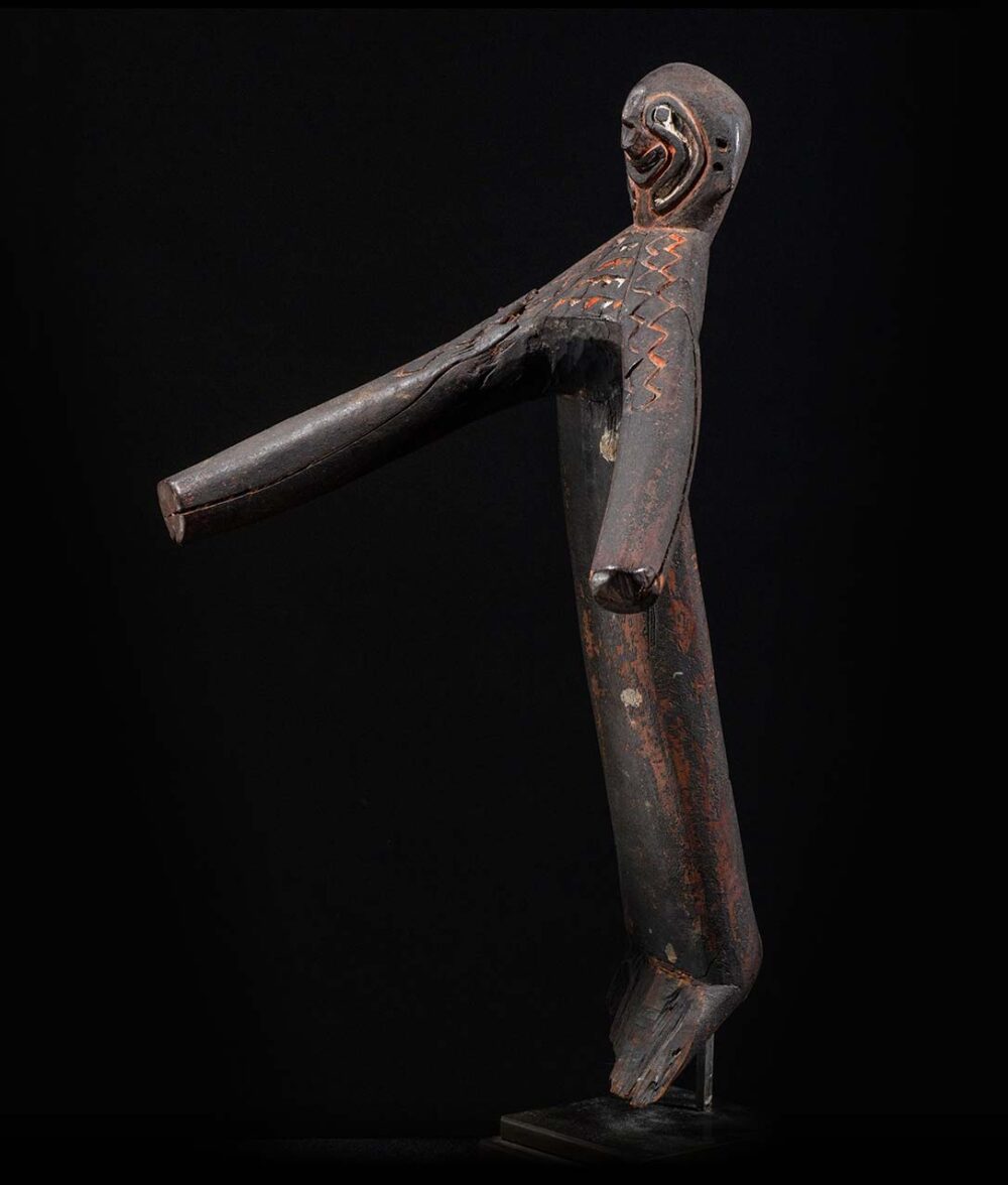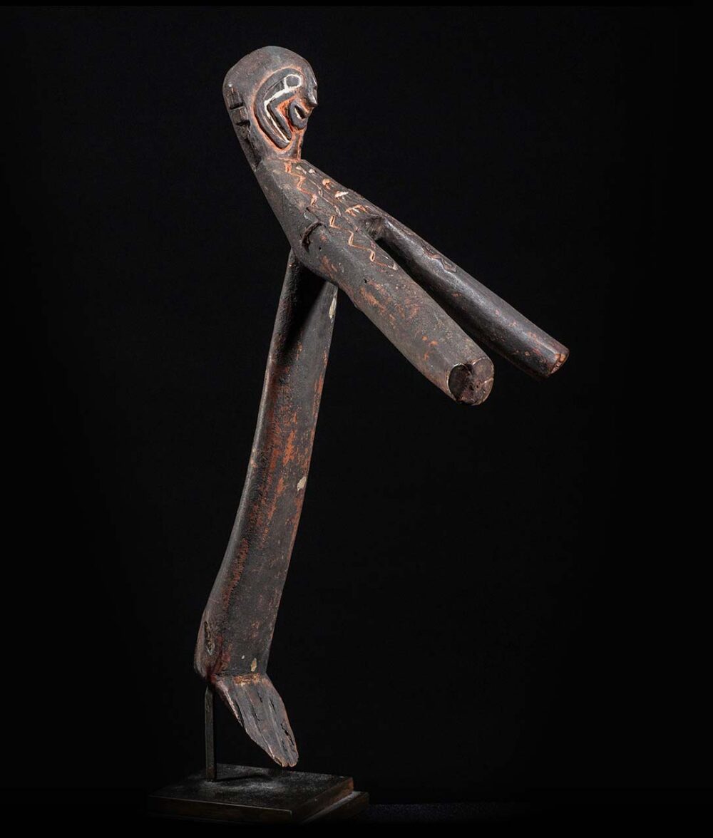The Urama people were renowned for their exceptional wood carving skills, and this neck rest is no exception. It was carved from a single piece of hardwood, expertly crafted into a curved three-legged shape. At one end, it features a human head, and the surface is adorned with intricate patterns and symbols. These patterns were created using a variety of techniques, including chiseling, engraving, and burning, and were filled with colored natural pigments, adding to its aesthetic appeal.