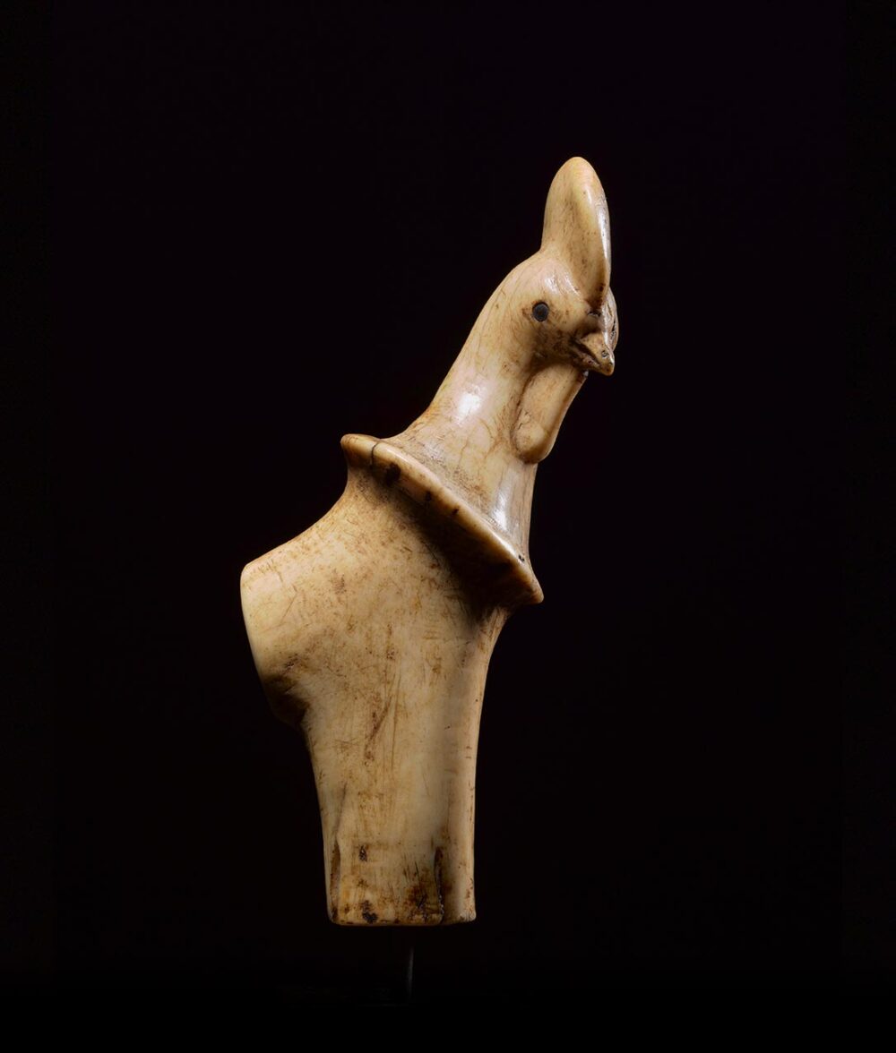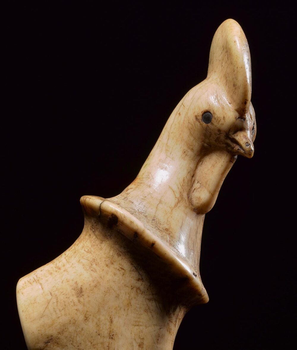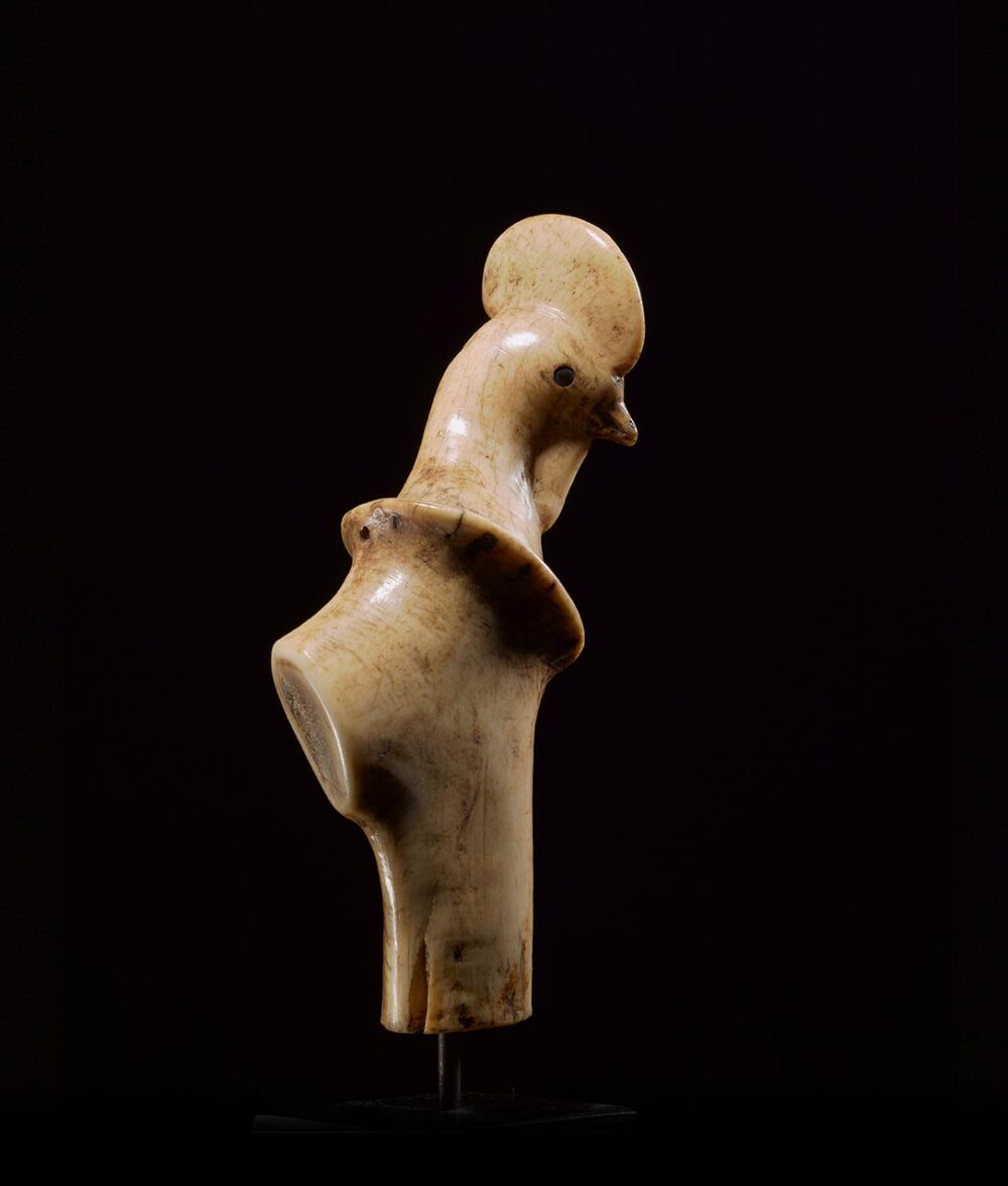 Carved from deer antler with a wonderful smooth patina, this Bali handle is a very fine example. The beautifully rendered image is of a Rooster with eyes that have been inlayed with dark horn. The depth of the patina on the antler developed over an extensive period of time and use.