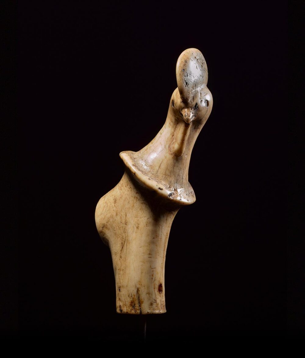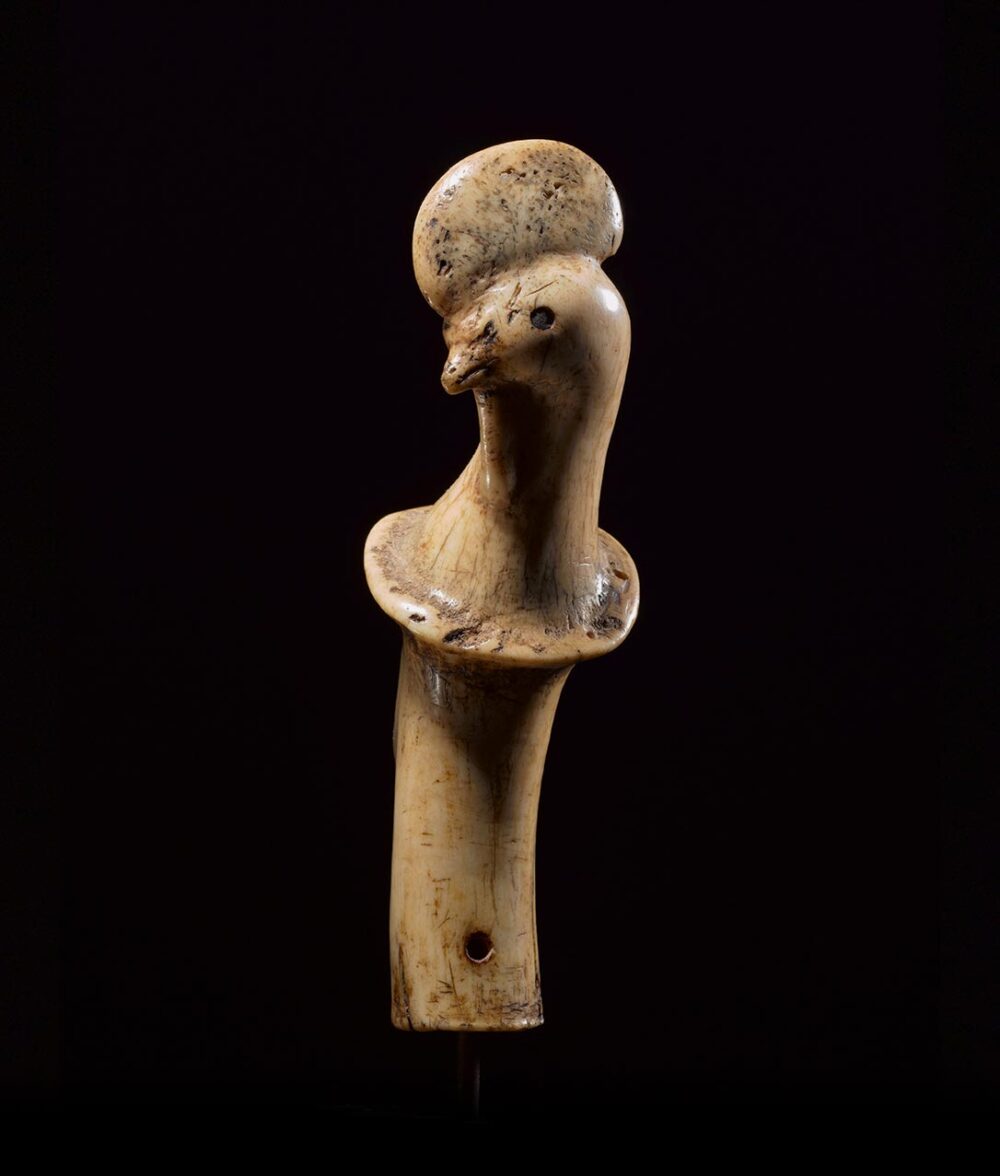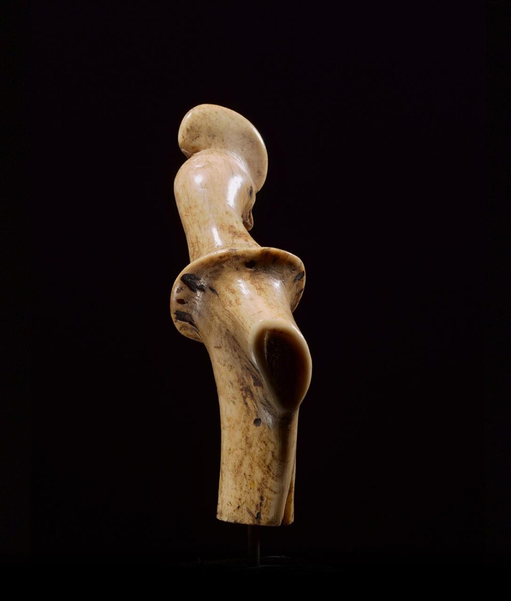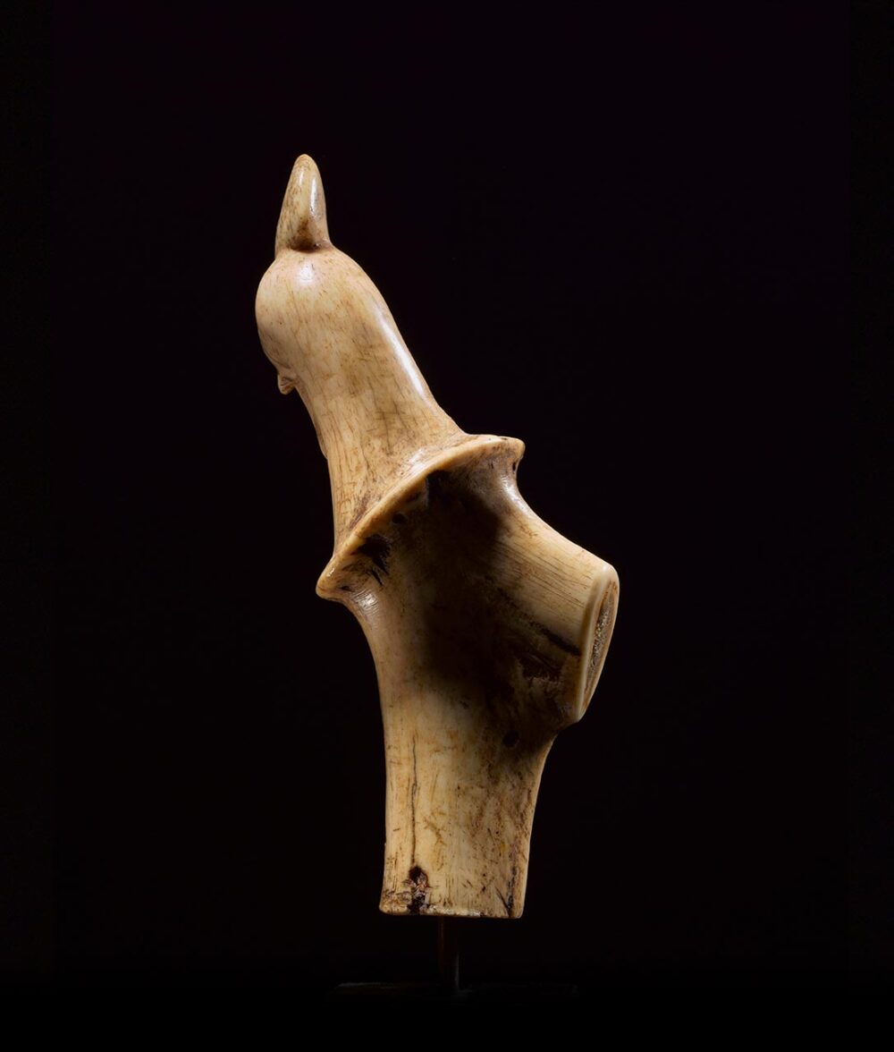 Carved from deer antler with a wonderful smooth patina, this Bali handle is a very fine example. The beautifully rendered image is of a Rooster with eyes that have been inlayed with dark horn. The depth of the patina on the antler developed over an extensive period of time and use.
