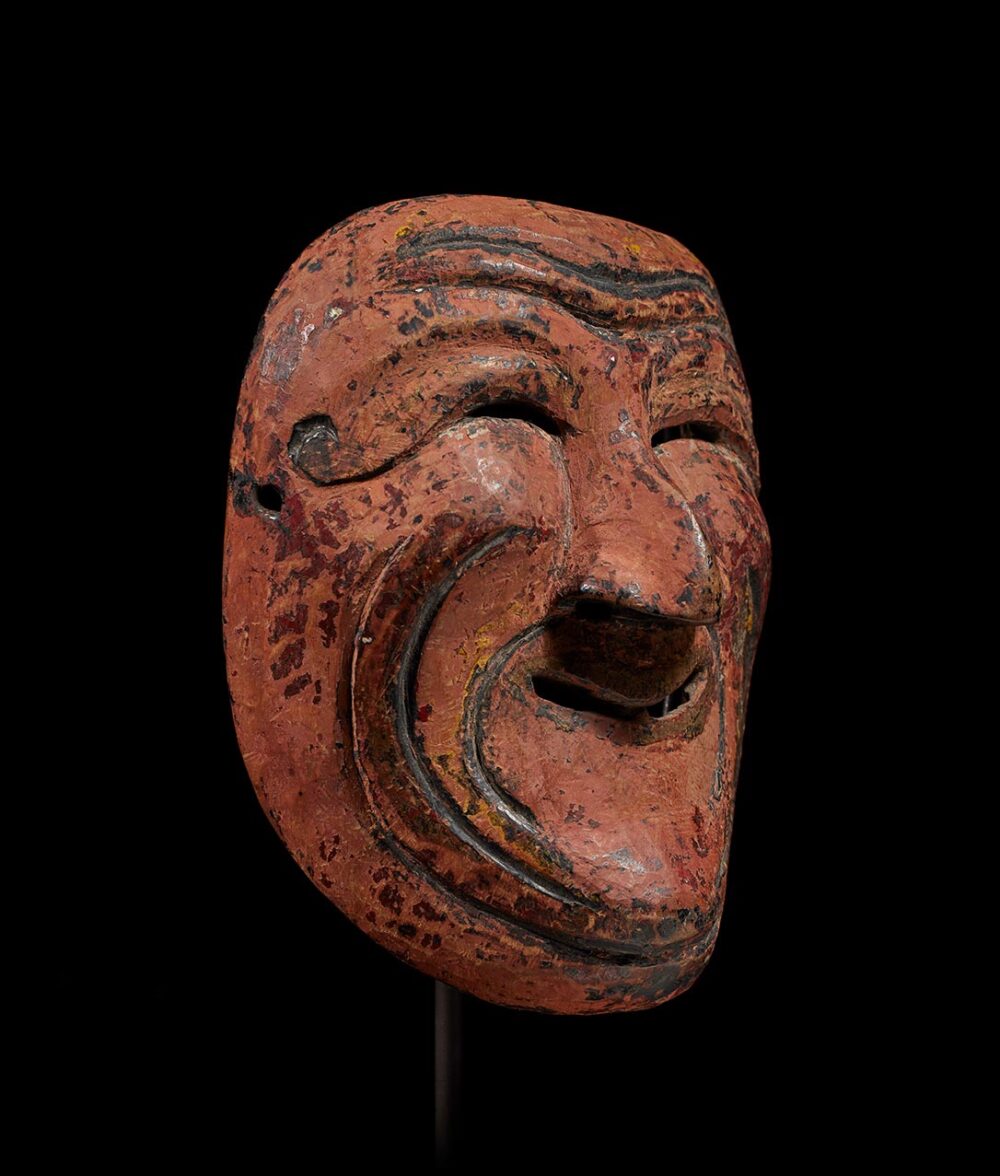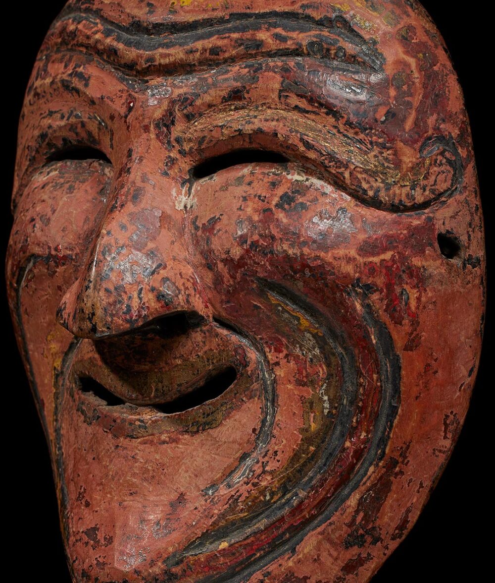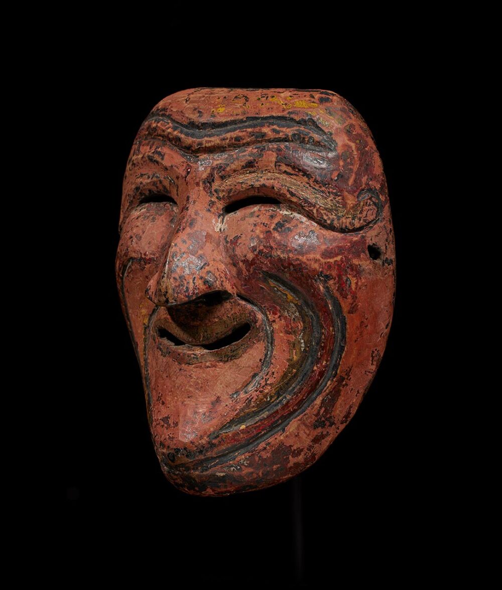 This captivating mask originates from the Javanese ‘wayang topeng’ theatre tradition. Meticulously carved from sturdy hardwood, it boasts striking black and brown hues on the front, adding depth and character to its intricate design. The unpainted rear reveals a time-worn patina, evidence of its age and prior use. Minor scuffing on the front only adds to its authenticity, hinting at a rich history of performances.