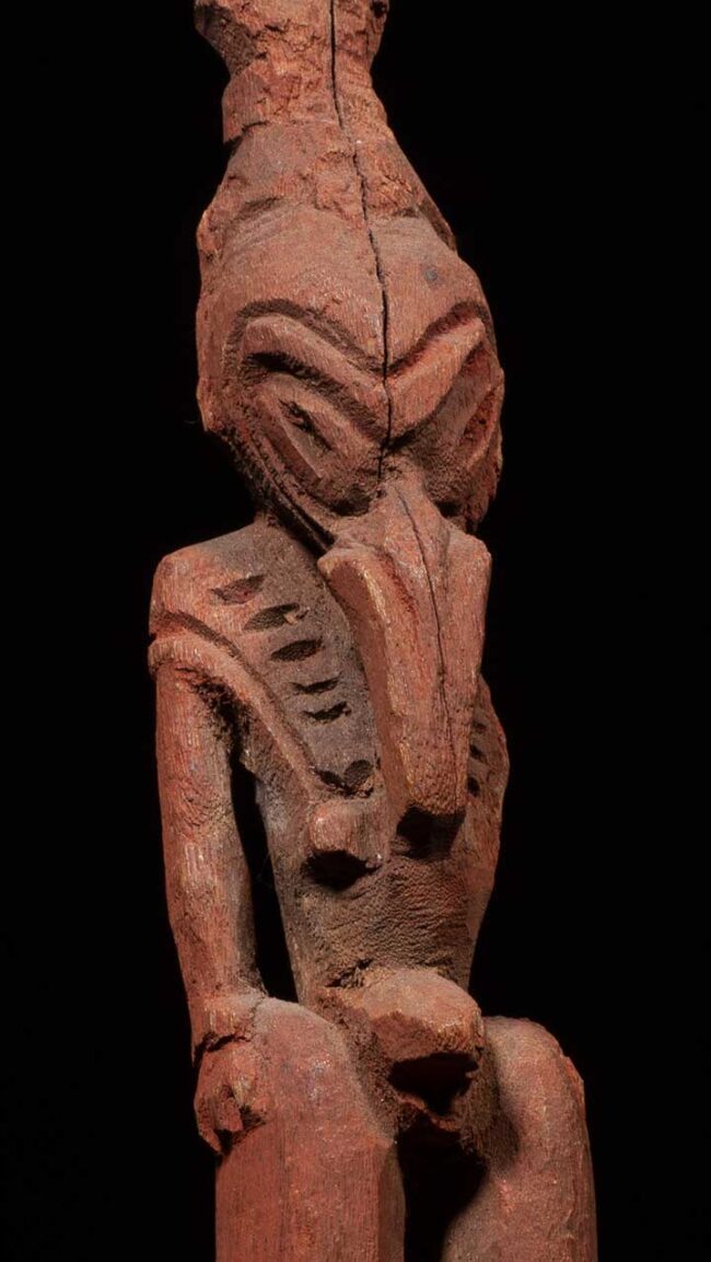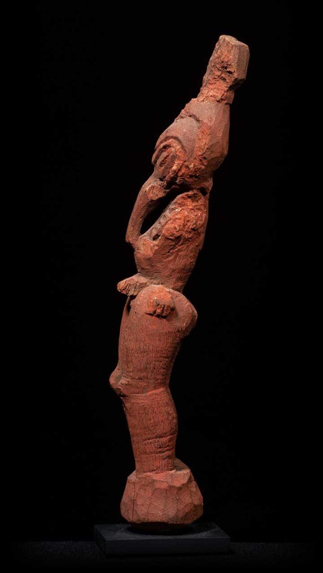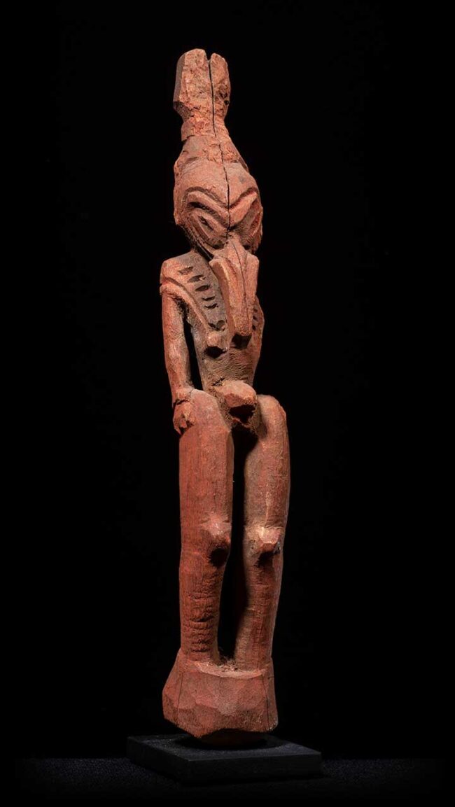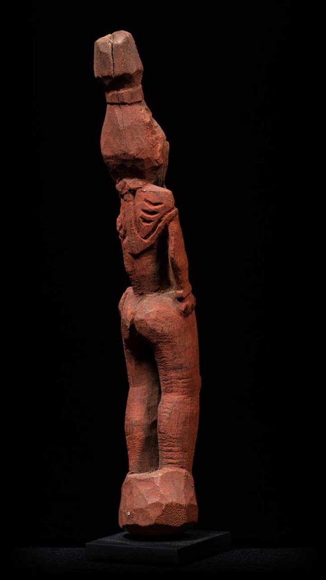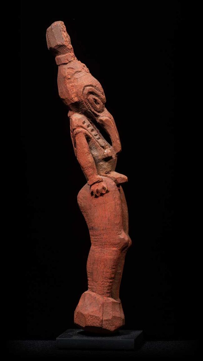 This ancestral figure originates from the Murik Lakes region in Papua New Guinea. It was crafted to be easily carried by individuals for protection or affixed to objects to ensure success. With its authoritative presence, this figure exudes power. Its body displays remarkable torque, while its traditionally rendered face features a long- pierced nose and deep-set oval eyes, evoking a sense of tradition and wisdom. The profile is particularly striking, revealing the subtle tilt of the figure. Carved from medium-density wood, the sculpture bears traces of old red pigments that have endured the test of time. Despite one of its arms being missing, the sculpture retains its potency and continues to captivate with its compelling presence.