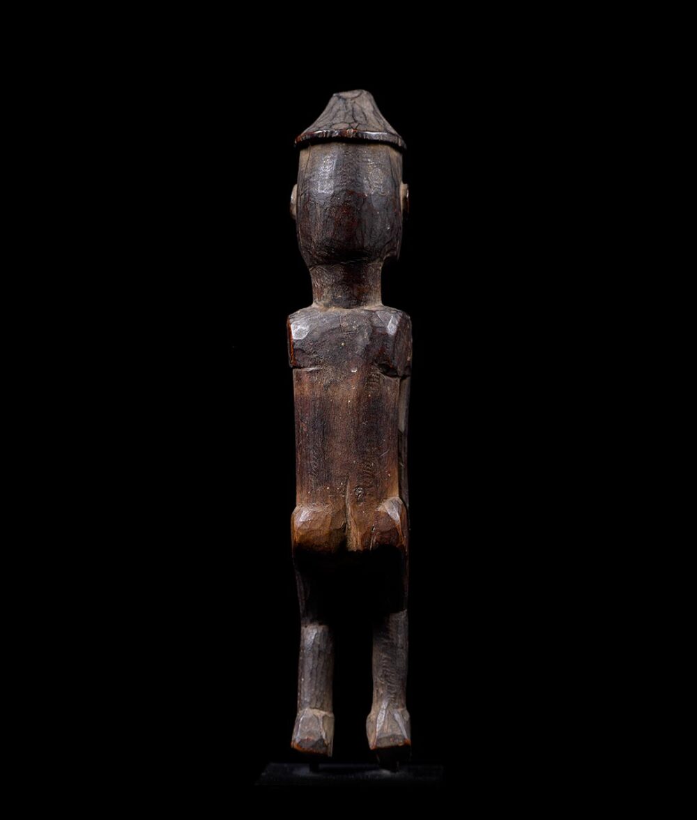 This particular figure represents the male of such a pair. Its smooth, dark patina accentuates its bold yet harmonious features. Around the waist, the patina is noticeably lighter, as the area was originally covered by a cotton loincloth, preventing the natural accumulation of patina over time.