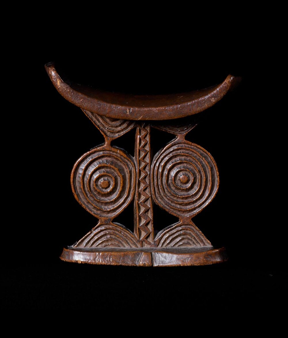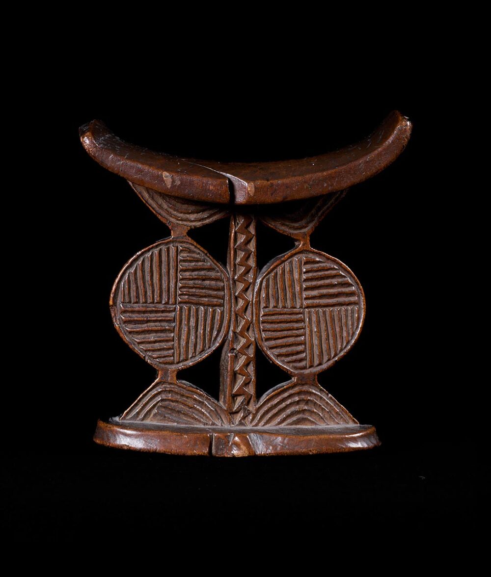 Shona sculptors have imbued the tradition of carved wooden headrests in southern Africa with distinct artistic interpretation. This well-worn and deeply patinated headrest exemplifies the style favored by Shona sculptors in eastern Zimbabwe, which extends into Mozambique. Eastern-style headrests typically feature a rectangular upper platform adorned with decorative elements like carved lozenges, parallel or zigzag lines, and triangular patterns. The base of these headrests is often figure-eight-shaped and gently tapers toward the central support.