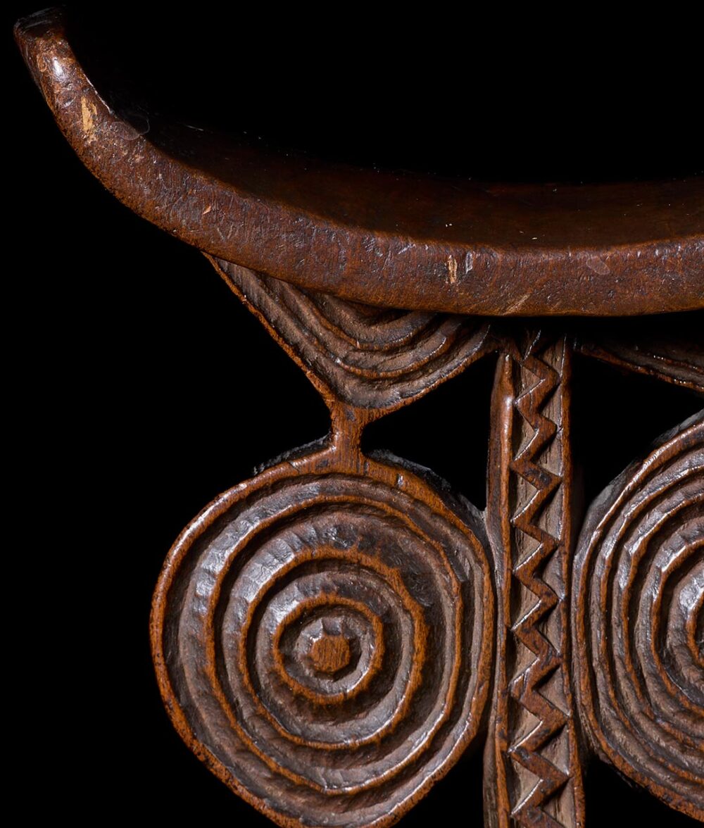 The central support on one side is composed of V-shaped motifs, both upward and downward, interspersed with circular motifs. These motifs are intricately decorated with parallel lines, zigzags, and concentric circles. The concentric circles may symbolize conus shell disks (ndoro), historically associated with prestige, leadership, and spirit mediums in the region. However, the exact meaning of these motifs remains a subject of scholarly debate.