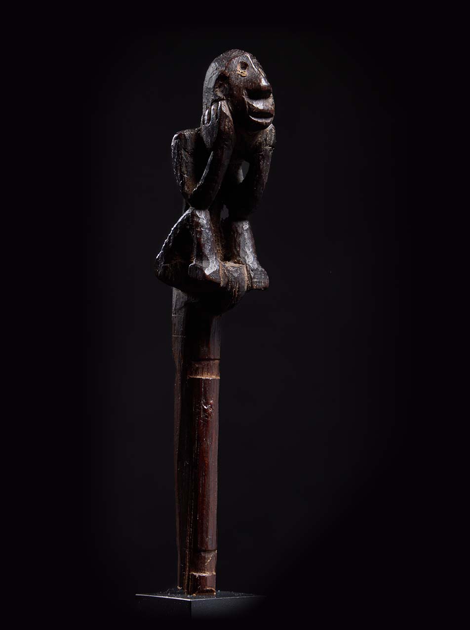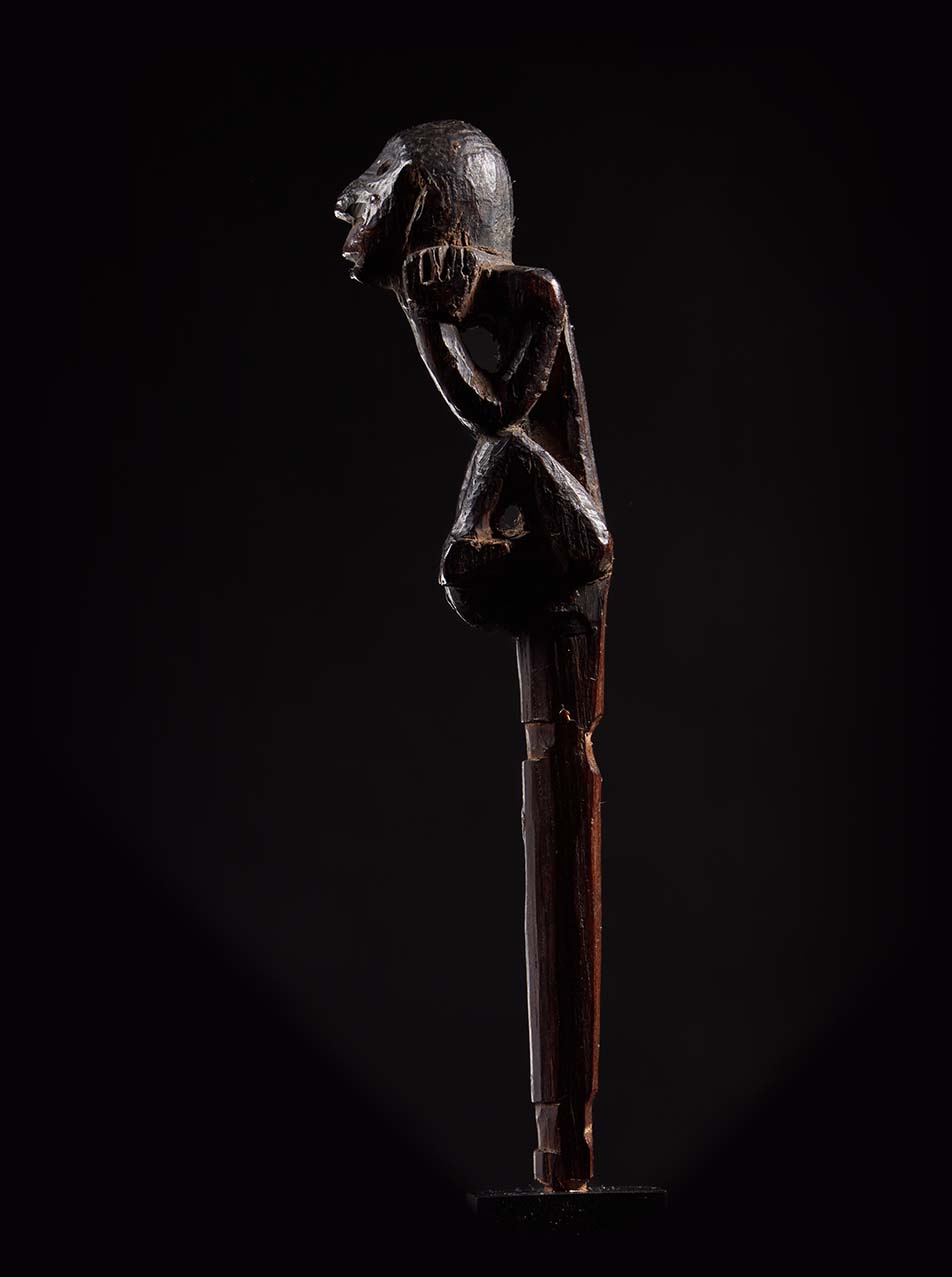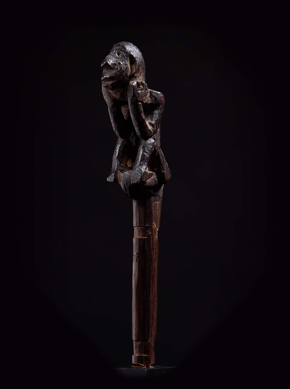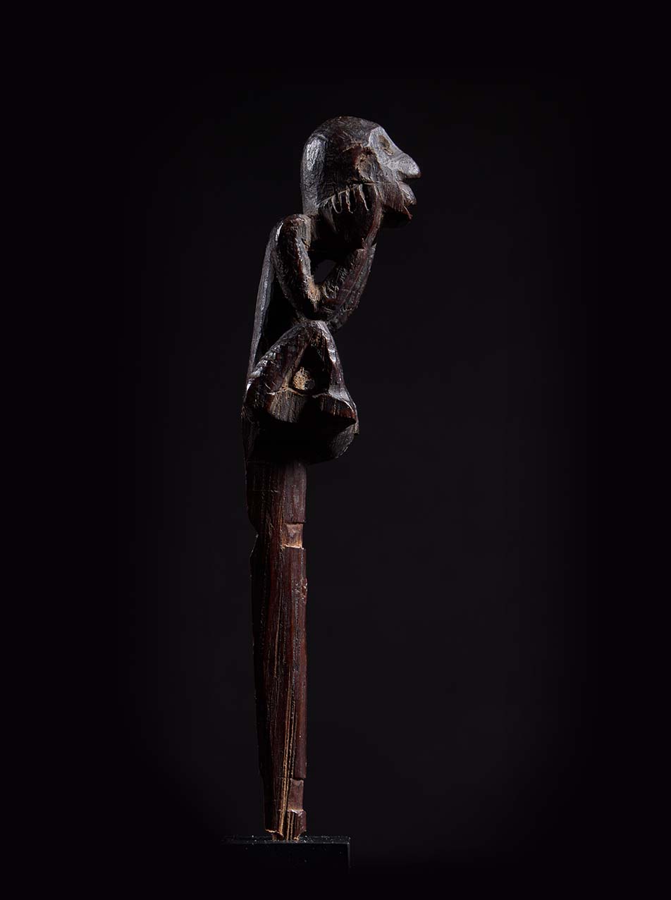 The sculpture is wonderfully animated. The figure crouches forward, elbows resting on its knees, hands pressed to the sides of the face in a pose of intense concentration—almost as if listening to the spirit world. The elongated head, pronounced nose, and open mouth give the figure a haunting presence, while the compact body and sharply angled limbs create a dynamic silhouette. Over time the hardwood has developed a deep, glossy ritual patina, the surface worn smooth by handling and years of ceremonial use. Part support, part guardian spirit, this small figure embodies the charged intersection of sculpture, ritual practice, and shamanic power that defines the art of the Dayak peoples.