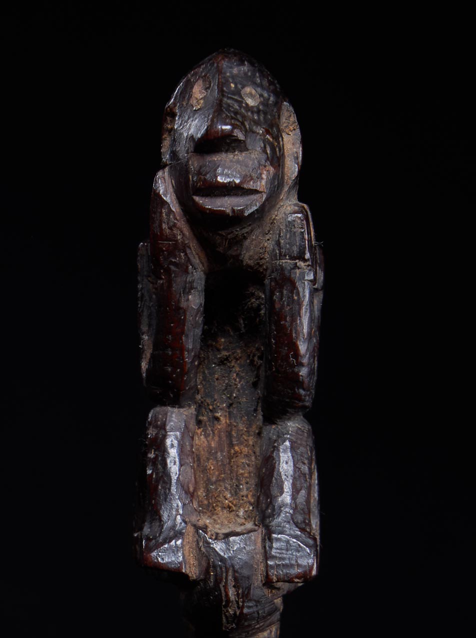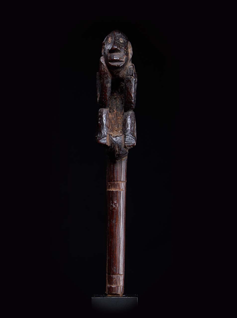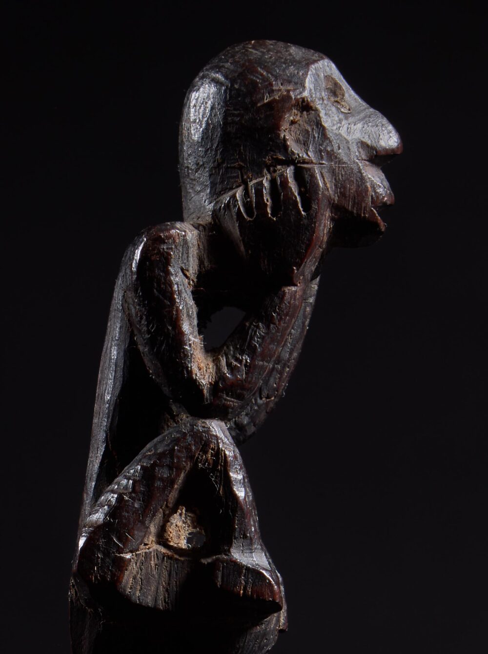 The sculpture is wonderfully animated. The figure crouches forward, elbows resting on its knees, hands pressed to the sides of the face in a pose of intense concentration—almost as if listening to the spirit world. The elongated head, pronounced nose, and open mouth give the figure a haunting presence, while the compact body and sharply angled limbs create a dynamic silhouette. Over time the hardwood has developed a deep, glossy ritual patina, the surface worn smooth by handling and years of ceremonial use. Part support, part guardian spirit, this small figure embodies the charged intersection of sculpture, ritual practice, and shamanic power that defines the art of the Dayak peoples.