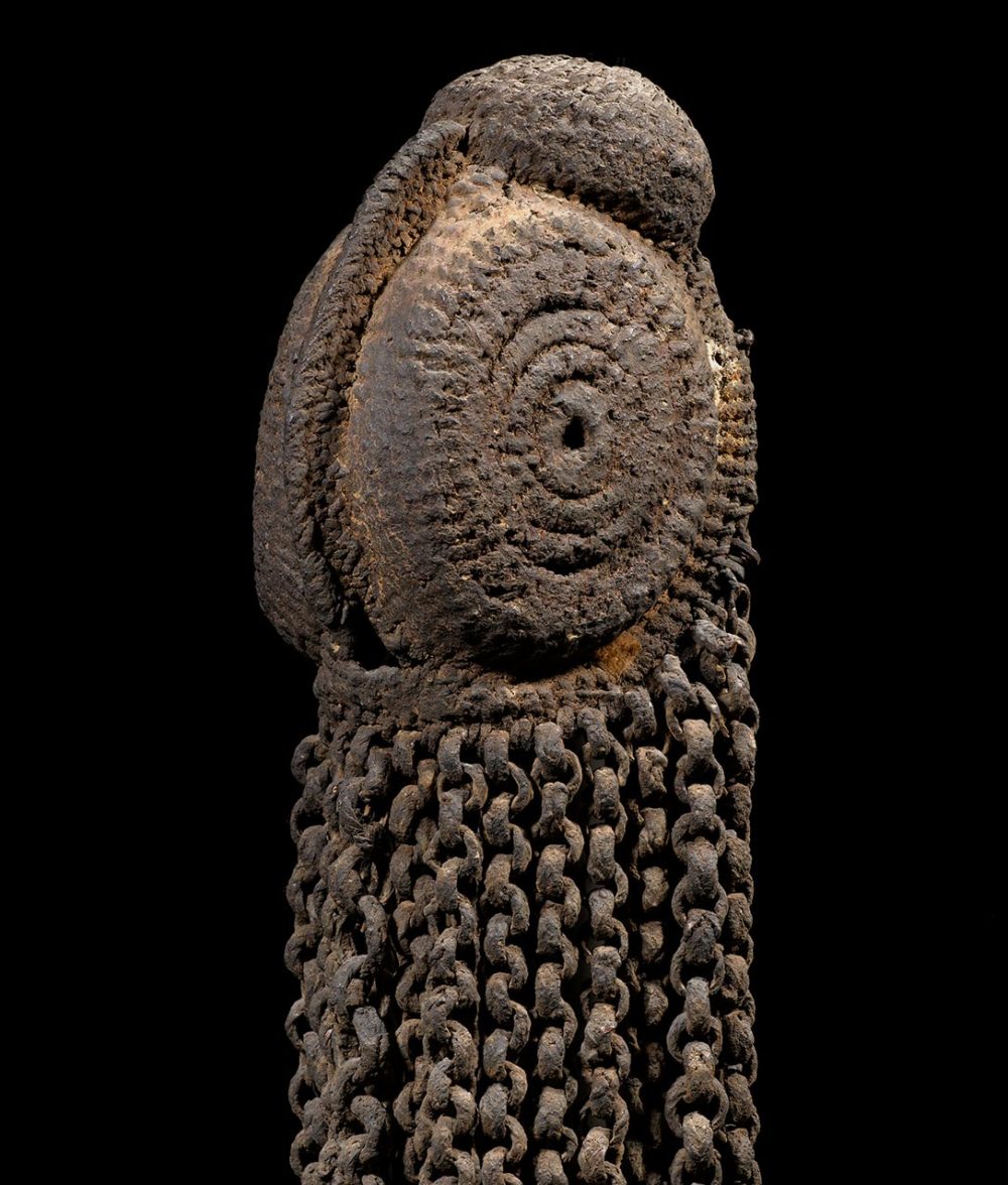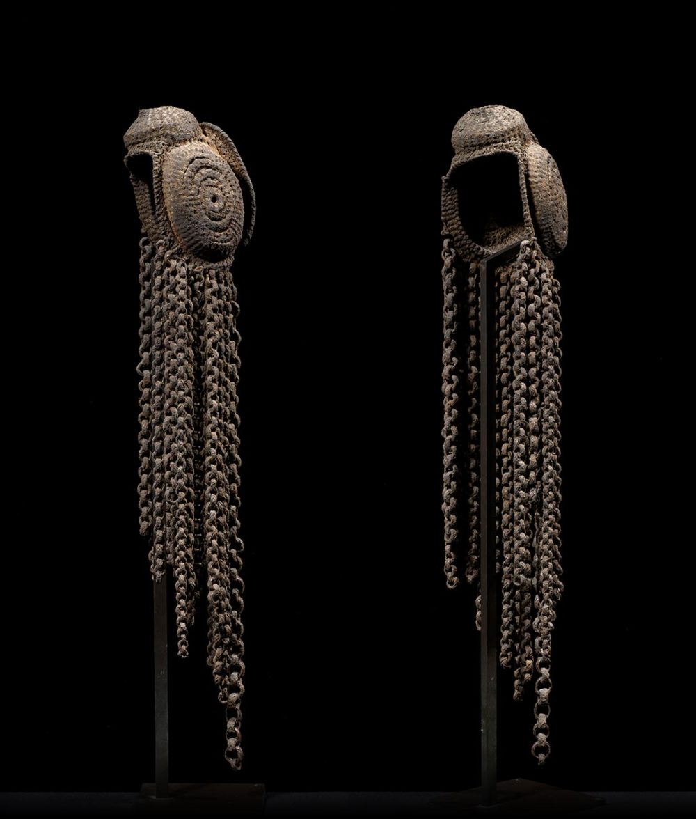 Often mistakenly referred to as Yam Masks, this small mask with woven chains would have been worn on the backside of a young male initiate’s headdress, during an important ceremony. The mask is made from tightly woven cane, which has remains of heavily encrusted brown pigment. In excellent condition.