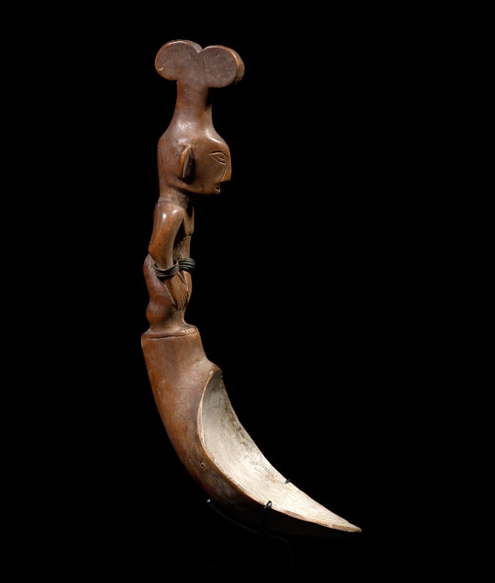 This is a classic example of an Ifugao spoon. The figure possesses beautiful balance with curves and sweeps in the body; as well as an expressive face with a classic circular double top knot above the head.