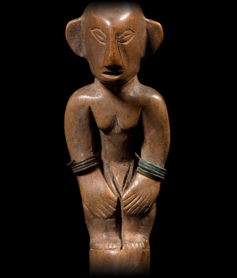 The deeply shaped bowl is elegant as well, and appears to have been discolored over time from use. Wrapped around the figure’s forearms there are two bracelets made with copper wire. The spoon has a deep honey brown patina and it is varied.