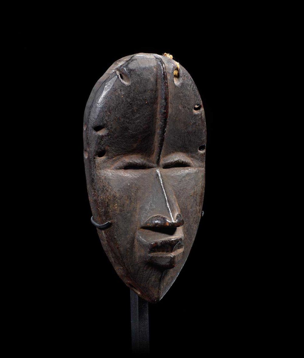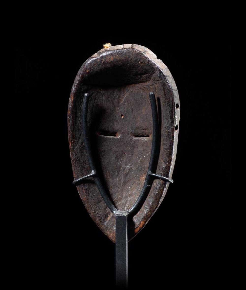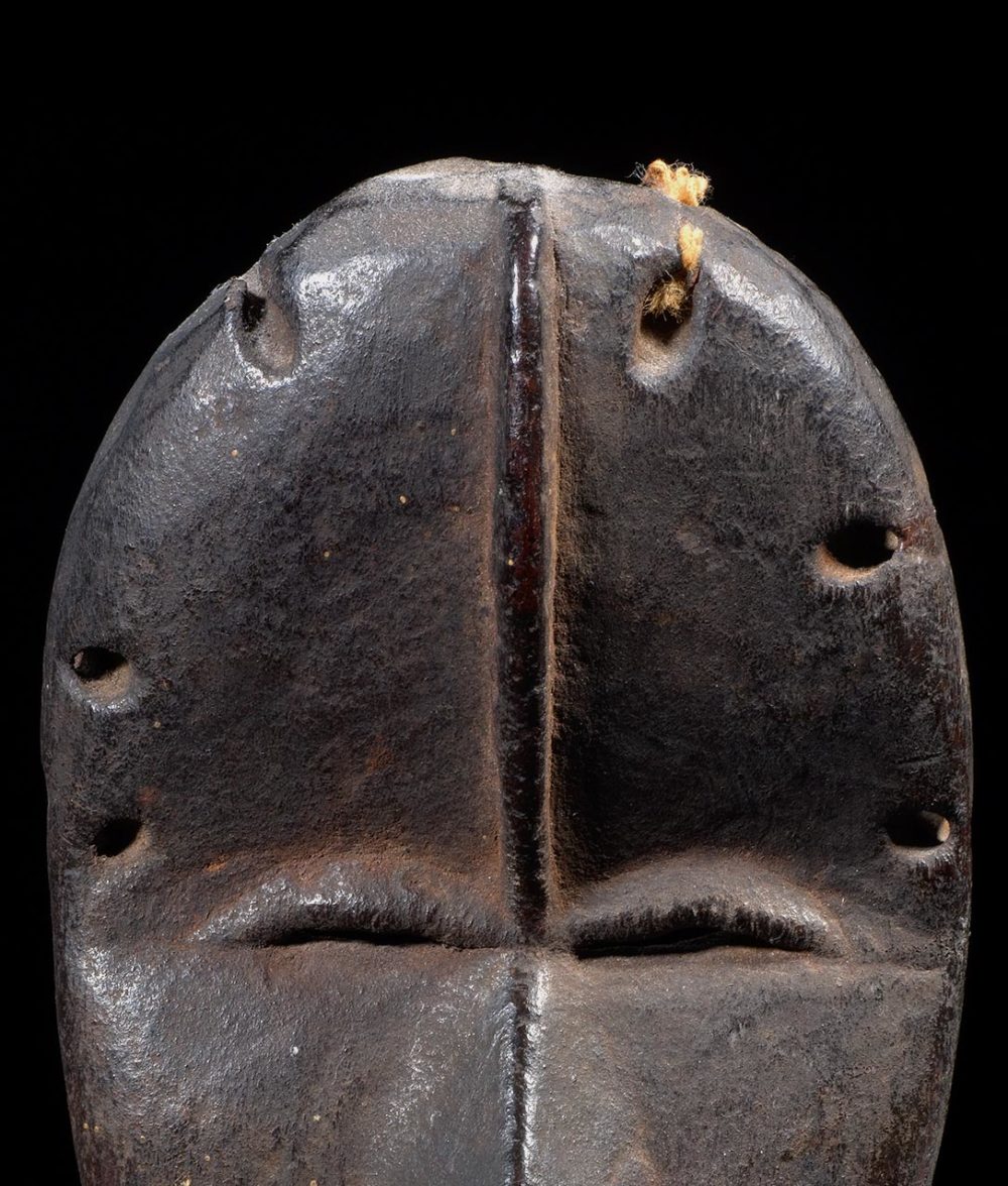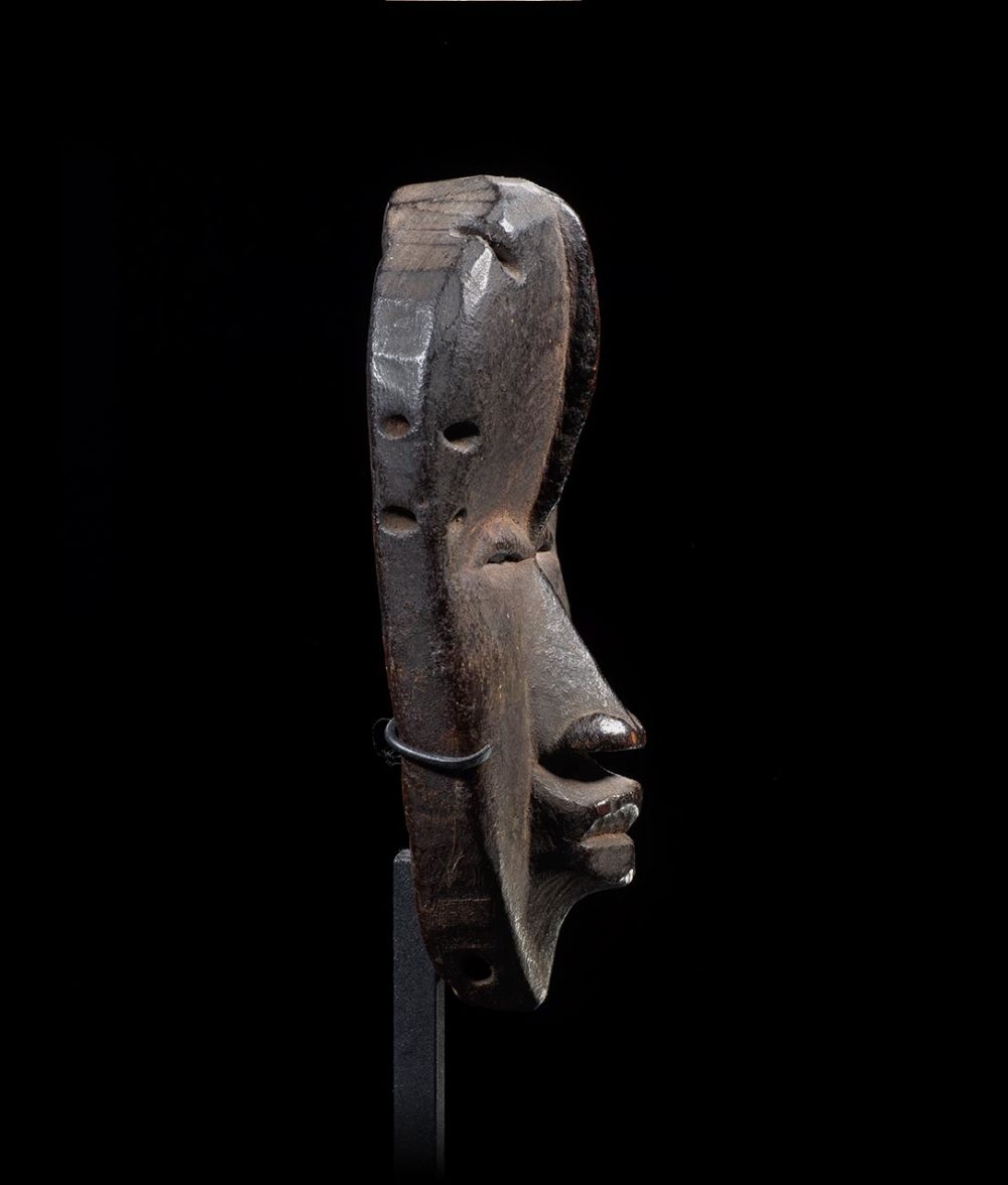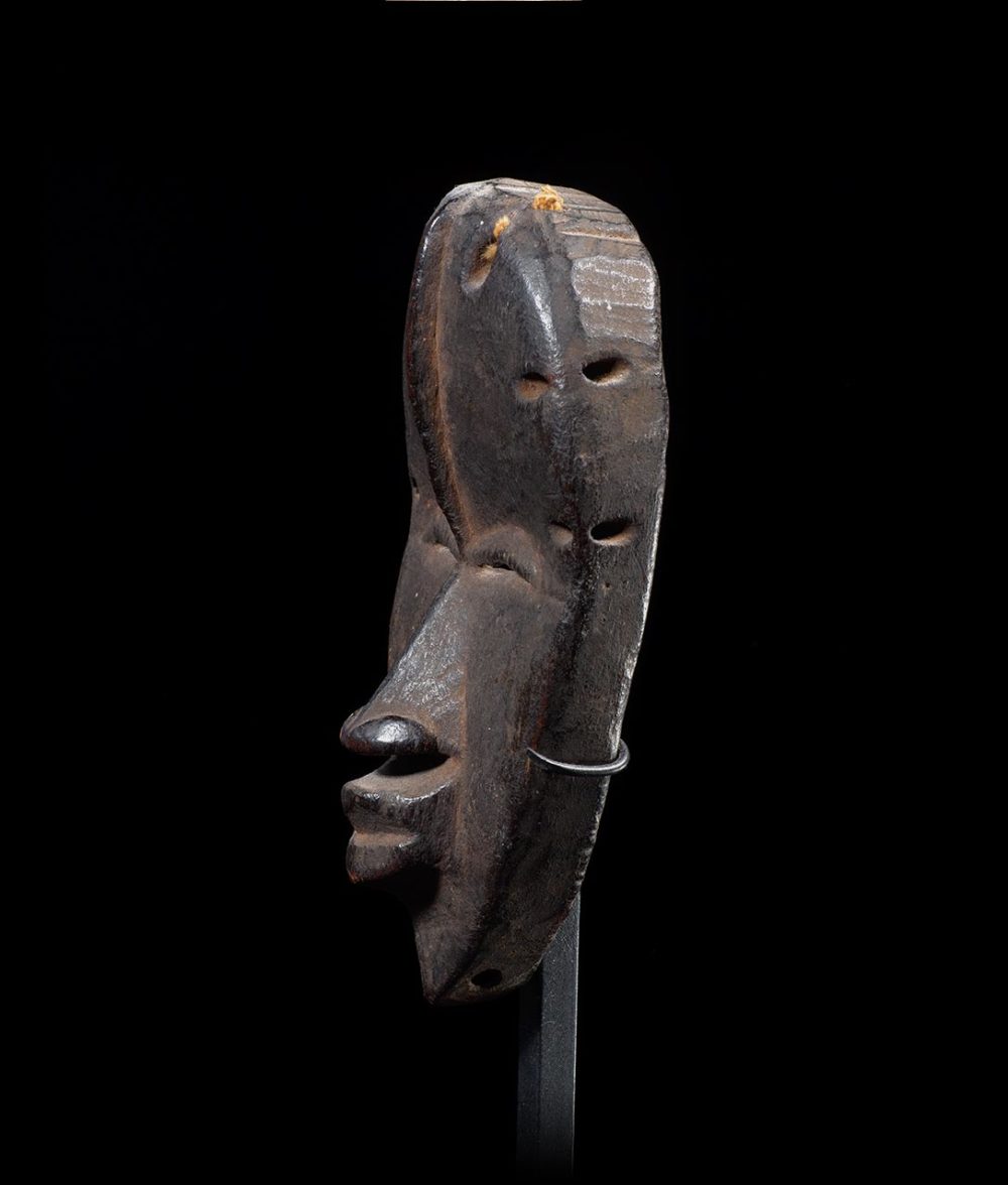 Traditionally known as Ma-Go, this mask is a superb and very old example. Its face is minimal in conception. There is a medial ridge that traverses down the forehead, connecting to the bridge of the nose. The ridge is intersected by the thinly carved eyes. The mouth is raised and square in shape. This example is carved with very hard wood and has a wonderful rich blackened patina. The numerous piercings found on the sides of the mask are extremely well worn; attesting to the decades of use and handling.