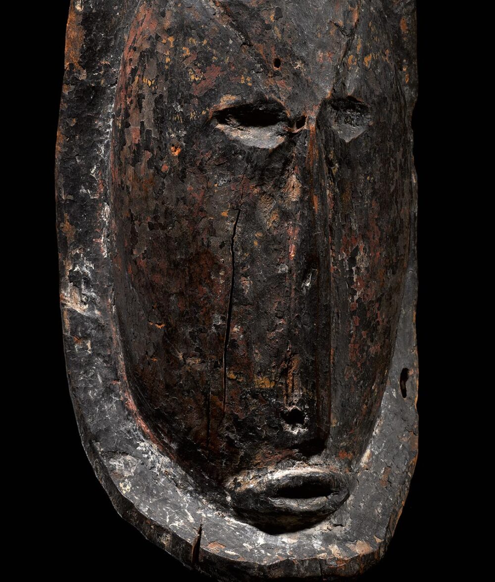 Wooden Yam masks are much rarer than the ones woven with rattan. The long wooden post projecting from the bottom was used to attach the mask to a large yam. This sculpture is an early example, pre-contact and was carved using non-metal tools. Its presence is very powerful, and commands ones attention with its large oversized head and dark glossy patina on its post and back. Also of note is the small piercing through the bottom of the nose. Remains of multiple layers of old pigments used to decorate the head can be seen covering the entire surface.