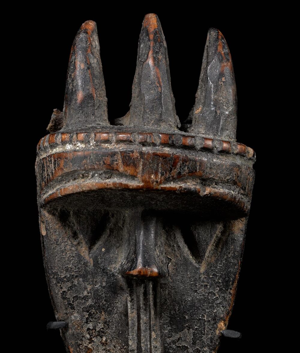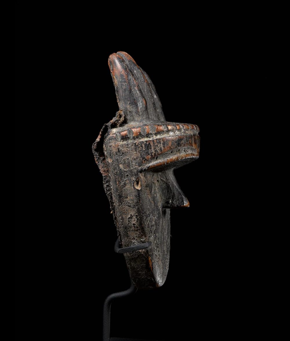 This is a superb miniature angbai Loma mask. Its small scale is noteworthy because of its rarity; full size masks are much more common than this particular type. The overall quality is outstanding. The sculpture is tight; carved from a very hardwood with an incredible rich yet raw ‘bush’ patina. On its back the mask still retains its original fetish pack made from sacrificial materials, it is covered with a very dry and encrusted animal skin. The fetish charge is what gave this mask its power. In excellent “untouched” condition.
