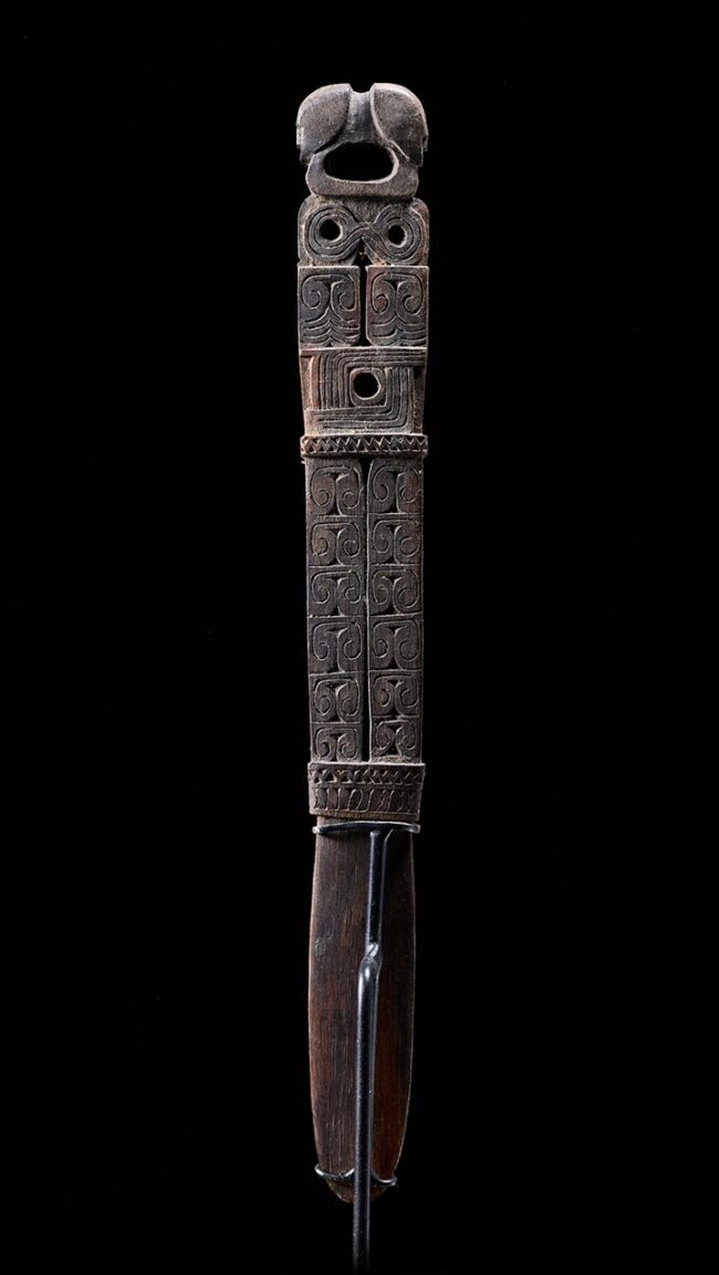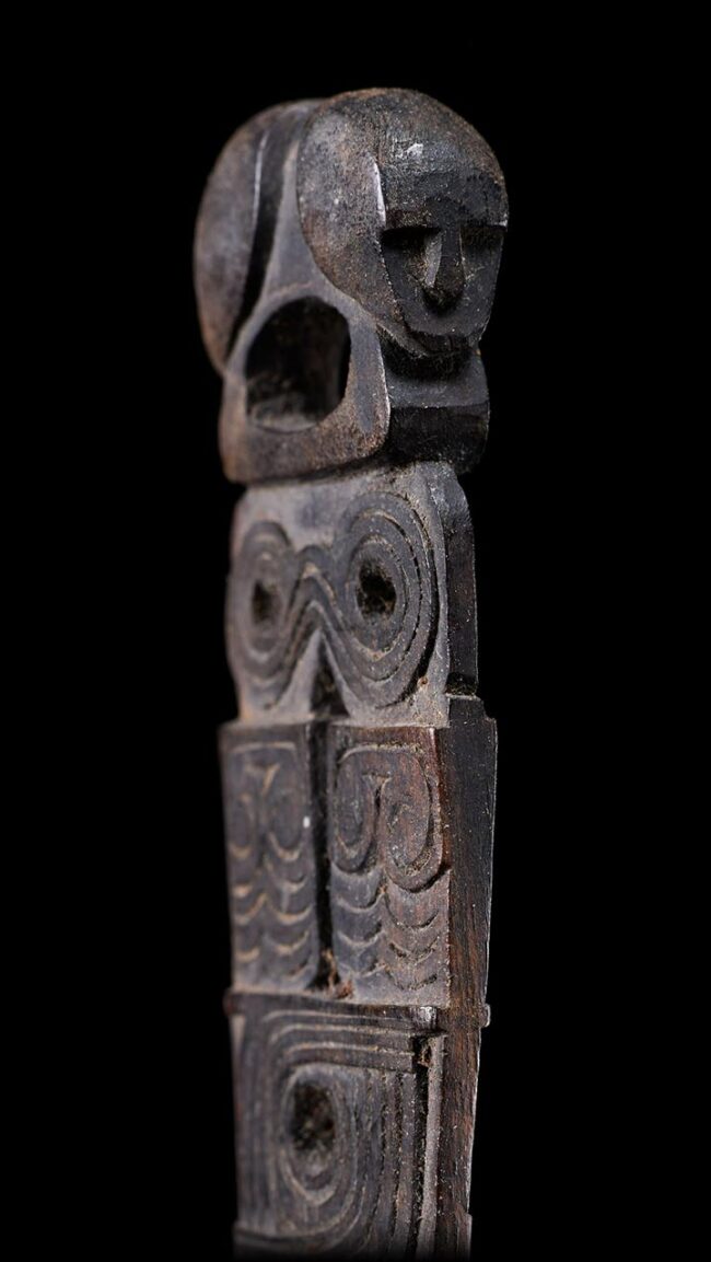 Beyond its aesthetic appeal, this spatula once served an important practical role. It was used in the preparation of lime, a vital component in the ritual chewing of betel nut—a deeply rooted social and ceremonial practice in Trobriand Island culture. Both utilitarian and symbolic, this piece reflects the seamless integration of art and daily life in Oceanic tradition.