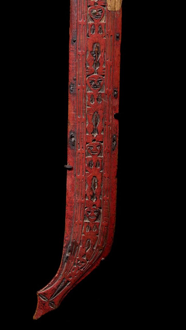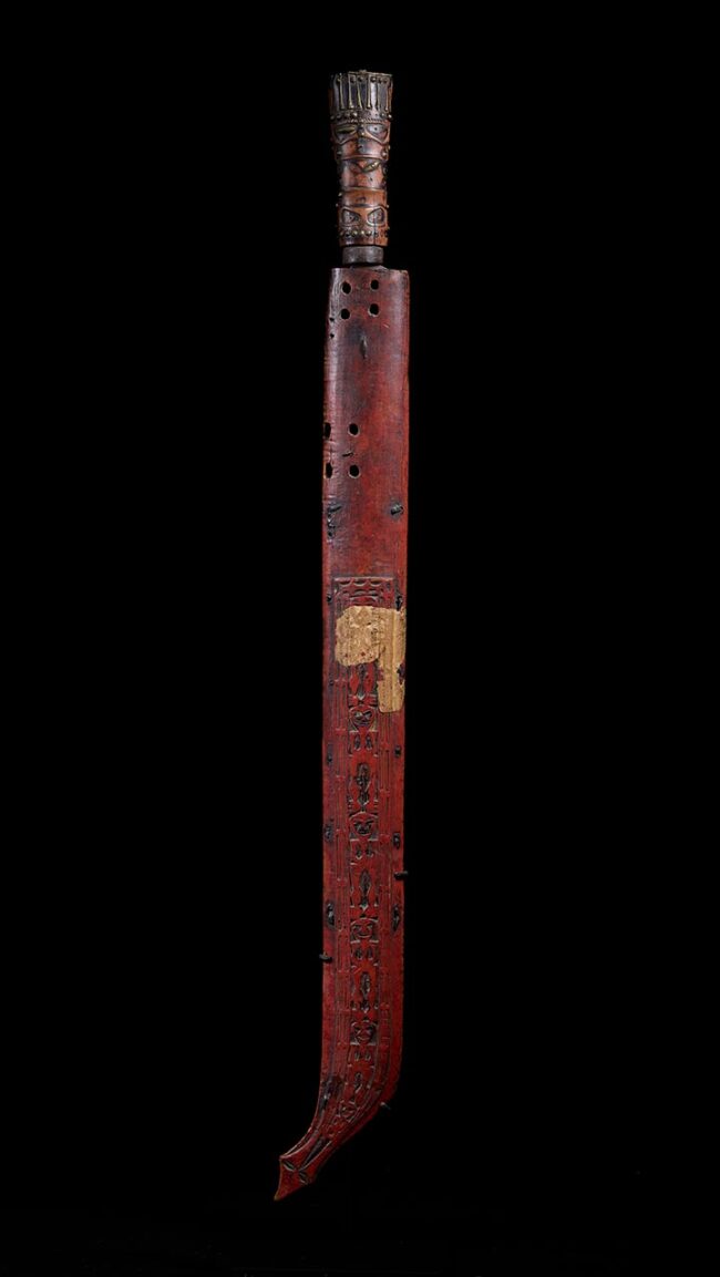 Equally remarkable, the scabbard is decorated with a cascading row of stylized human figures, carved in relief and enhanced with red pigment. A very old label, possibly from the 19th century, remains affixed to the uppermost figure—evidence of early collection or documentation, likely during Taiwan’s Qing Dynasty or early colonial periods.