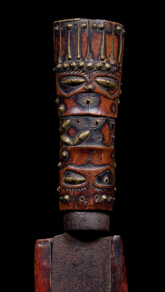 The abstract faces carved into the handle are thought to represent ancestral spirits, protective guardians, or deified forebears, reinforcing the sword’s role as a conduit between the living and the spirit world. The row of figures on the scabbard likely symbolizes genealogical continuity or the collective strength of the ancestral line, visually narrating a lineage of power and protection.