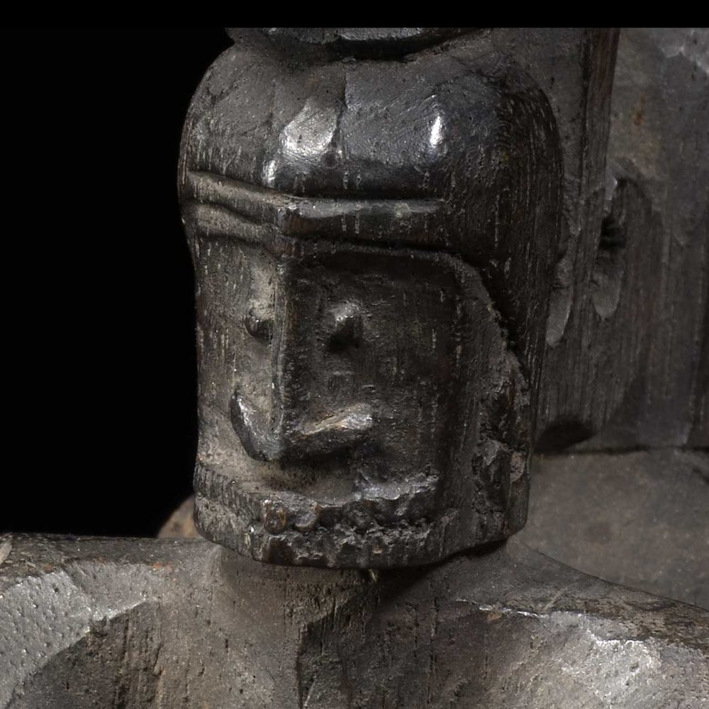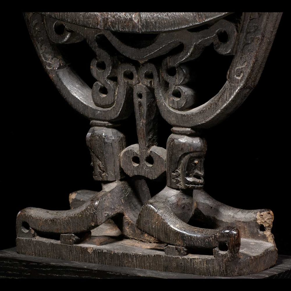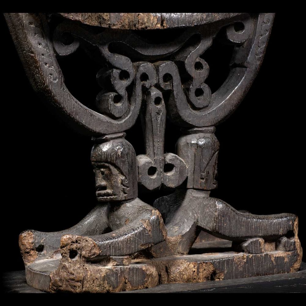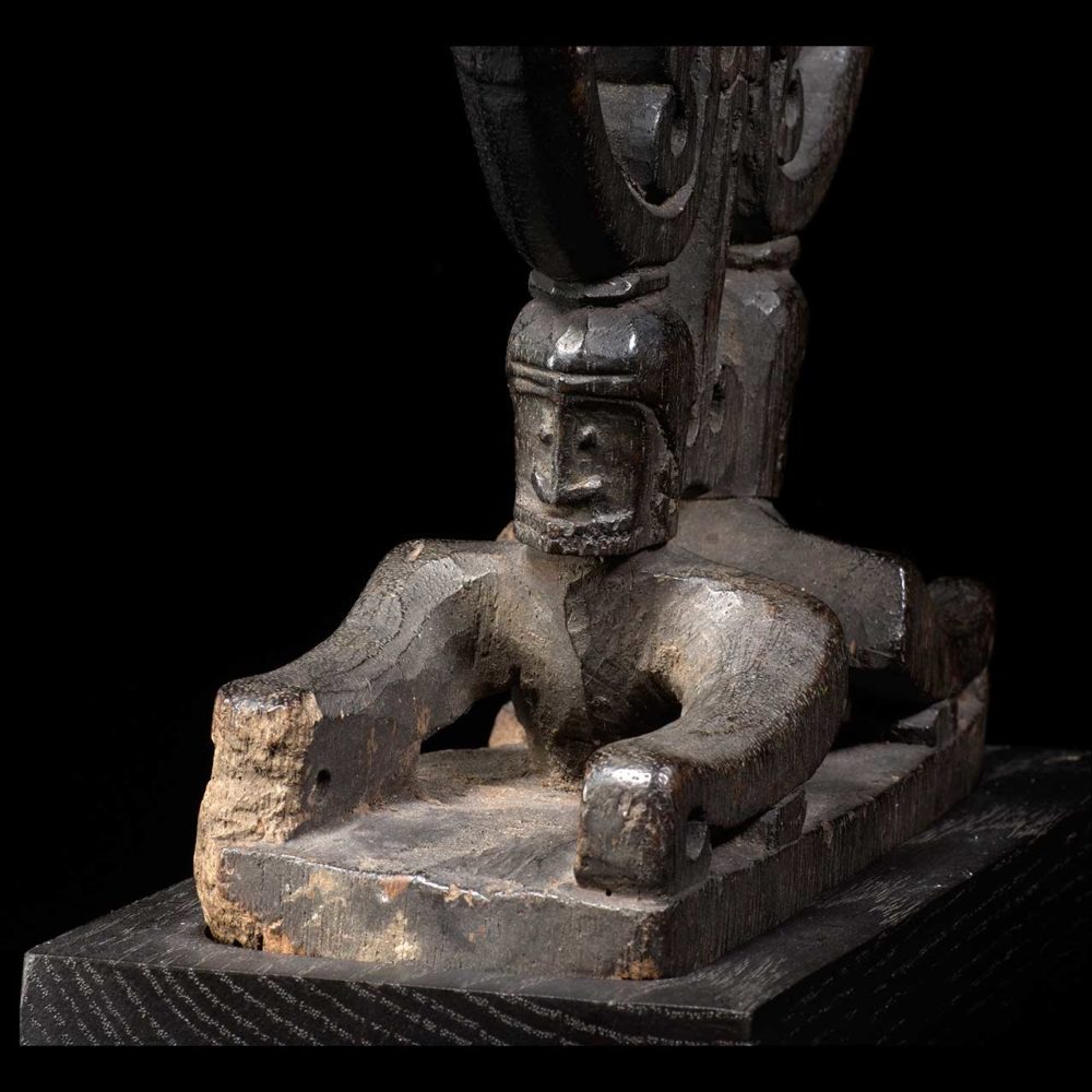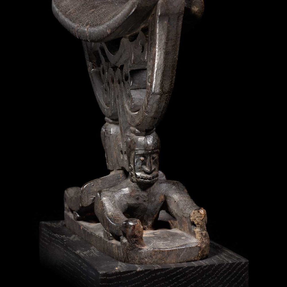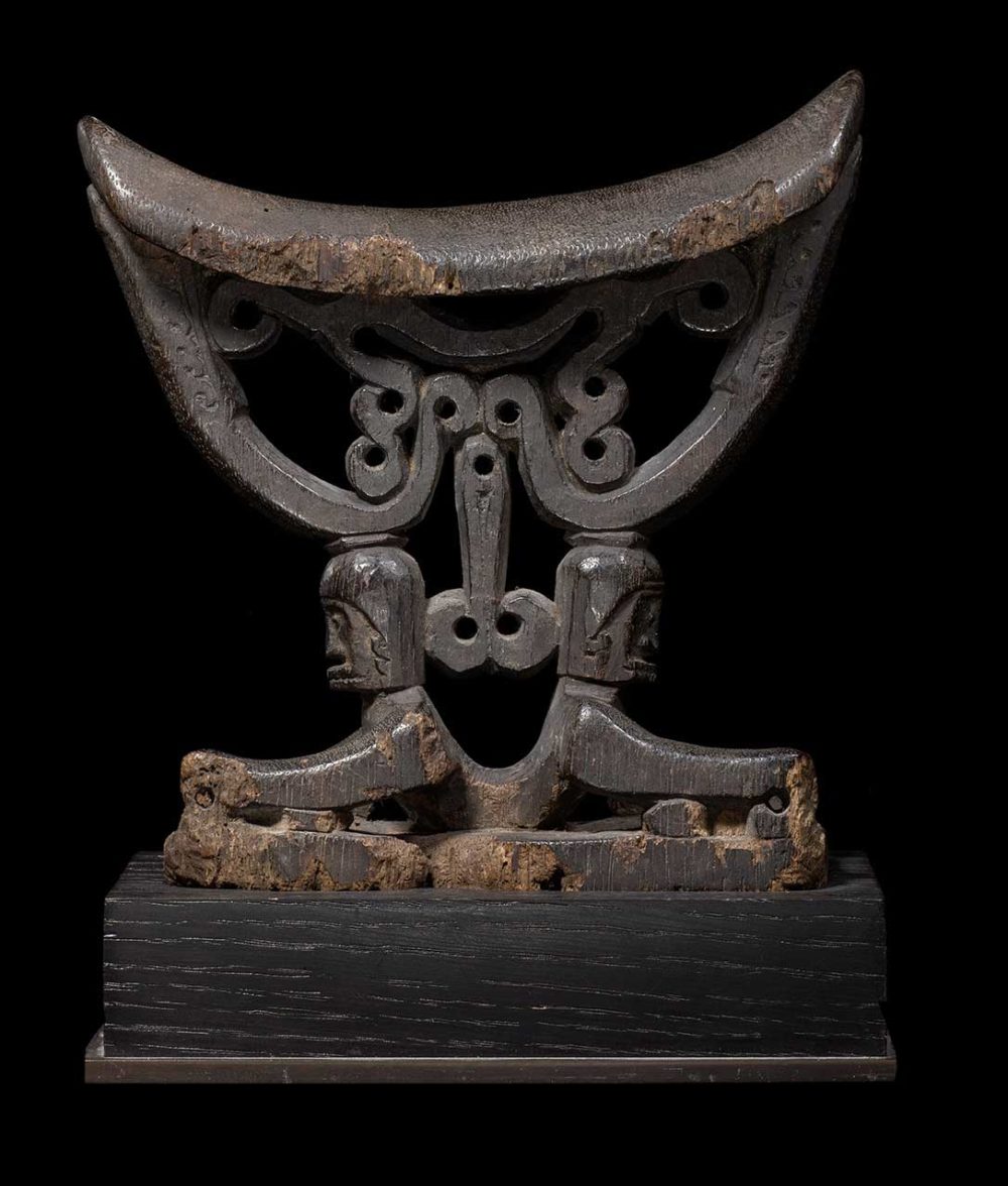 This very rare and fine headrest on two reclining Korwar figures has wonderful aged patina and wear. The curved and facetted neck-bar is placed atop two rising arches representing mythological crocodiles with open maws.