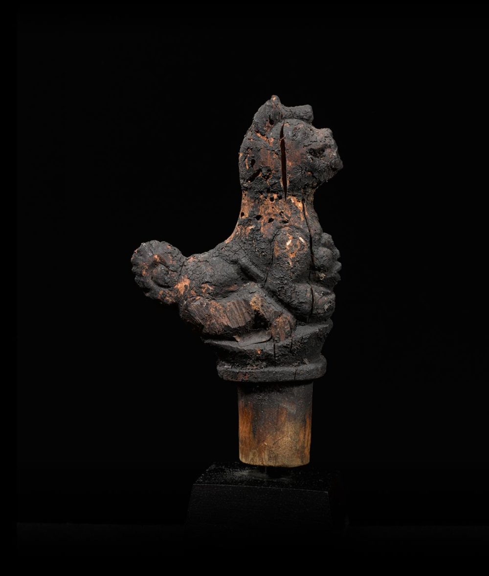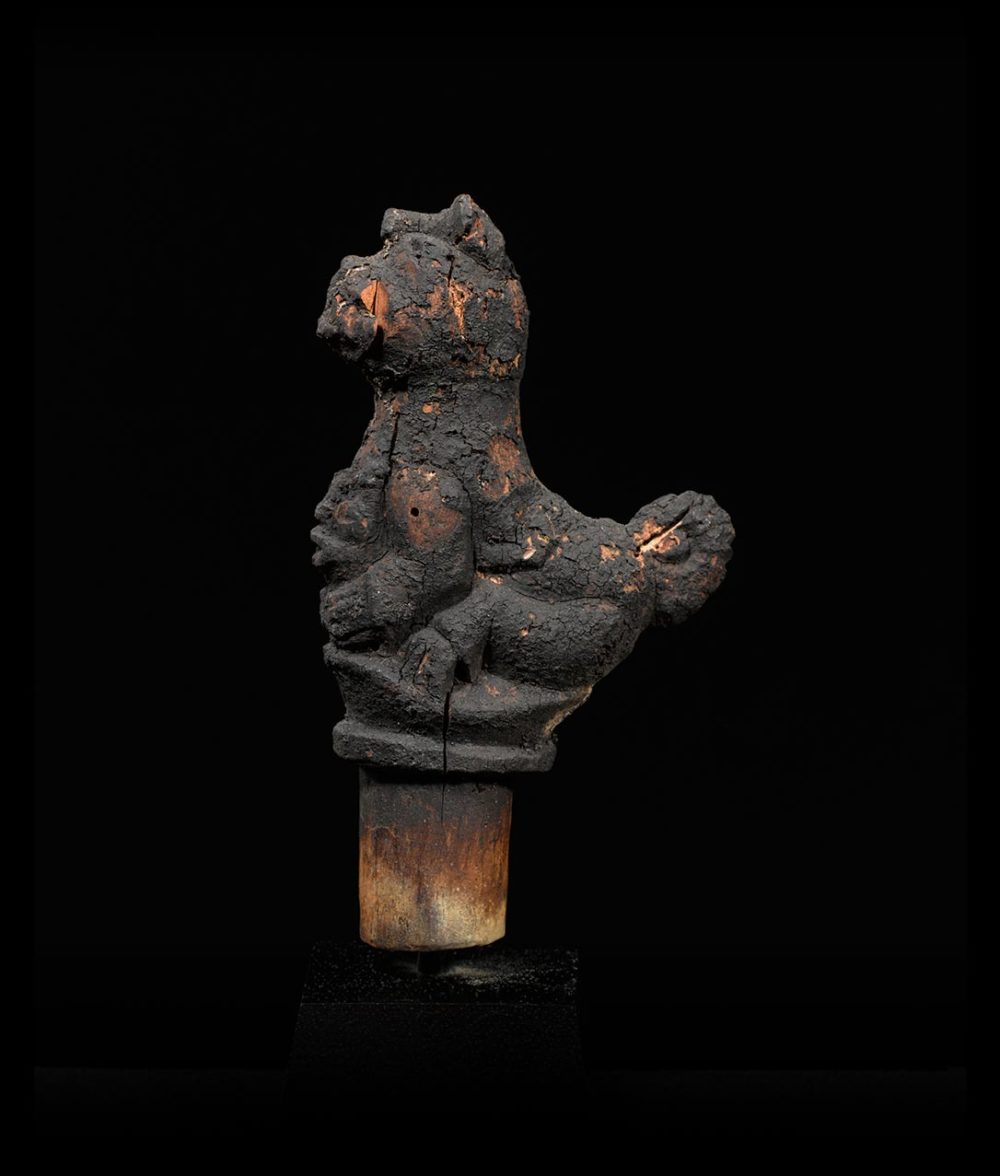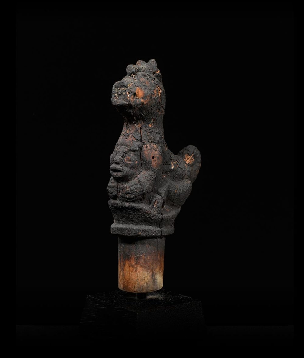 This finely carved medicine stopper consists of a Tiger-Cat creature holding the head of an ancestor between its arms. There is great tension in the body of the Cat as if it’s ready to spring out into motion. Contrary to appearances; the holding of the head may symbolize protection of the human figure. The expressive faces of both figures are very aggressive. The patina is varied and heavily encrusted from years of ritual libations and use.