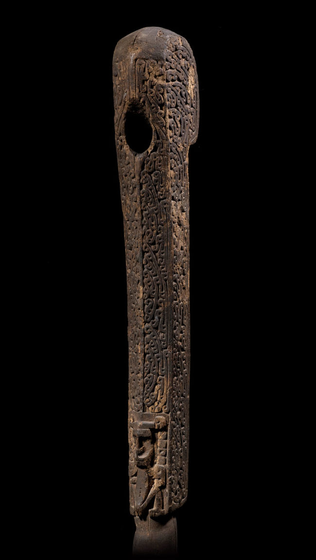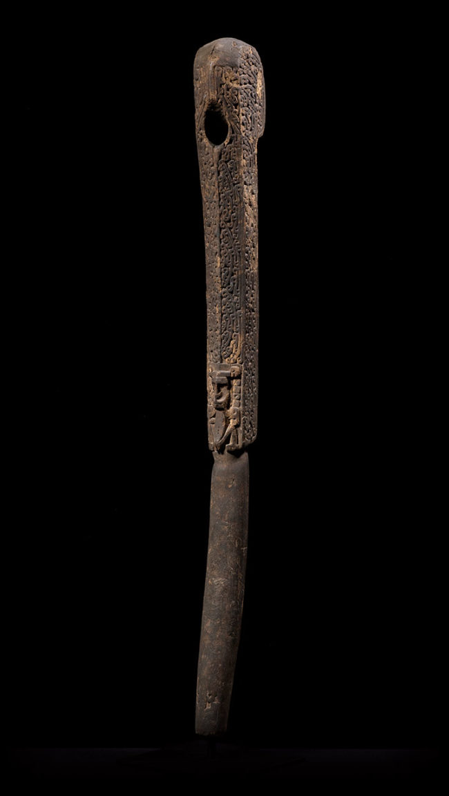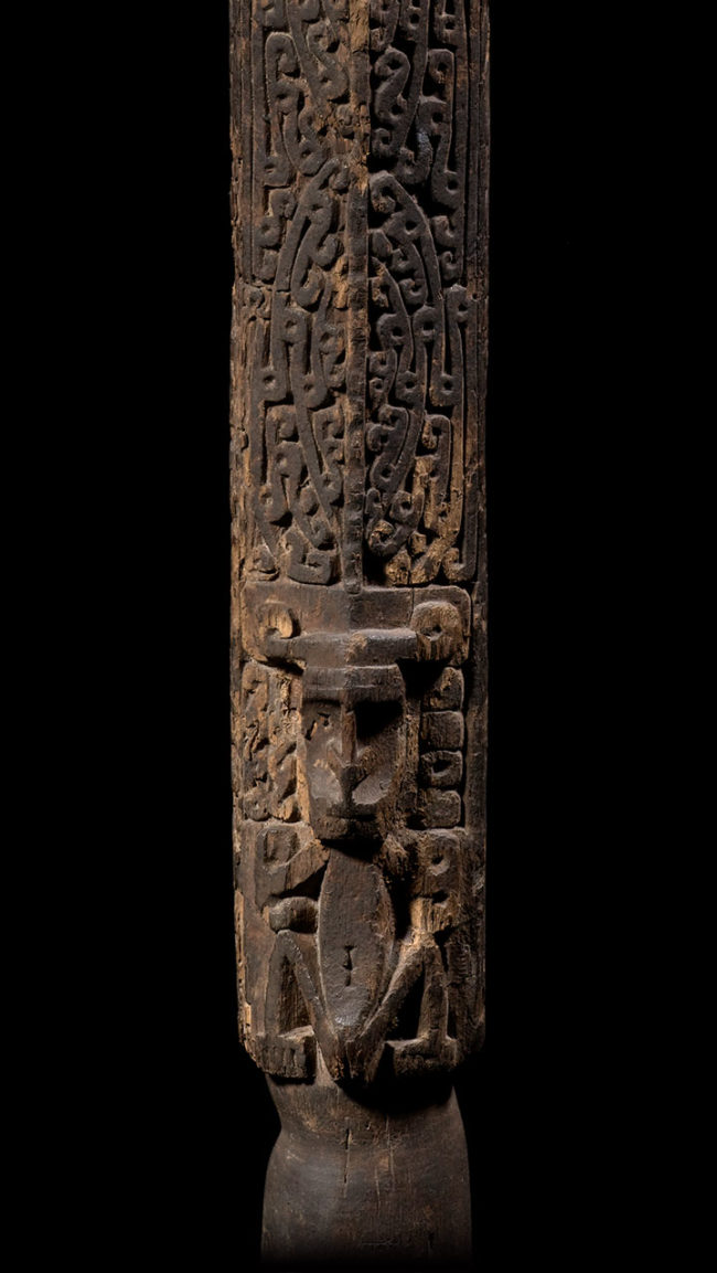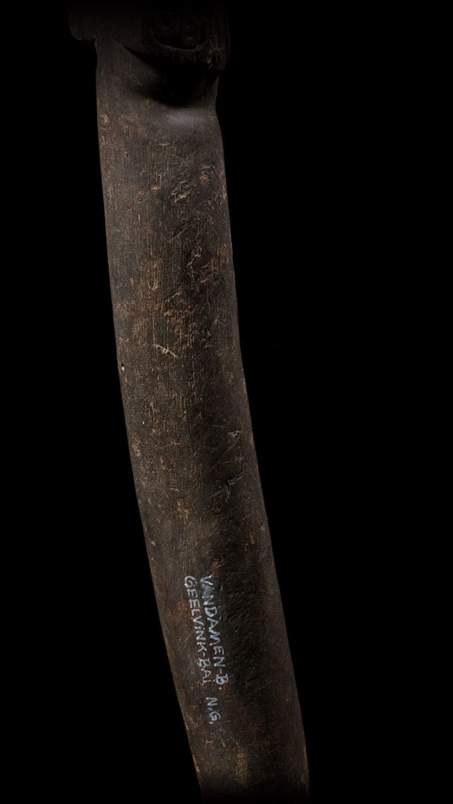 Ancestors played a vital role in the material culture for the people of West Papua. This pounder’s handle has a prominently displayed stylized crouching ancestor, carved in high relief. Above the figure, the upper portion is beautifully carved with curvilinear patterns. The surface is extremely well worn with an encrusted deep patina from many years of use. At the bottom of the shaft, painted museum style, in white, is the inscription, “ Vandamen-B. Geelvink-Bai. N.G.”