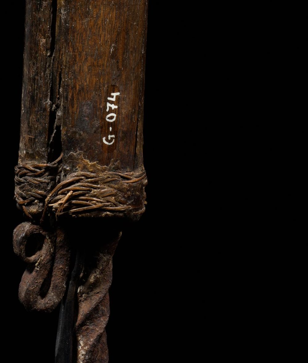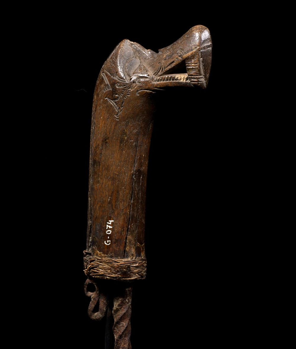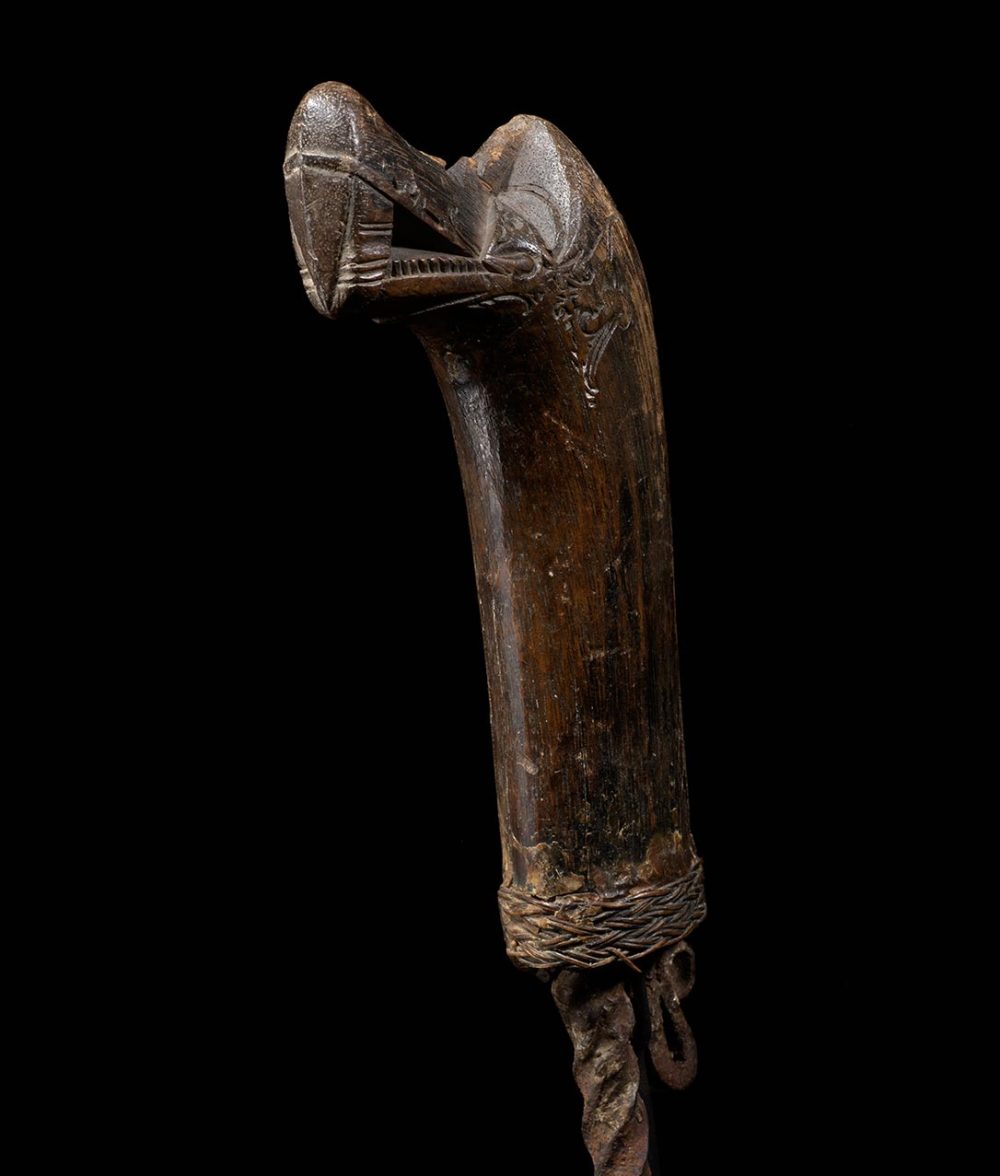 A richly patinated wooden Aso head surmounts the handle of this object; while the lower portion is elegantly forged by hand in iron with a corkscrew form. Coppens inventory numbers “G-074” is painted in white on the lower portion of the handle. In excellent condition.