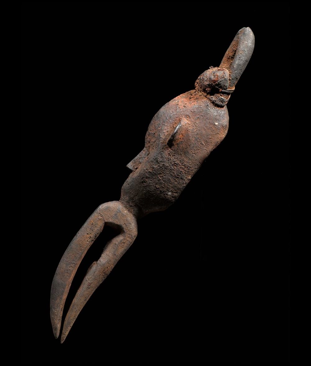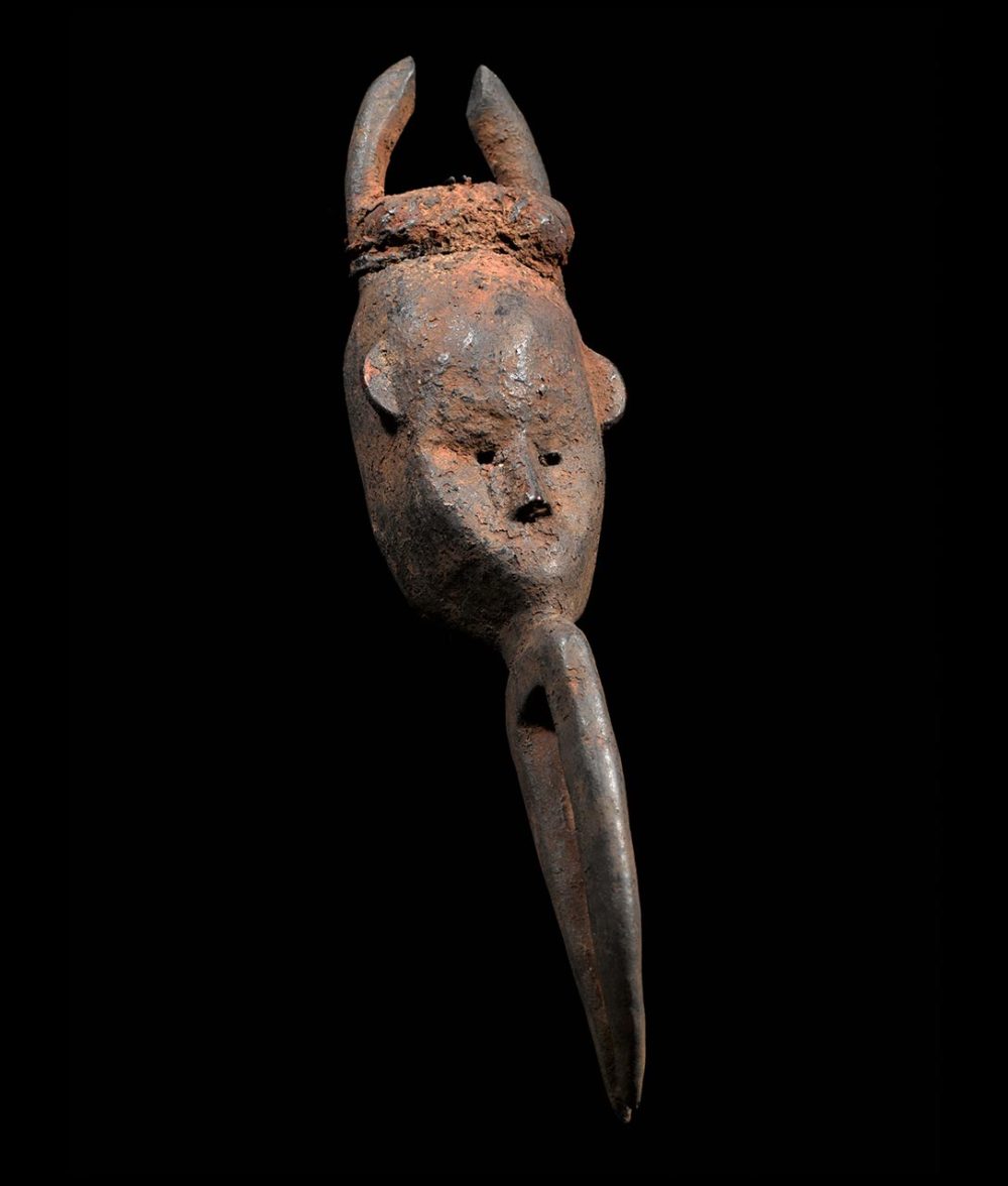 In the form of a sacred Hornbill Bird, this mask was originally owned by a family of farmers. The mask was kept on the family’s sacred shrine, and helped to protect its owners. It exhibits a thick encrusted patina from numerous libations performed in order to protect the family from harm and to ensure a beneficial harvest of their crops. At the top of the mask the original magic bundle is still intact; it consists of organic materials wrapped in cloth and string. The maskette is in excellent condition.