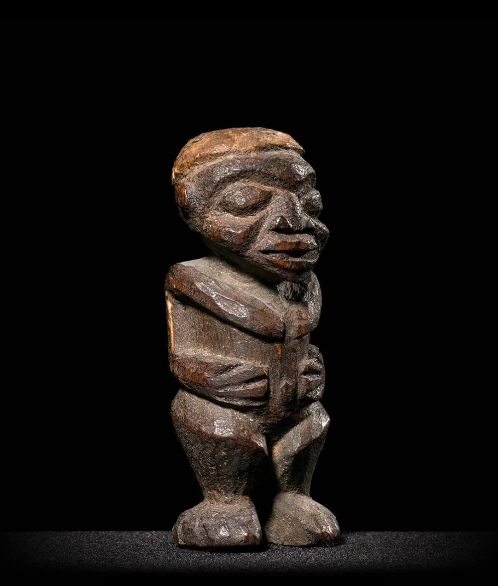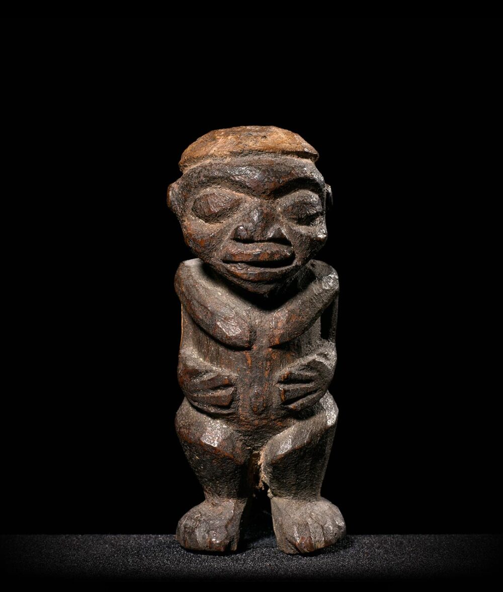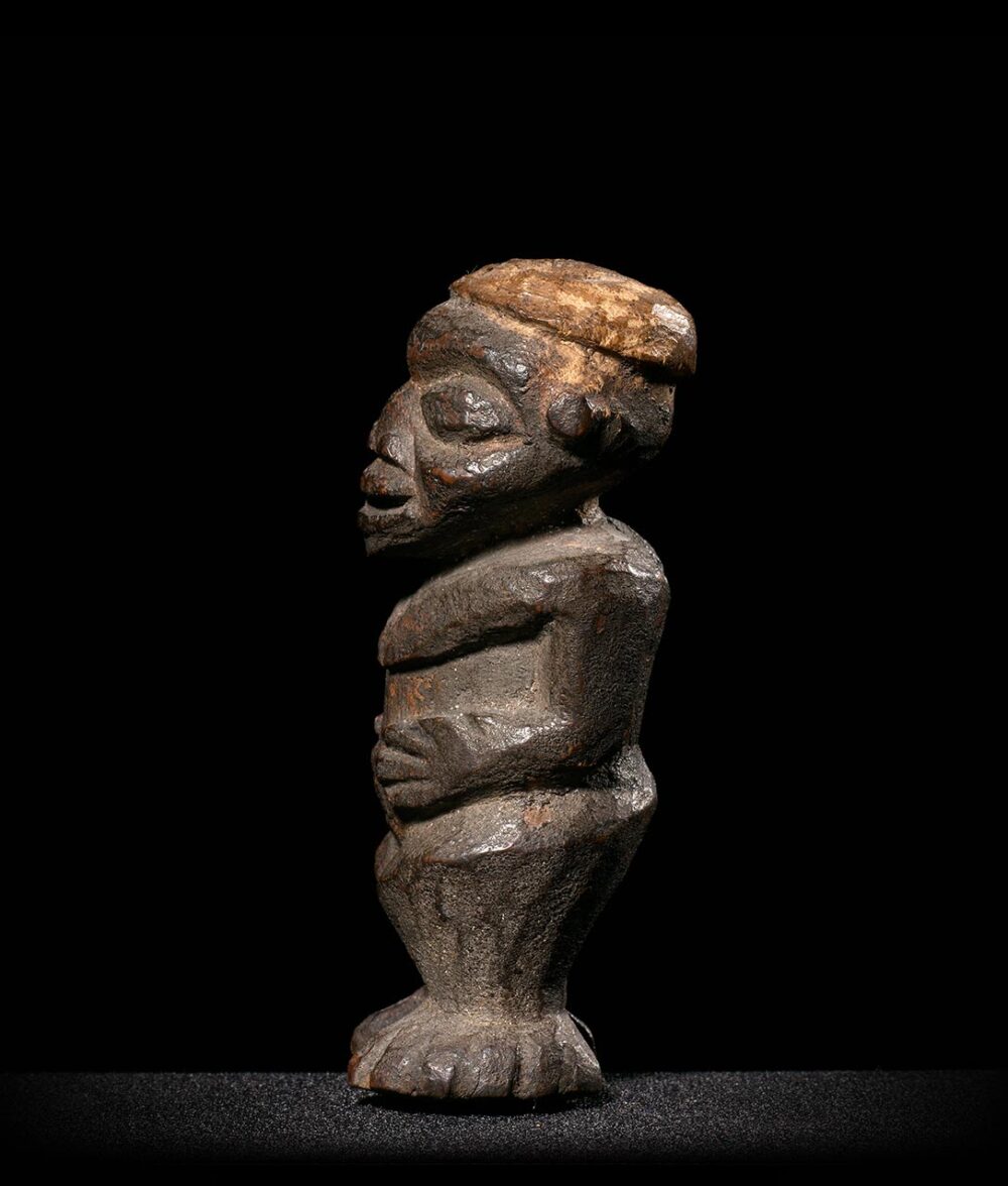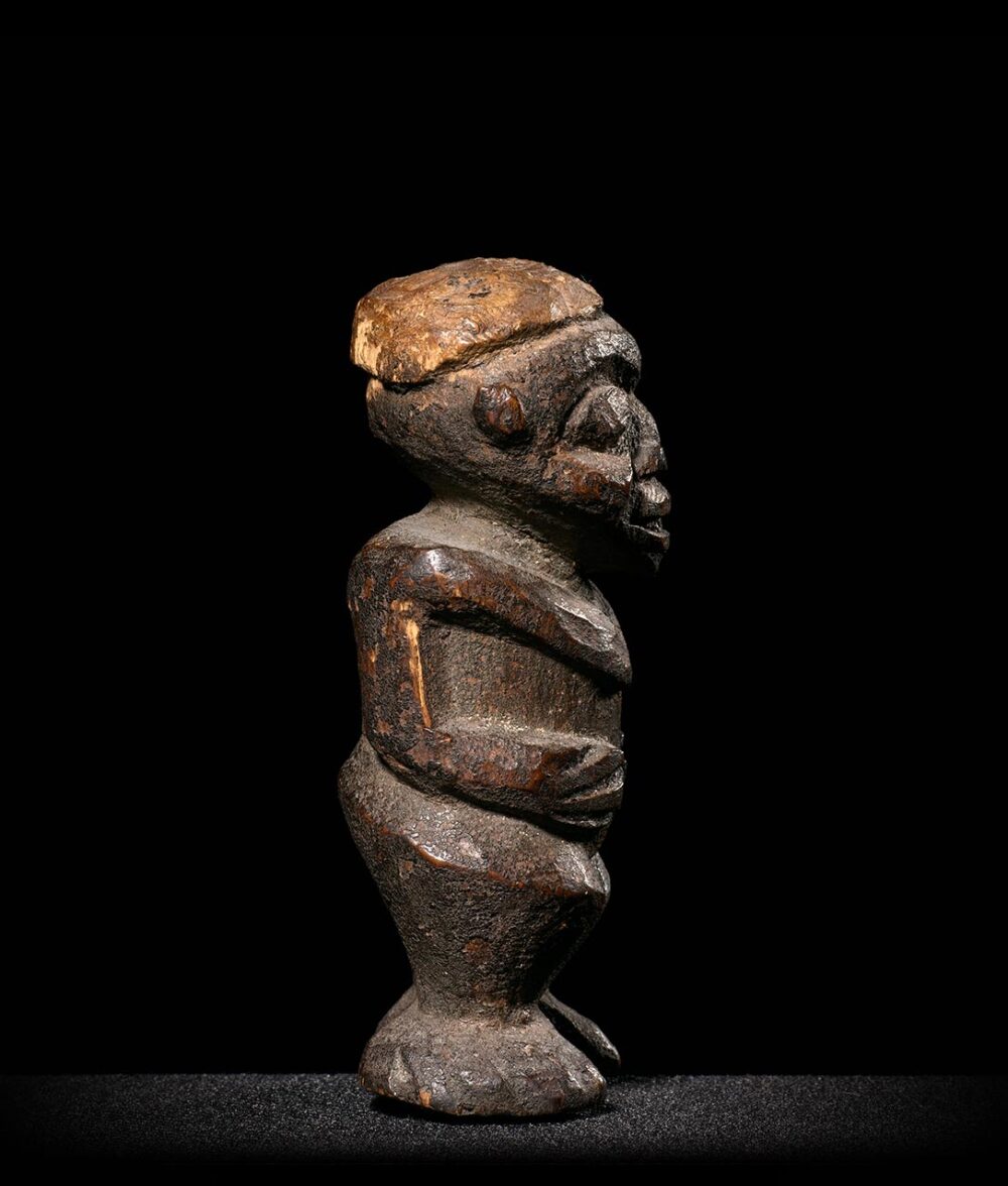 This wooden amulet figure from Cameroon is a wonderful example of African protective charms. With its naturalistic style and intricate details, this small yet powerful figure is a testament to the skill and creativity of the sculptor who carved it. Measuring just a few inches tall, it is a perfect size to be carried on one’s person or kept in a small bag for easy access. The expressive face of the amulet is particularly noteworthy, with carefully carved features that seem to convey a sense of strength and determination. Its compact body is also impressive, with a level of detail that suggests the sculptor was intimately familiar with the human form. The use of a medium density wood has resulted in a dark, rich patina that adds to the sense of history and mystery surrounding this amulet. One made by the same hand can be found in “Wild Spirits Strong Medicine” the exhibition catalog from the Museum of African Art 1990, fig. 116.