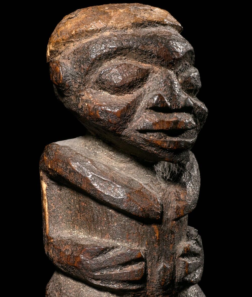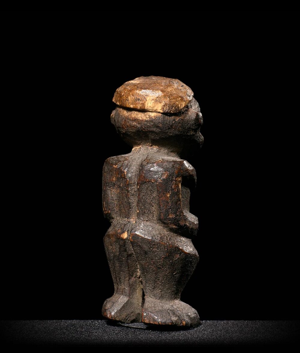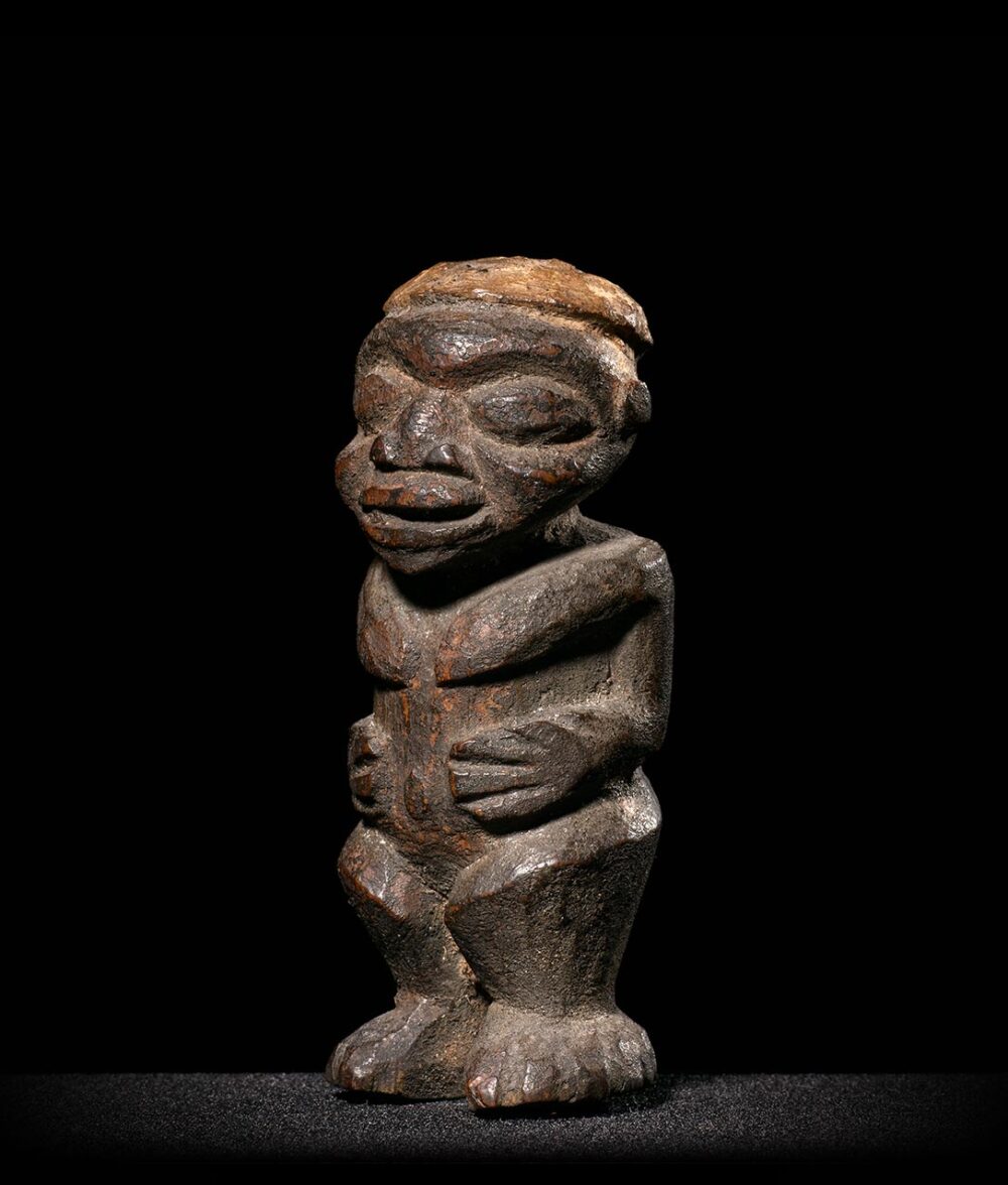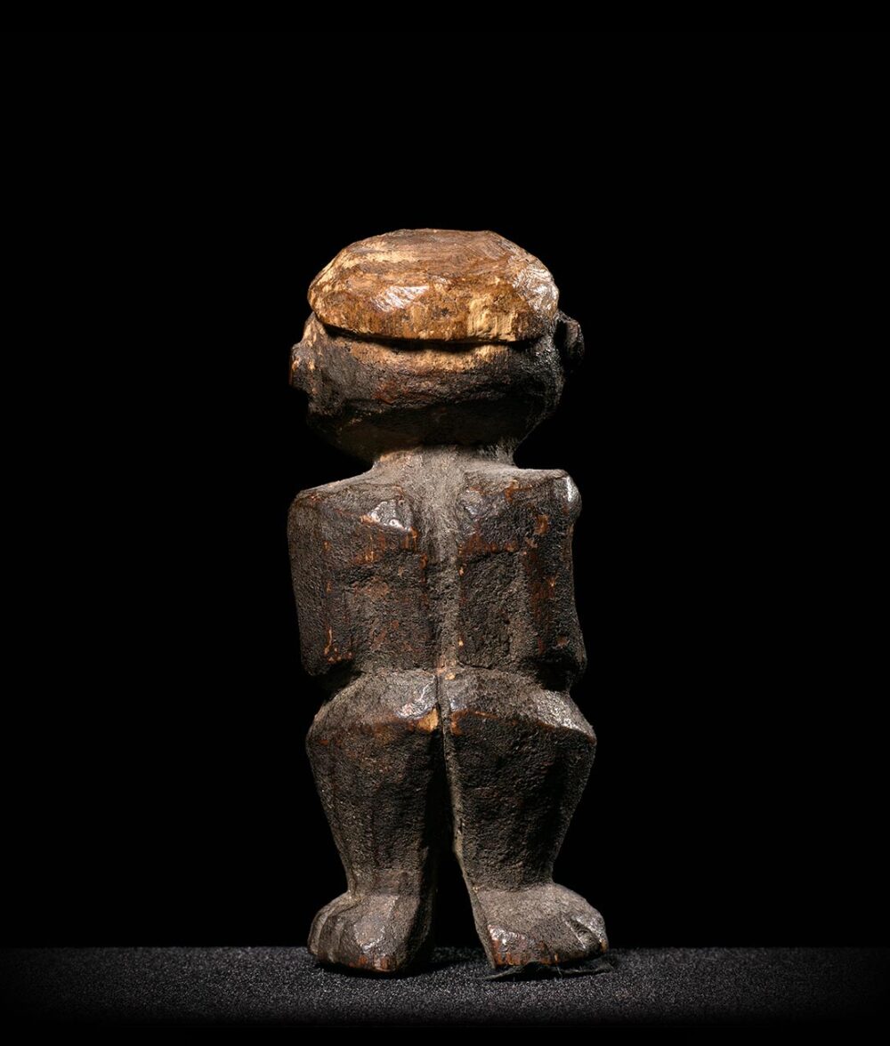 This wooden amulet figure from Cameroon is a wonderful example of African protective charms. With its naturalistic style and intricate details, this small yet powerful figure is a testament to the skill and creativity of the sculptor who carved it. Measuring just a few inches tall, it is a perfect size to be carried on one’s person or kept in a small bag for easy access. The expressive face of the amulet is particularly noteworthy, with carefully carved features that seem to convey a sense of strength and determination. Its compact body is also impressive, with a level of detail that suggests the sculptor was intimately familiar with the human form. The use of a medium density wood has resulted in a dark, rich patina that adds to the sense of history and mystery surrounding this amulet. One made by the same hand can be found in “Wild Spirits Strong Medicine” the exhibition catalog from the Museum of African Art 1990, fig. 116.