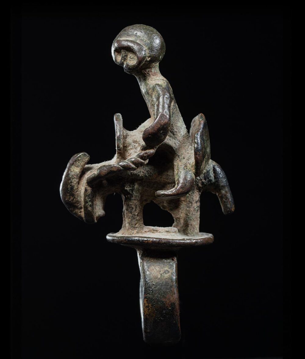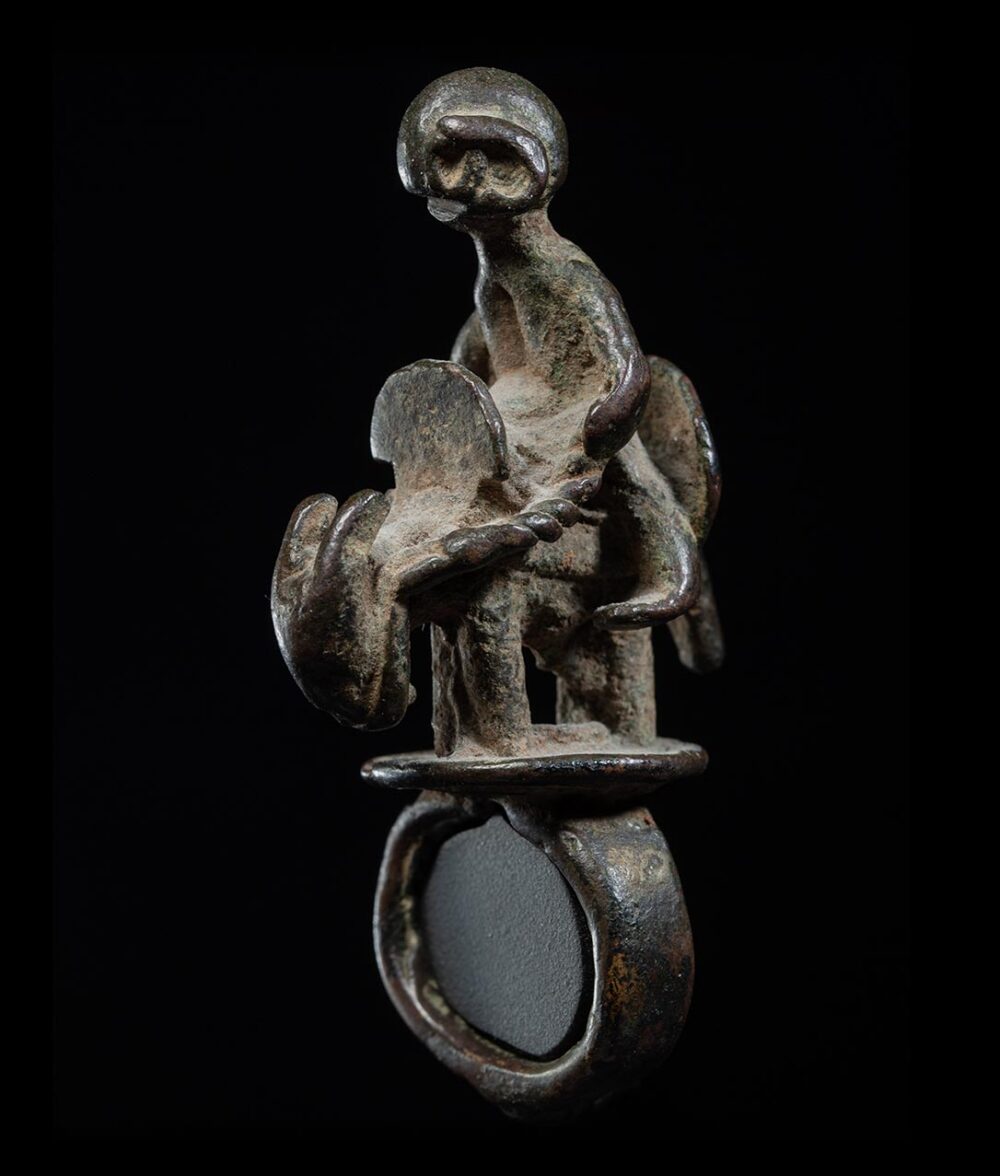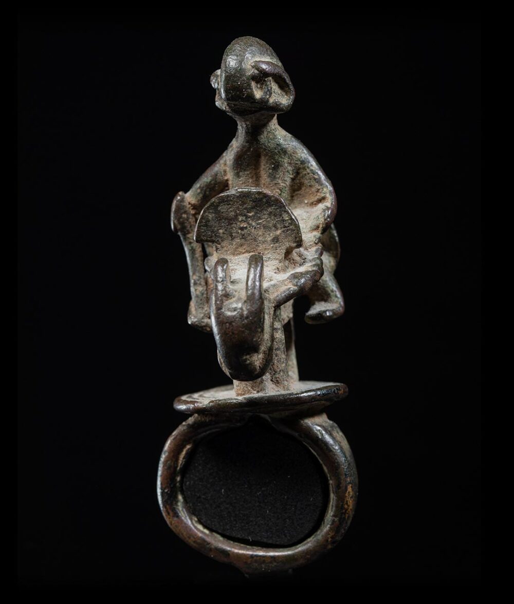 This stunning bronze ring from the Bobo tribe in Burkina Faso is in the form of a horse with a human rider, displaying intricate details that show the skill of the Bobo metalsmiths. The patina on the ring is lovely and bears witness to extensive use, which only adds to its historical and cultural significance.