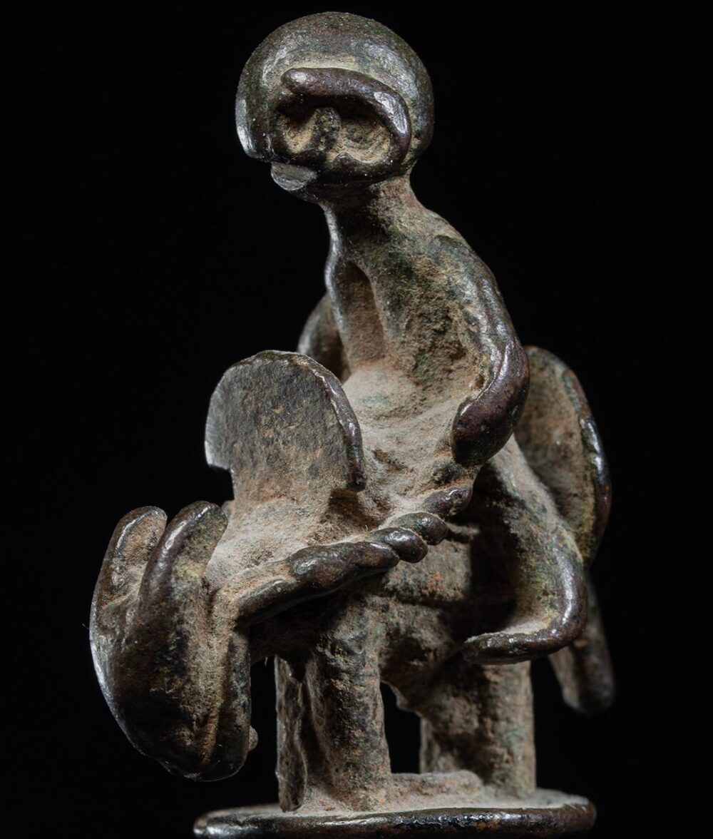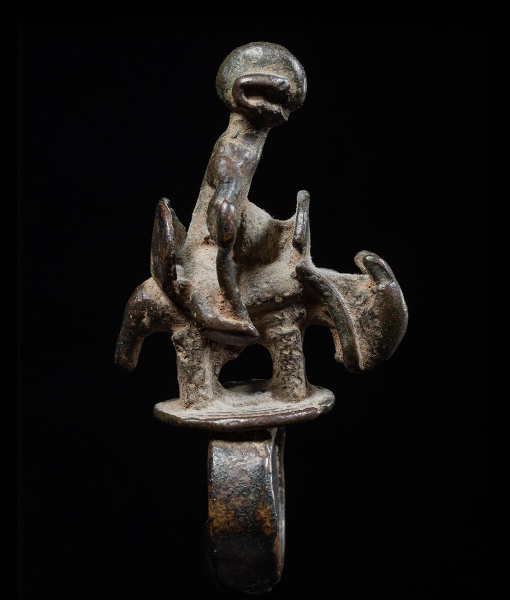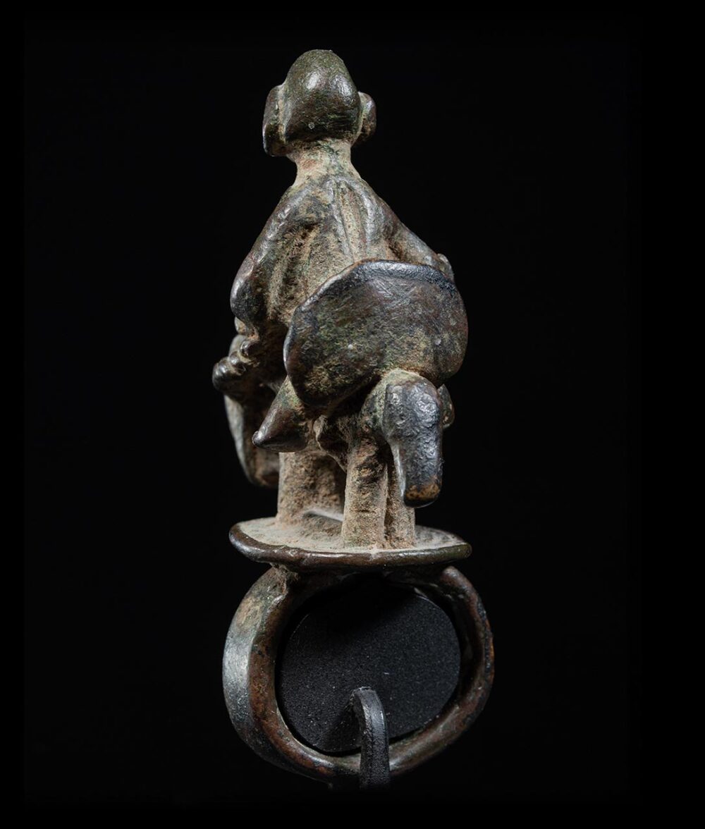 This stunning bronze ring from the Bobo tribe in Burkina Faso is in the form of a horse with a human rider, displaying intricate details that show the skill of the Bobo metalsmiths. The patina on the ring is lovely and bears witness to extensive use, which only adds to its historical and cultural significance.