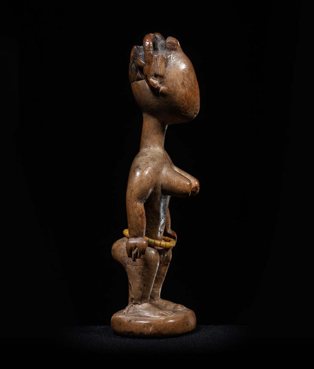 This example is beautifully carved, having an elaborate and detailed coiffure and a well sculpted torso with arms hanging downward and away from its body. The entire figure is well worn and appears to have been intentionally rubbed, especially the face, where the facial features have worn- away from recognition. The worn-away facial features are intentional and are believed to serve as a protective measure. The Ewe believe that facial features of powerful spirits can be dangerous and may cause harm to the living if depicted in their entirety. As a result, the features are either rubbed away or obscured to prevent this from happening.