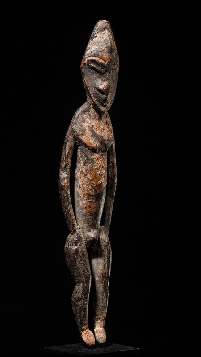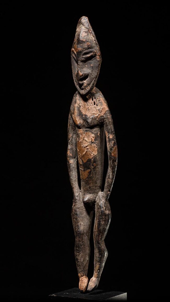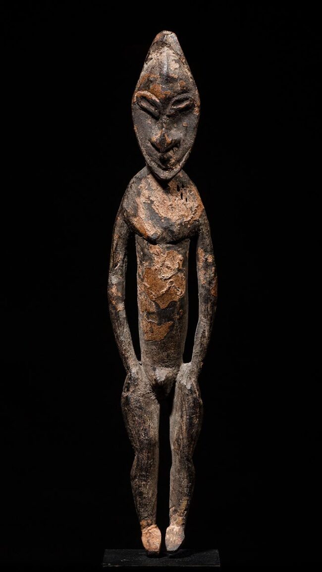 Balanced on slightly bent legs, this figure emanates strength. Its surface is adorned with a richly encrusted patina, untouched by time. A notable feature is its pierced nose, flanked by oval eyes and a grin that’s both intimidating and enigmatic. The original red pigment still clings to much of its surface, enhancing its appeal. Additionally, underneath the base lies an old Sotheby’s New York label.