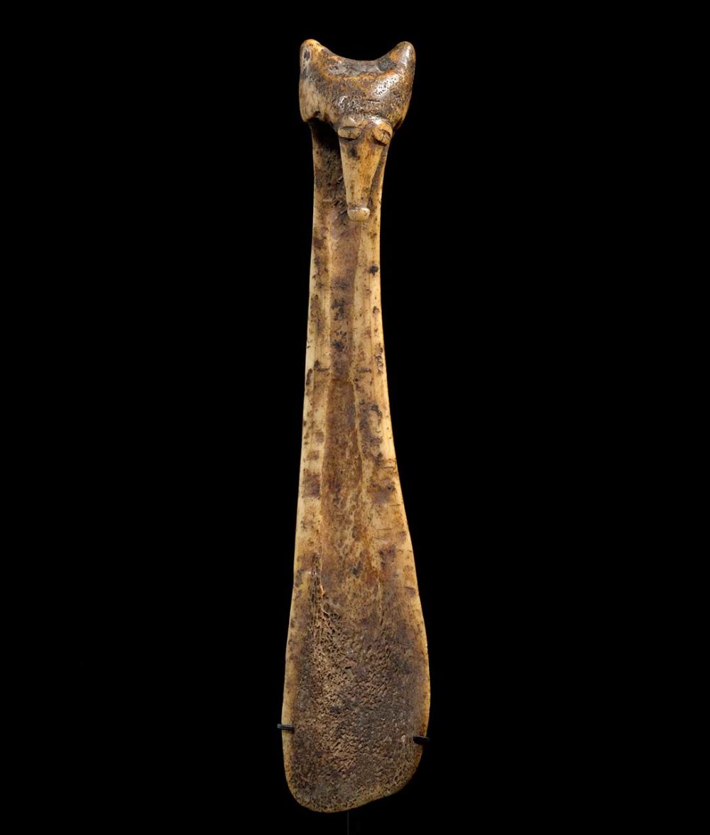 This Banana Scraper from the Azera People in the Morobe Province of the Markham Valley is made of pigs’ bone. The handle of the scrapper is fashioned into the face of a Flying Fox. The face is cut away from the rest of the object and angularly shaped. This is one of the oldest Azera banana scrappers I have come across, in both stylistic terms and surface patina. There is a refined naturalism found only on the most ancient examples.